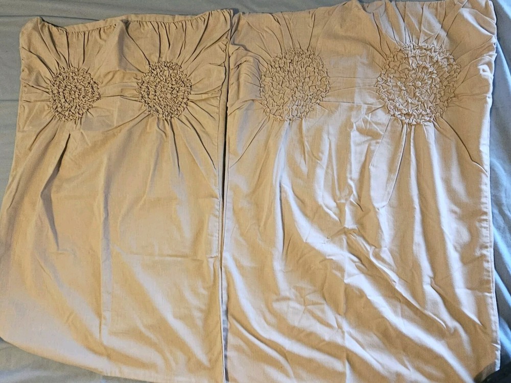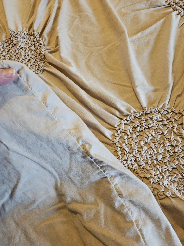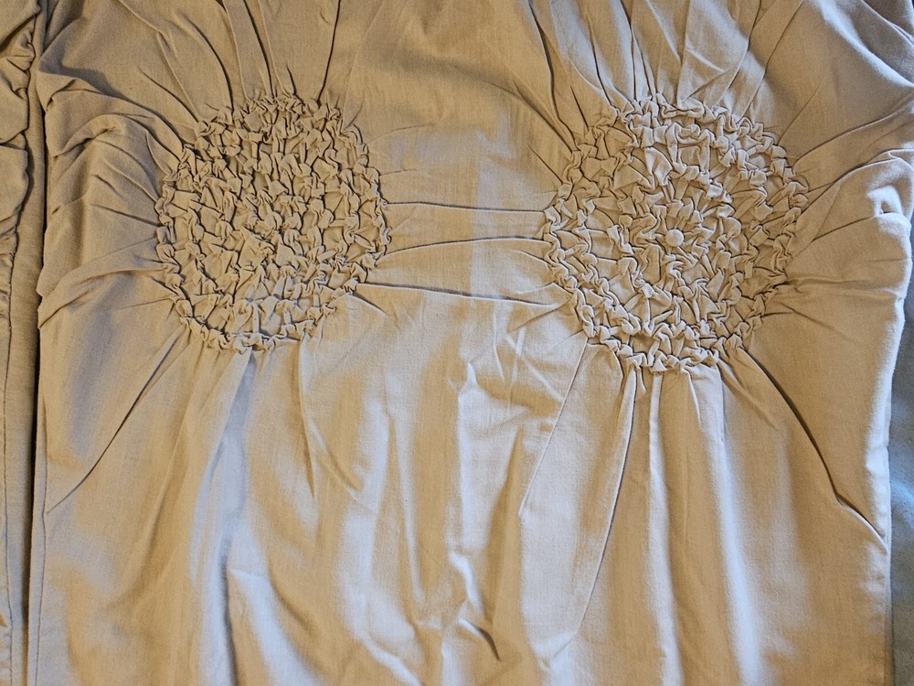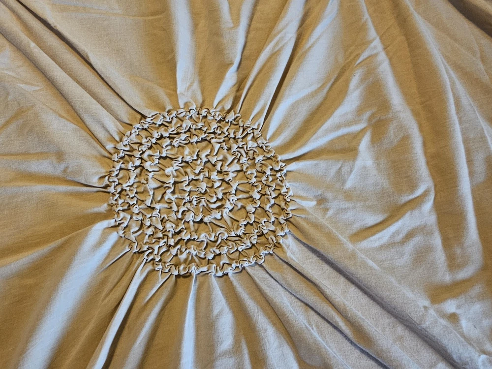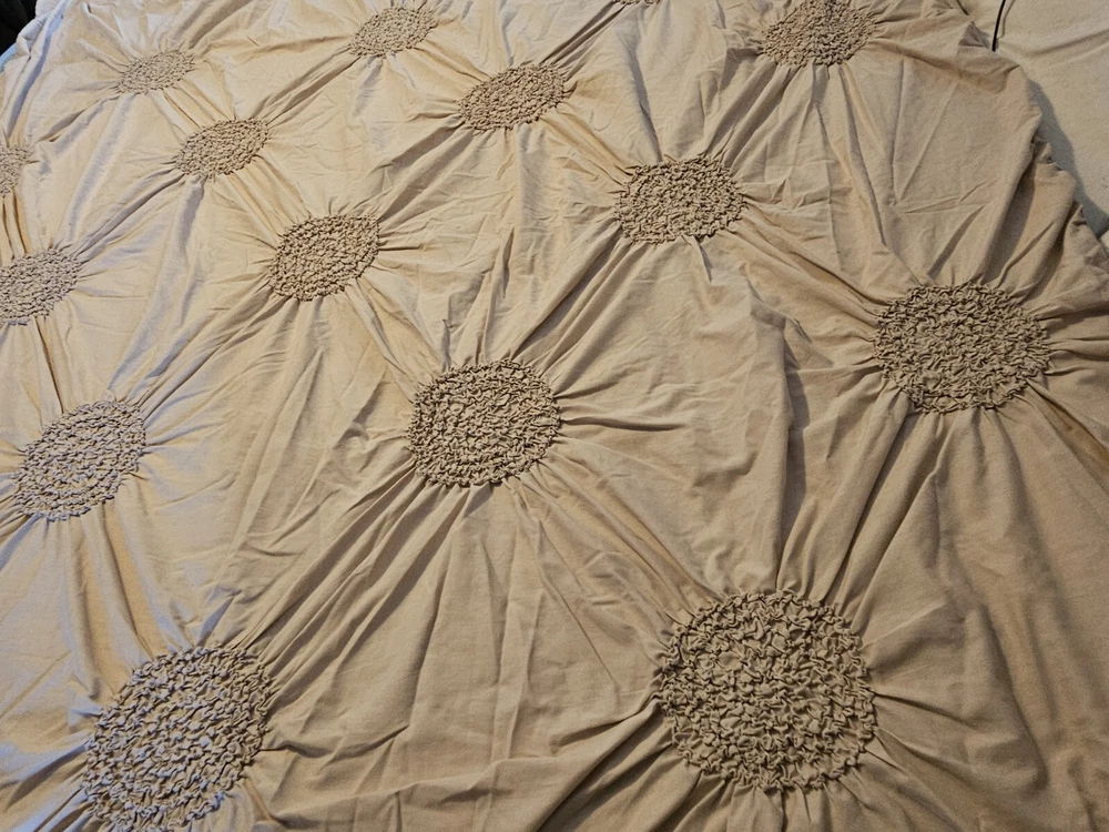 Natural color circle ruched duvet. Full size with 2 shams 80 inch by 78 inches. In very good condition, no flaws noticed. Laundered and clean. Cotton blend, machine washable.