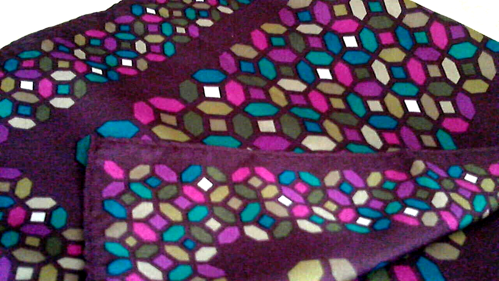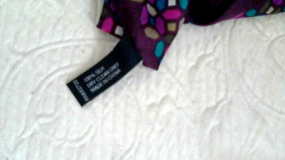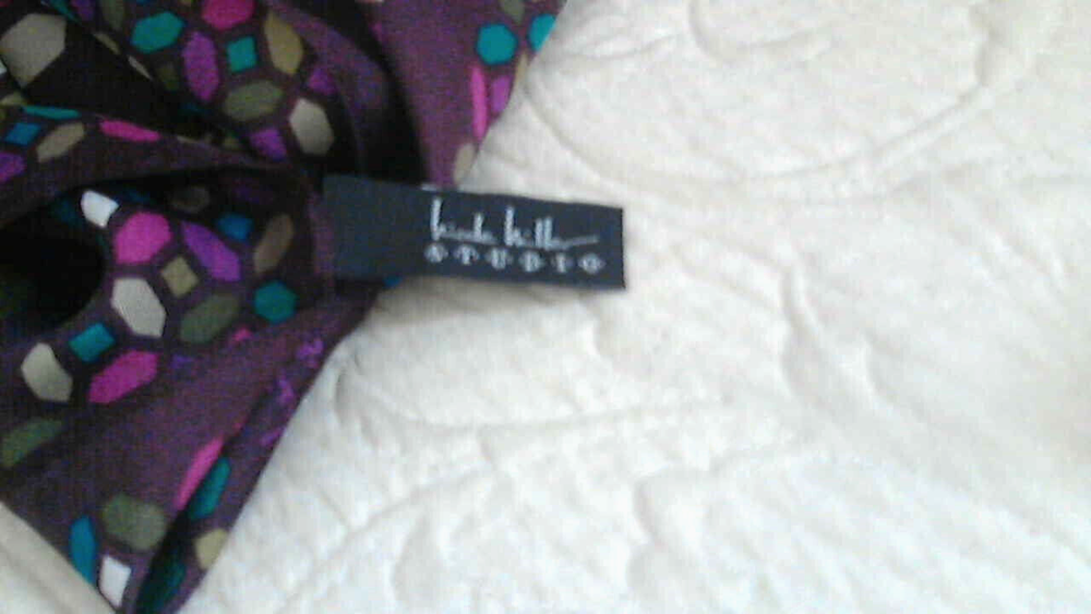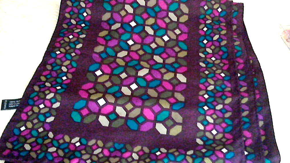 Very nice 100% Silk Scarf by Nicole Miller Studio that measures 11" x 53" and has a nice rolled hem. It also has the tags that indicate 100% Silk, China silk. It is a brownish maroon background with multi color shapes in Lavender, Pink, Turquoise, Beige, Gray, White, and olive green. Very nice and in excellent condition. Weight: 2 oz. USA Seller................... Happy Shopping Always.....................
