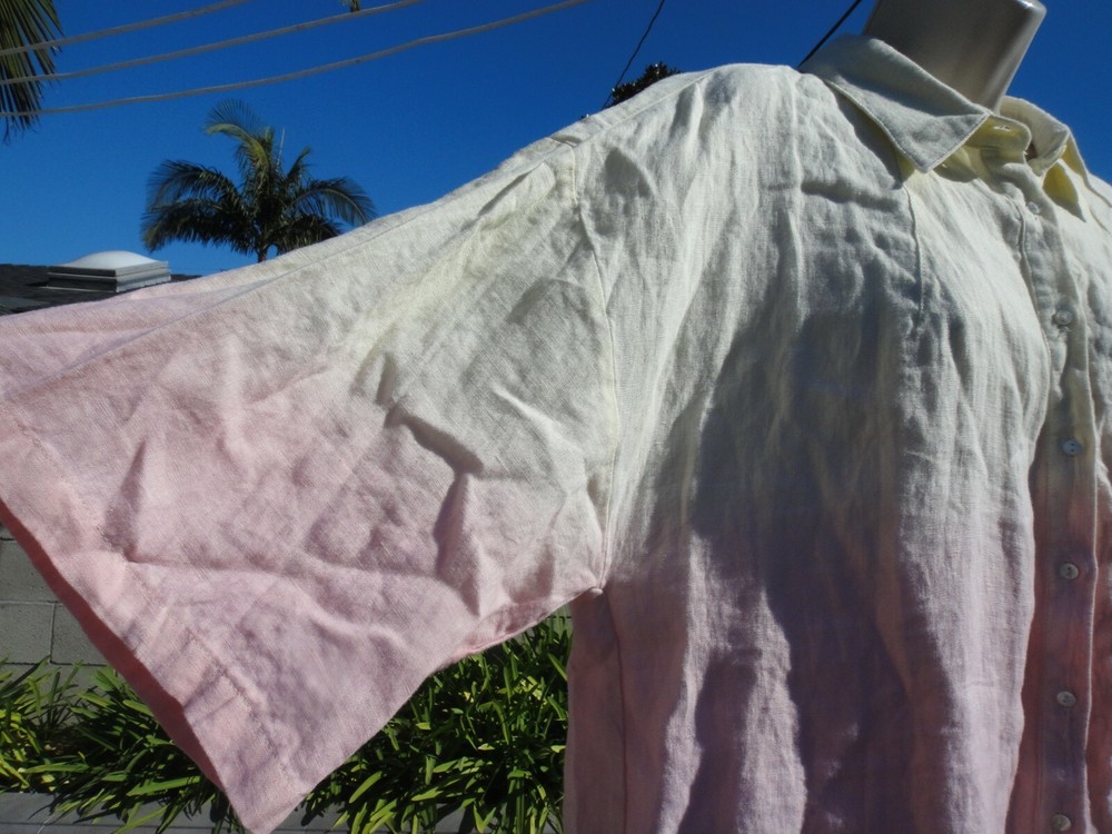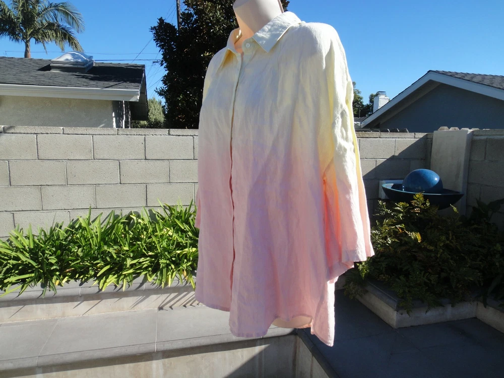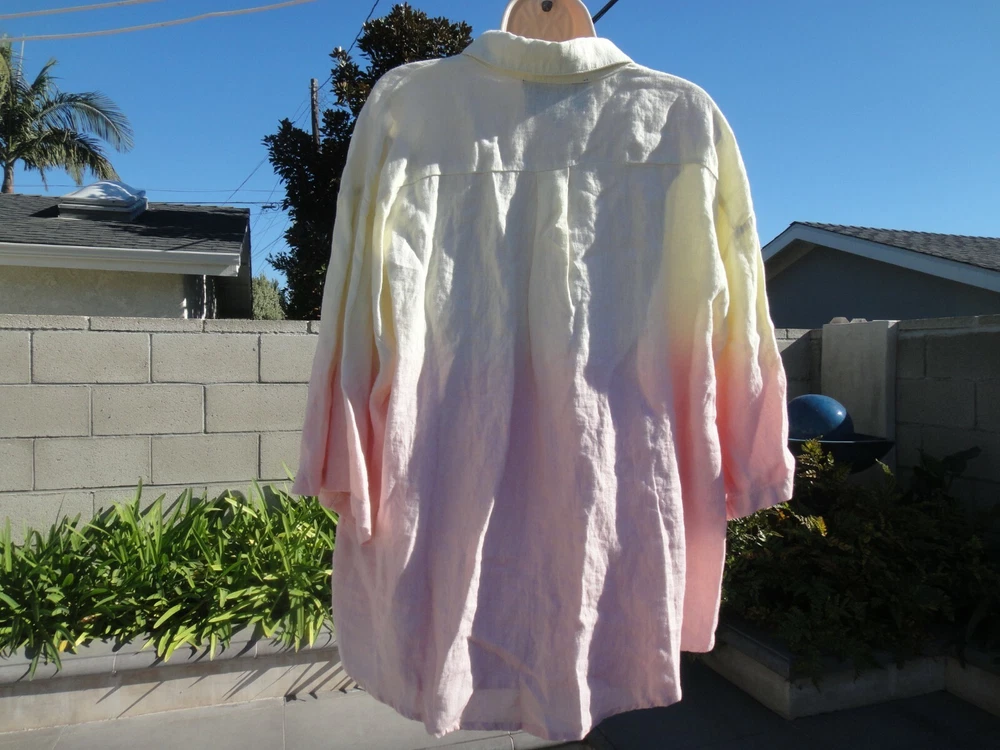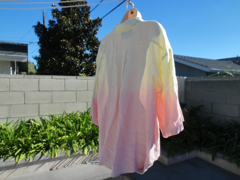 Nicole Miller Collection Oversized Dip Dyed Women's Shirt Size Large MSRP $185 OVERSIZED DIP DYED LINEN SHIRT IS THE PERFECT OMBRE OF PINK AND YELLOW. CRAFTED FROM LIGHTWEIGHT LINEN. FABRIC - 100% LINEN. UNLINED. HAND WASH. DO NOT BLEACH. HANG TO DRY. WARM IRON. OR DRY CLEAN Armpit to armpit across front ~23.5 inches From a smoke free and pet free home.