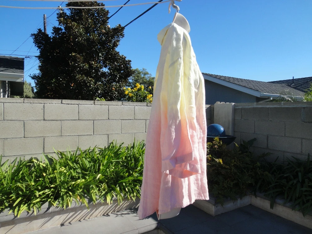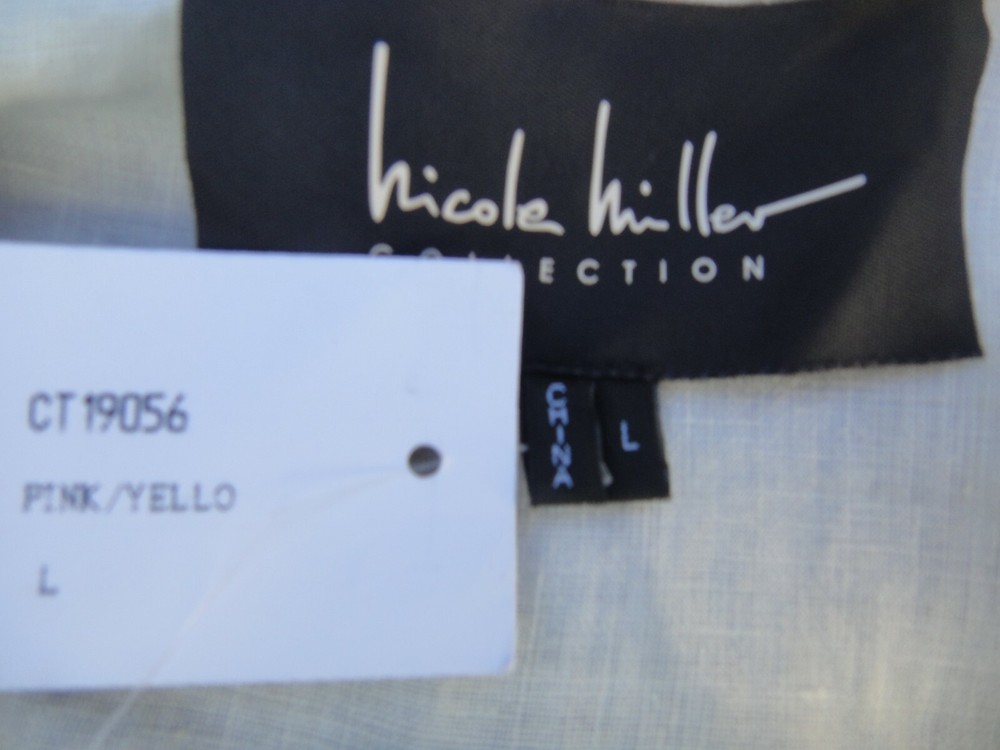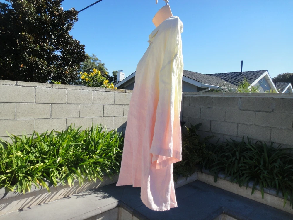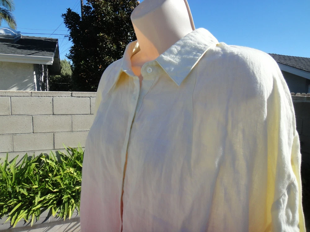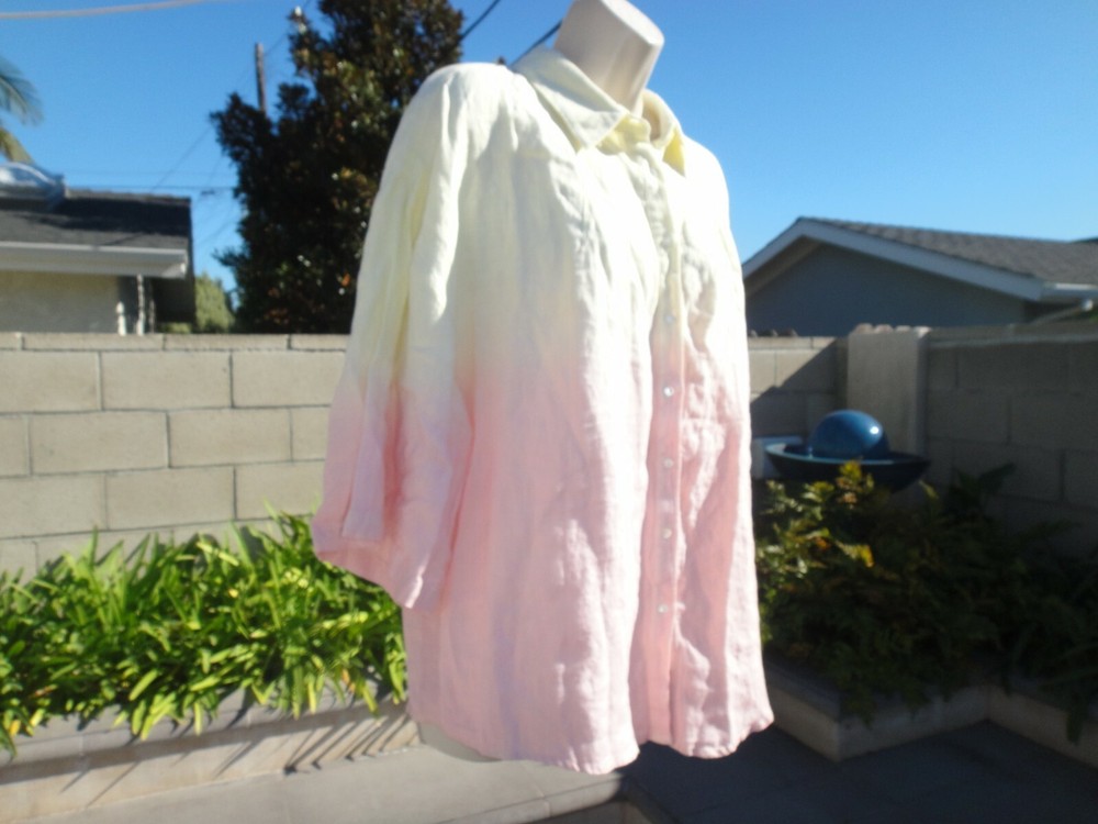 Nicole Miller Collection Oversized Dip Dyed Women's Shirt Size Large MSRP $185 OVERSIZED DIP DYED LINEN SHIRT IS THE PERFECT OMBRE OF PINK AND YELLOW. CRAFTED FROM LIGHTWEIGHT LINEN. FABRIC - 100% LINEN. UNLINED. HAND WASH. DO NOT BLEACH. HANG TO DRY. WARM IRON. OR DRY CLEAN Armpit to armpit across front ~23.5 inches From a smoke free and pet free home.