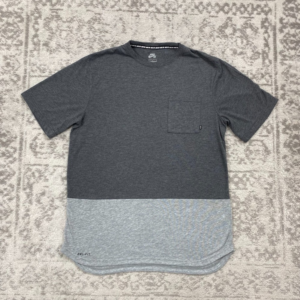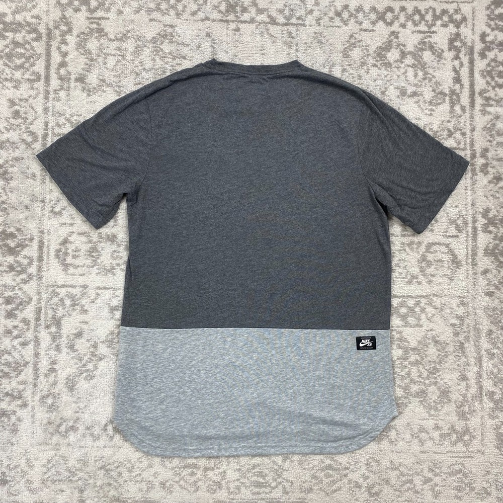 The Nike SB Dri Fit T Shirt for men in Skyline Dip Gray is a stylish and comfortable addition to any wardrobe. This short sleeve tee features a relaxed fit with a classic crew neck design, perfect for everyday wear. Made from a cotton blend material, this shirt is machine washable and showcases the iconic Nike logo as accents. The ombre pattern, along with the skateboarding and sports themes, give this tee a trendy and sporty vibe. Whether you're hitting the skate park or just hanging out with friends, this shirt is a versatile choice for any casual outfit.