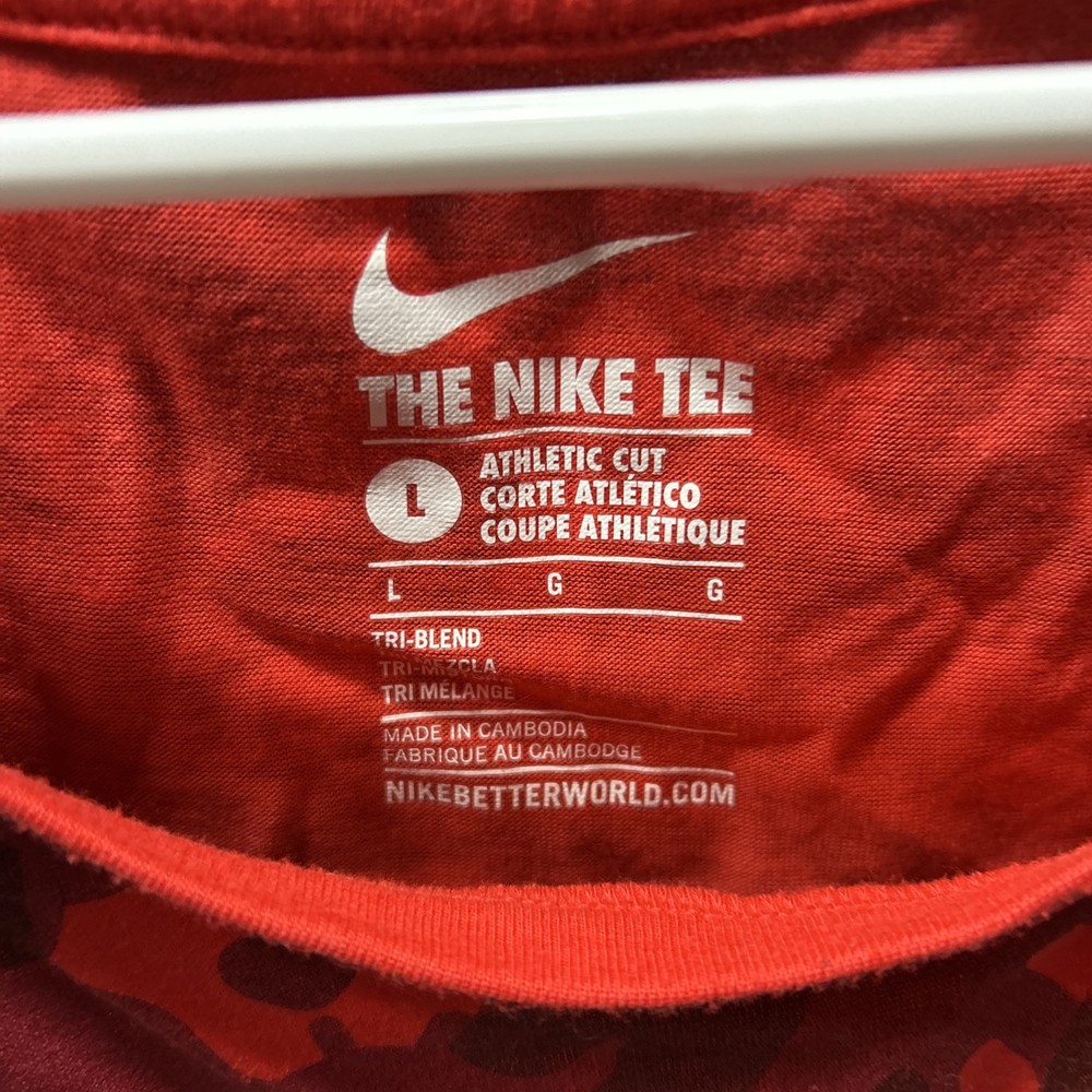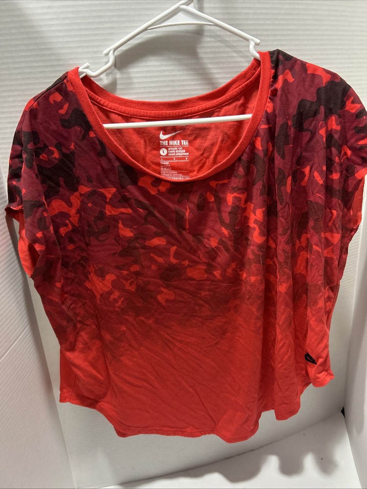 Elevate your activewear with the Nike Signal Dip Dye Camo T-Shirt in a vibrant Red Camo pattern. Designed for women who crave both style and comfort, this size large tank top is a versatile addition to your workout wardrobe. It's suited for a variety of sports including basketball, cycling, fitness and yoga, hiking, and even gymnastics. Crafted for performance, the shirt features a regular fit that allows for freedom of movement, and its quality material promises durability and ease of care. Whether you're hitting the gym or the trails, the Nike Signal tank top blends functionality with the trend-forward camo design, making it a staple for any outdoor or fitness enthusiast.
