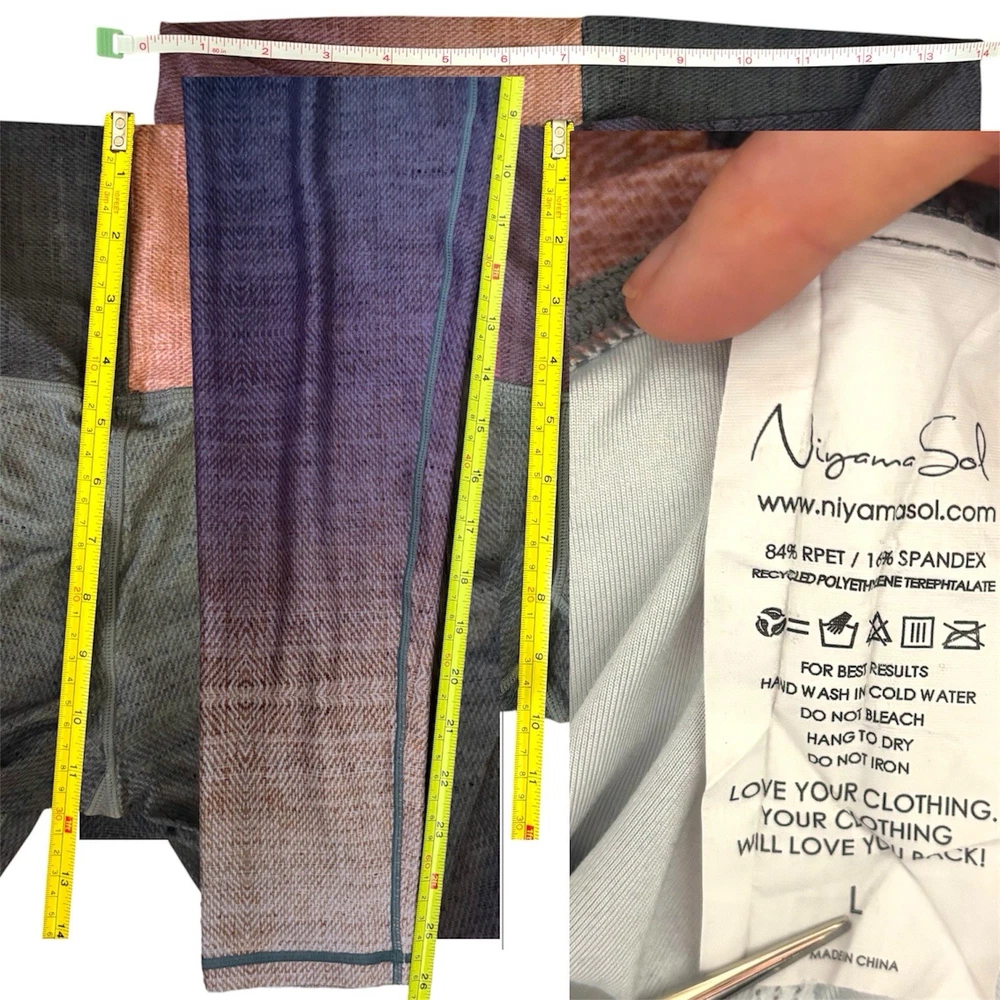 Details: -Niyama Sol Magic Hour Leggings -Dip Dye Ombré Gradient Color Design from Purple, Gray to Peach -High Performance, Tummy Tucking Band w/ 4-Way Stretch -Quick Drying, Moisture-Wicking, Anti-Bacterial, Buttery Smooth Fabric -Excellent Condition Size: Large *(Please Refer to Measurements Listed Below for Accurate Fit)* Approximate Flat Measurements w/out Stretching Fabric: Waist: 14” Front Rise: 9” Back Rise: 11” Inseam: 26” Material Composition: 84% RPET, 16% Spandex *Colors May Vary Slightly* Daily Shipper, Packaged w/ Care Washed w/ Scent-Free Detergent Smoke-Free Home Bundle for Discount Keywords: Whimsigoth, Whimsygoth, Boho, Hippie, Bohemian, Lounge, Casual, Yoga, Lifting, Bodybuilding, CrossFit, Gym, Training, Athleisure, Workout, Gymwear, Activewear