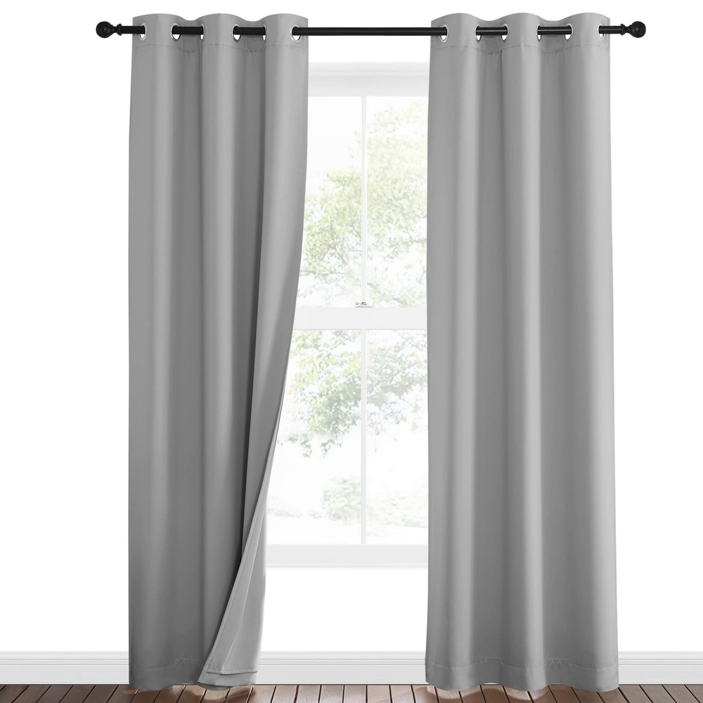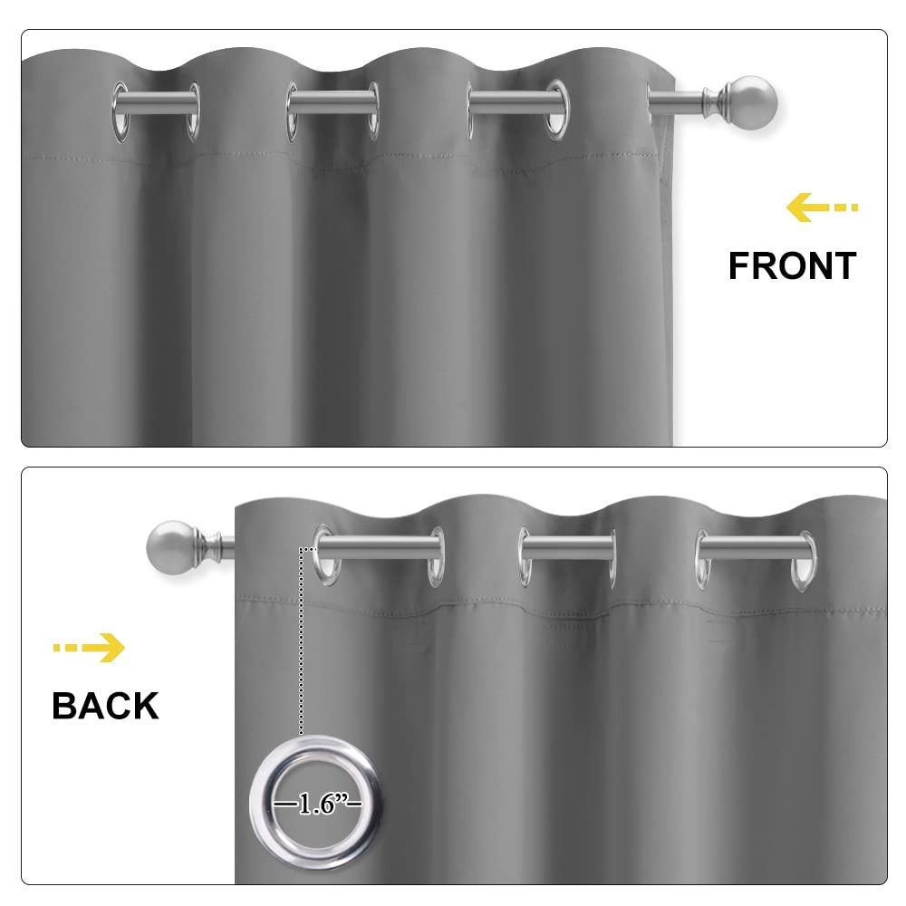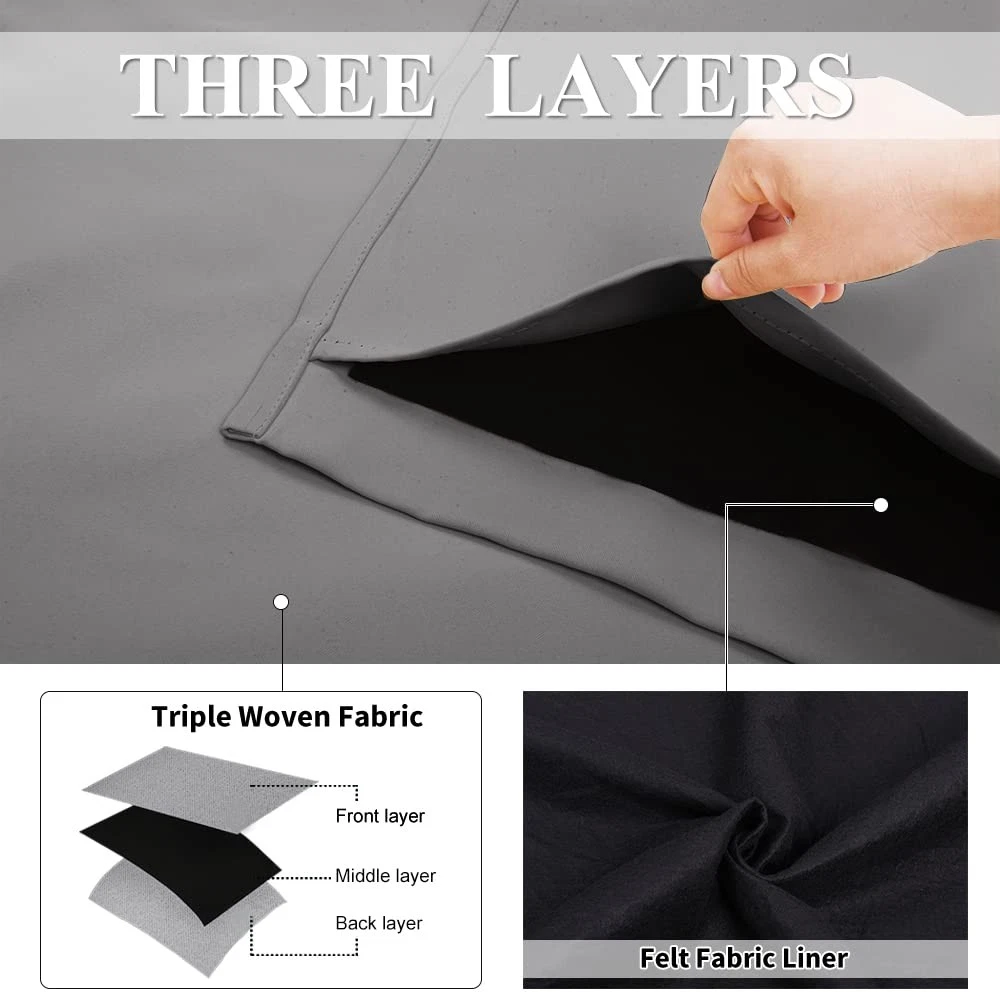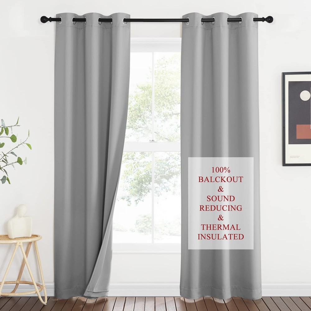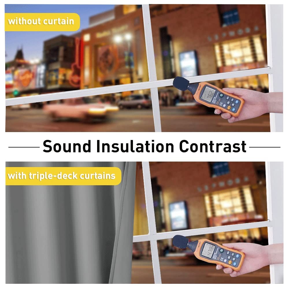 No matter where you live, California, Texas or even Florida, if you have the annoying sunshine of torture and street noise, and need a completely dark and quiet sleep environment, you can choose our 3-in-1 blackout curtains with noise absorbing liner. Different from other regular one layer blackout curtains, Thermal Insulated Blackout Lined Curtains go beyond that mundane function and provide the best benefits. FIT NICELY: Package includes 2 panels blackout curtains. 1.6" Grommet fits various standard or decorative curtain rod/pole. Due to grommet design, remember they narrow when you put them on a pole. Become shorter because of sewn into a 3-inch header with grommets. Particularly suitable: living room, kitchen, bedroom, baby room, villa, hall, and department, etc. MULTIFUNCTION: Draperies are thick enough to block out unwanted light completely and reduce some noise, encouraging day sleepers and the ones who have trouble falling asleep have a good sleep. The detachable felt fabric liner is in the middle of the 3 layers. Maximum absorb the annoying noise and create a peaceful environment. Not only that but also make your resting zone truly blissful. They would be perfect for any home theater and supply you with the enjoyment of watching TV in real darkness. The sophisticated designs allow you to brighten your home decor, making your living space more lively. Protect your furniture, floors, and artwork from the ravages of the sun. Lined Grommet Curtains have kept the room much warmer in winter and also block a lot of heat during summer, relieving the strain on home heating and cooling while reducing energy budget. READY MADE: 2 panels per package. Each Curtain with 1.6" diameter rings measures 42" wide x 84" long (Total width of 2 panels is 84"). 3 layers together: both sides as front and back are grey & 1 detachable felt fabric lining in the middle. NOISE REDUCING: Detachable felt fabric liner in the middle which makes the effect of absorbing sound is 2.5 times higher than the ordinary curtains. So that minimize the effect of noise on you at any time. But these curtains are not noise cancelling, but noise reducing. The more folds the better the noise dampening. 100% BLACKOUT: Curtains are made with 2 layers triple weave fabric and 1 layer detachable felt fabric liner. Thick enough to completely keep out the 100% SUNLIGHT and UV RAY. Offering you a real dark environment, a great choice for any room you would like to turn day into night. THERMAL INSULATION: 3-in-1 curtains can balance room temperature by insulating against summer HEAT and winter CHILL meanwhile protect PRIVACY. Help you to reduce energy costs. Tips: You will need a rod that is strong with a center support to support the heavy curtains. EASY CARE: Good quality finishing will withstand years of use. Detach the felt liner before machine wash. Machine washable and Wash the water temperature below 86℉. Mild detergent no bleaching. Low-temperature ironing.