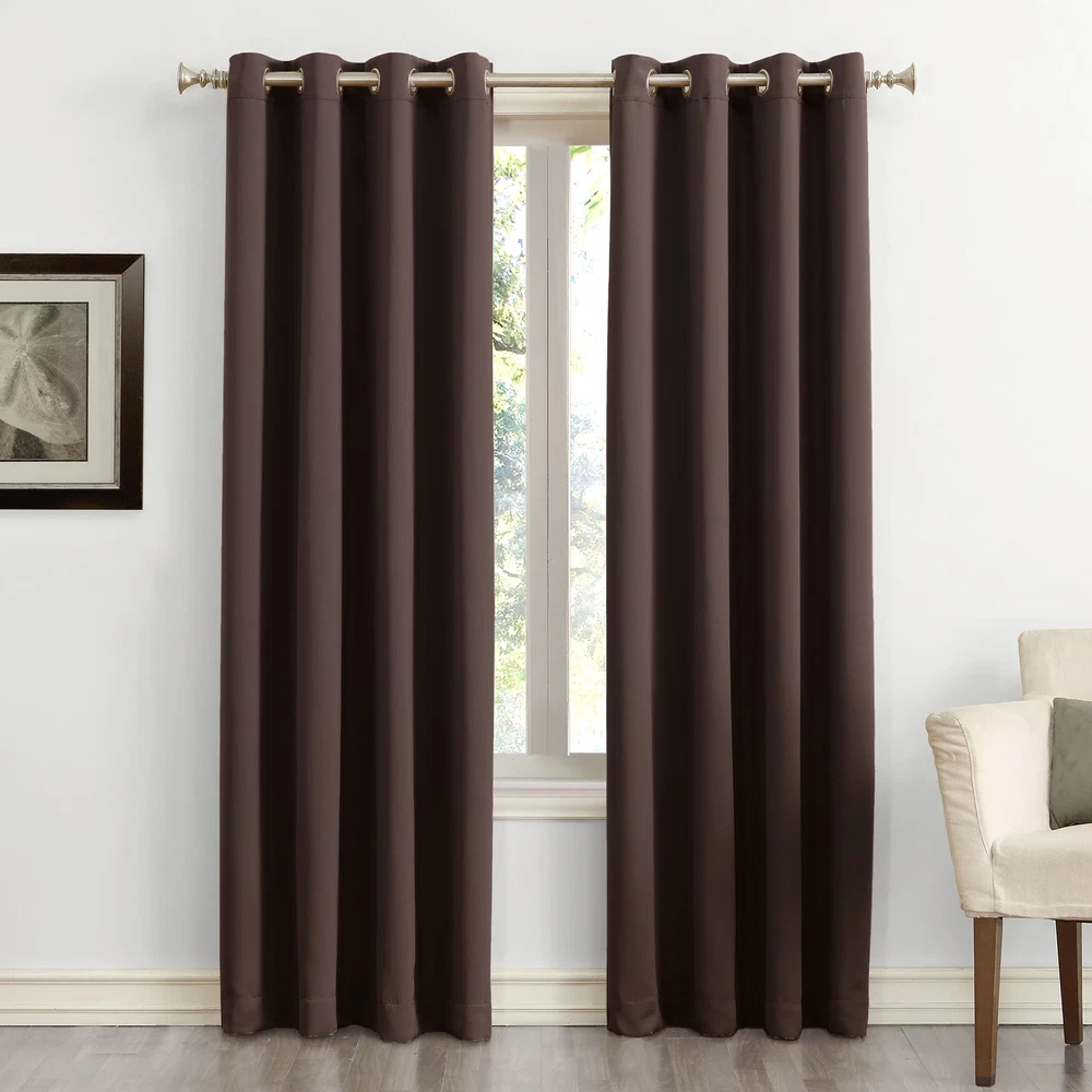 Sun Zero Nolan Curtain Panel in chocolates infuse a modern sophistication into any living space. Equipped with built-in metal grommets for easy hanging on standard curtain rods up to 1.5" in diameter. Sun Zero Blackout technology blocks out most outside light, offers outside noise reduction by up to 25%, and decreases energy lost through your windows by up to 25%. Comfort is optimized with thermal properties that help keep summer heat and winter chill out of your home. Hang in your living room for enhanced privacy, or in your bedroom for a sounder, more uninterrupted sleep. Sold as individual panels measuring 54" width by 84" length. Measure carefully before selecting your desired size and quantity. Machine wash cold on gentle cycle. Use non-chlorine bleach when needed. Tumble dry on low heat, using a cool iron as needed. Blackout technology blocks out most unwanted light while enhancing privacy Energy efficient design reduces energy lost through your windows by up to 25 percent Thermal properties help keep summer heat and winter chill out of your home Noise reduction up to 25 percent helps you get a sounder, more uninterrupted sleep Built-in metal grommets fit curtain rods up to 1.5" in diameter Each panel sold separately. (Image features 2 panels) Curtain rod not included. Double rod may be needed for layering.