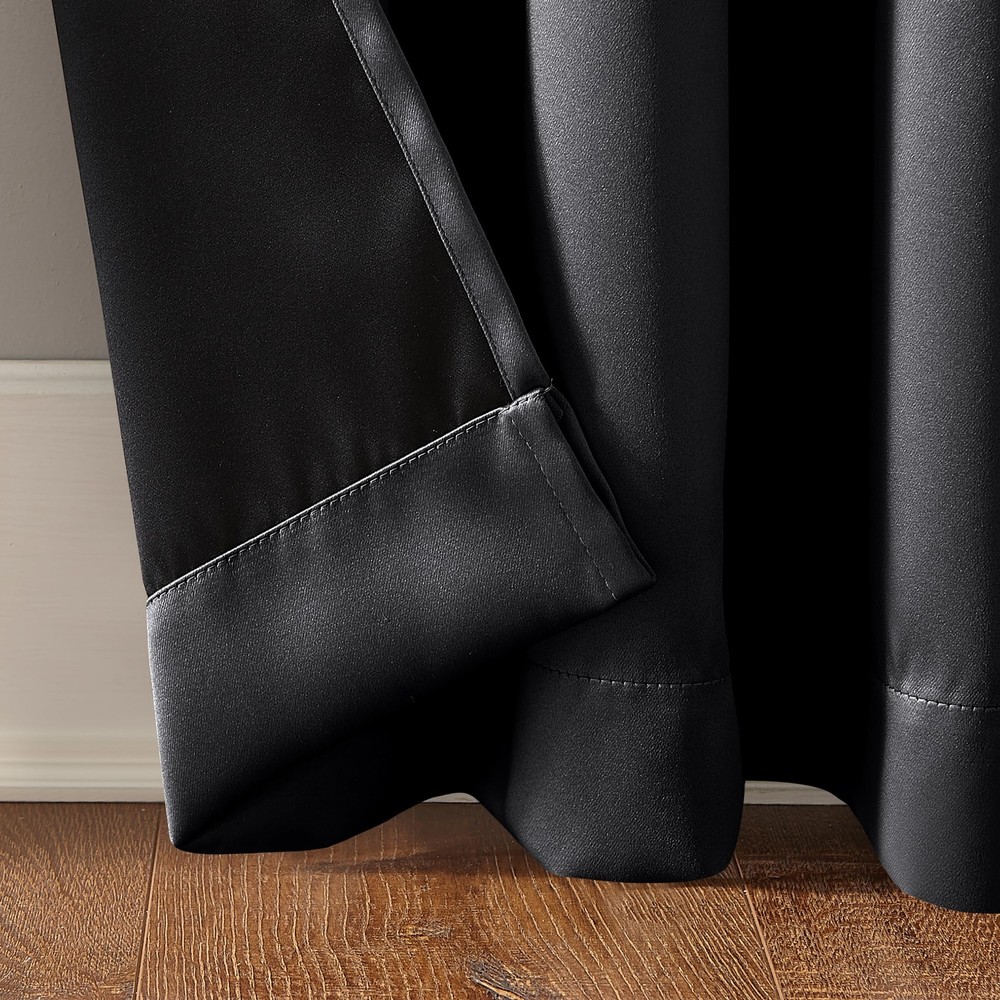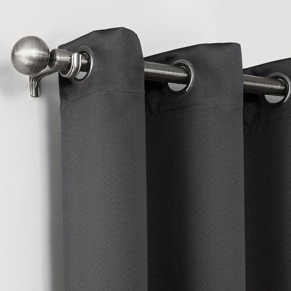 Nordic Theater Grade Noise Reducing Extreme 100% Blackout Grommet Curtain Panel Pairs provide the in light blocking technology to keep out even the harshest of light while bringing an elegant urban sophistication to any room of your home. Extreme Blackout technology is laboratory tested to block out 100% of light, reduce outside noise by up to 45%, and decrease energy lost through your windows by up to 50%. Comfort is optimized with thermal properties that help keep summer heat and winter chill out of your home. Built-in metal grommets allow for easy slide-through installation on curtain rods up to 1.5" in diameter. Hang in your entertainment room to eliminate screen glare and reduce distracting outside noise, or in your bedroom for enhanced privacy and a sounder, more uninterrupted sleep. Pair includes 2 panels, each measuring 52" width by 54" length. Measure carefully before selecting your desired size and quantity. Rod not included. Machine wash cold on gentle cycle. Use non-chlorine bleach when needed. Tumble dry on low heat, using a cool iron as needed. Extreme Blackout technology blocks out 100% of outside light Energy Efficient design reduces energy lost through your windows by up to 50% Thermal properties help keep summer heat and winter chill out of your home Noise reduction by up to 45% helps you get a sounder, more uninterrupted sleep Includes 2 grommet curtain panel made from machine washable material Pair includes 2 panels