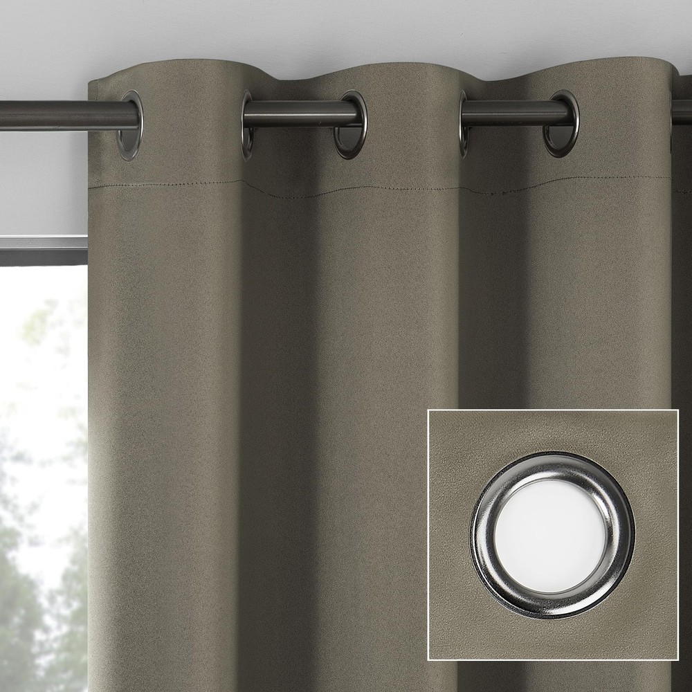 Nordic Theater Noise Reducing Extreme 100% Blackout Grommet Curtain Panel Pairs provide the ultimate in light blocking technology to keep out even the harshest of light while bringing an elegant urban sophistication to any room of your home. Extreme Blackout technology is laboratory tested to block out 100% of light, reduce outside noise by up to 45%, and decrease energy lost through your windows by up to 50%. Comfort is optimized with thermal properties that help keep summer heat and winter chill out of your home. Built-in metal grommets allow for easy slide-through installation on curtain rods up to 1.5" in diameter. Hang in your entertainment room to eliminate screen glare and reduce distracting outside noise, or in your bedroom for enhanced privacy and a sounder, more uninterrupted sleep. Pair includes 2 panels, each measuring 52" width by 54" length. Measure carefully before selecting your desired size and quantity. Rod not included. Machine wash cold on gentle cycle. Use non-chlorine bleach when needed. Tumble dry on low heat, using a cool iron as needed. Extreme Blackout technology blocks out 100% of outside light Energy Efficient design reduces energy lost through your windows by up to 50% Thermal properties help keep summer heat and winter chill out of your home Noise reduction by up to 45% helps you get a sounder, more uninterrupted sleep Includes 2 grommet curtain panel made from machine washable material Pair includes 2 panels