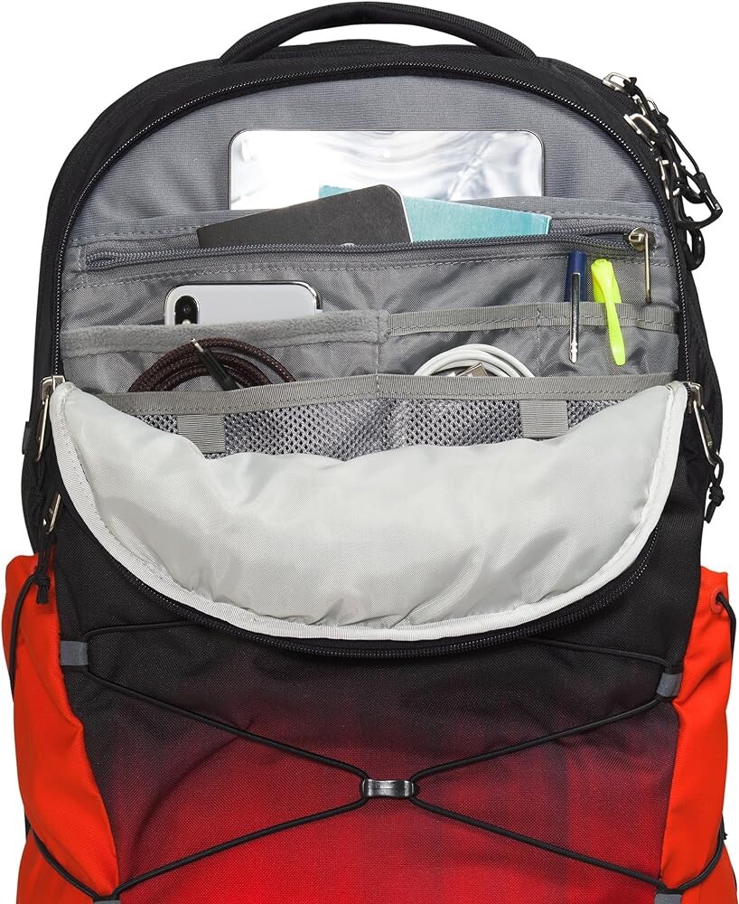 This spacious backpack from The North Face is perfect for backpacking and hiking. With a capacity of 28L, it has enough space to store all your essentials for your outdoor adventure. The backpack features a laptop compartment and 5 pockets for easy organization of your belongings. It has a zip closure, and the material used in its construction is a combination of polyester and nylon. The backpack is in a fiery red dip dye large print with a TNF black color, adding a stylish touch to your look. This unisex backpack has a model name Borealis, and it is made in Vietnam.