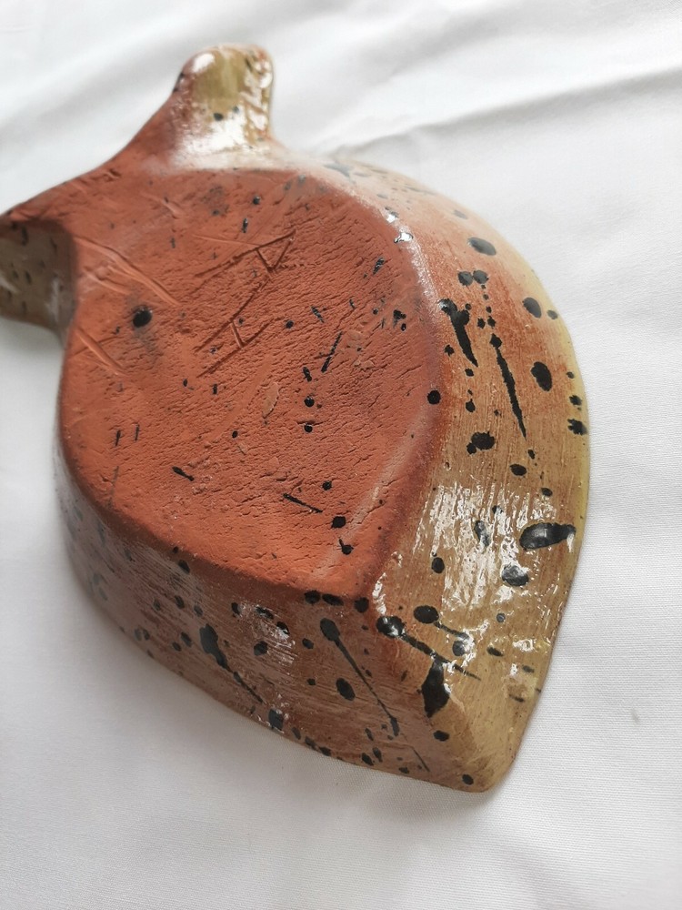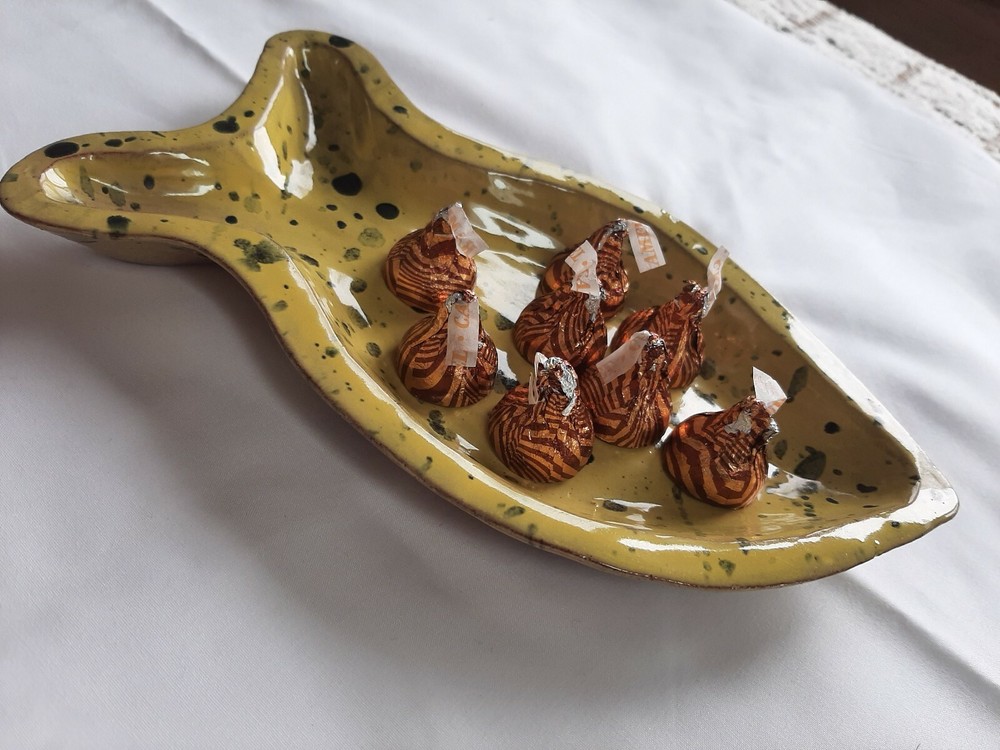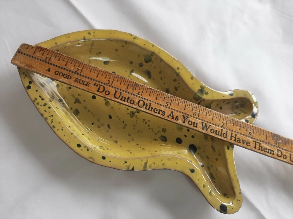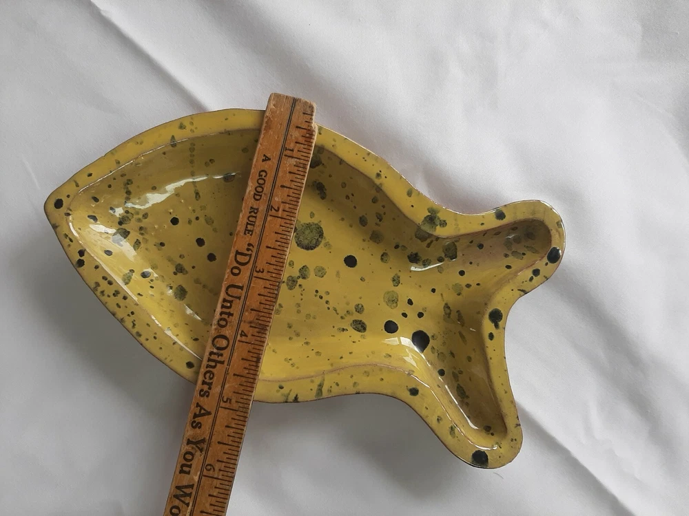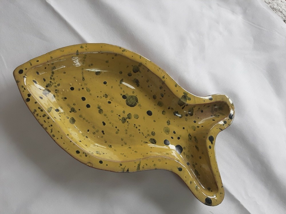 Studio Art FISH shaped DISH yellow, black spotted, signed AH, 8". This whimsical little fish would make a novel wall display piece, serving dish, or trinket dish. This pottery dish is in very good condition with no chips or cracks or crazing. Please see all photos. Condition is Used. This item is being offered with one day handling. If you are not completely satisfied that this item is as described, you may return it within 30 days of delivery. Buyer pays return shipping and handling costs. Shipped with USPS Ground Advantage