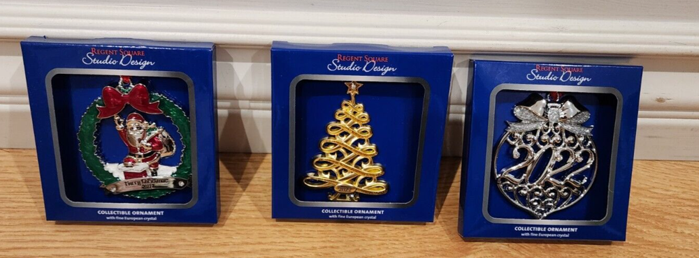 NEW REGENT SQUARE STUDIO DESIGN COLLECTIBLE ORNAMENTS WITH FINE EUROPEAN CRYSTAL 2022. SET OF 3 ORNAMENTS. See pictures