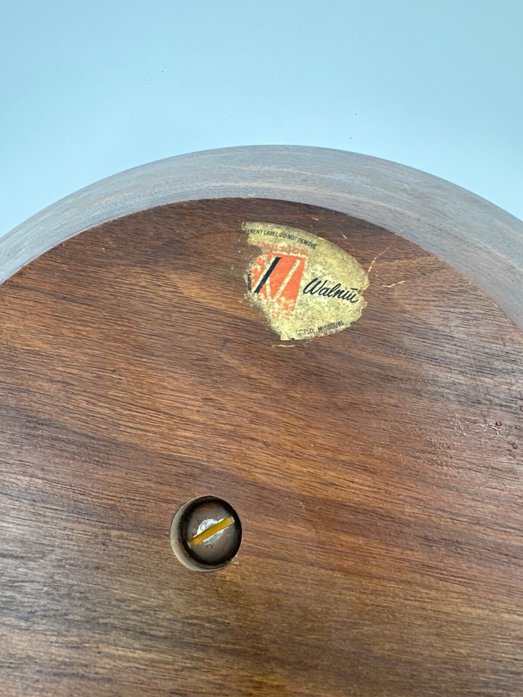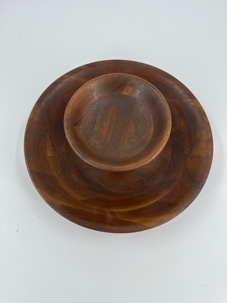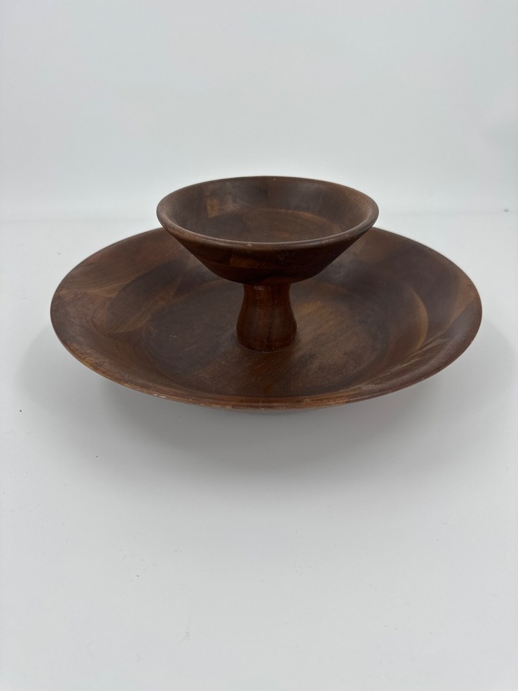 This Ozark Walnutware serving bowl is a two-tiered chip and dip set made from walnut wood with a glossy finish. The large bowl is 12" in diameter, while the small bowl is 6" in diameter. It has a mid-century modern style and is from the mid-20th century. The brand is Ozark Walnutware - Native Wood Products, Inc., and it is designed for contemporary and classic themes. Hand wash only. Made in the United States.