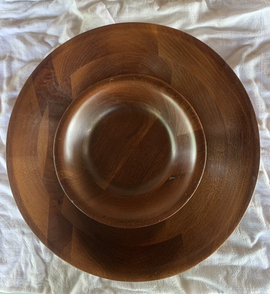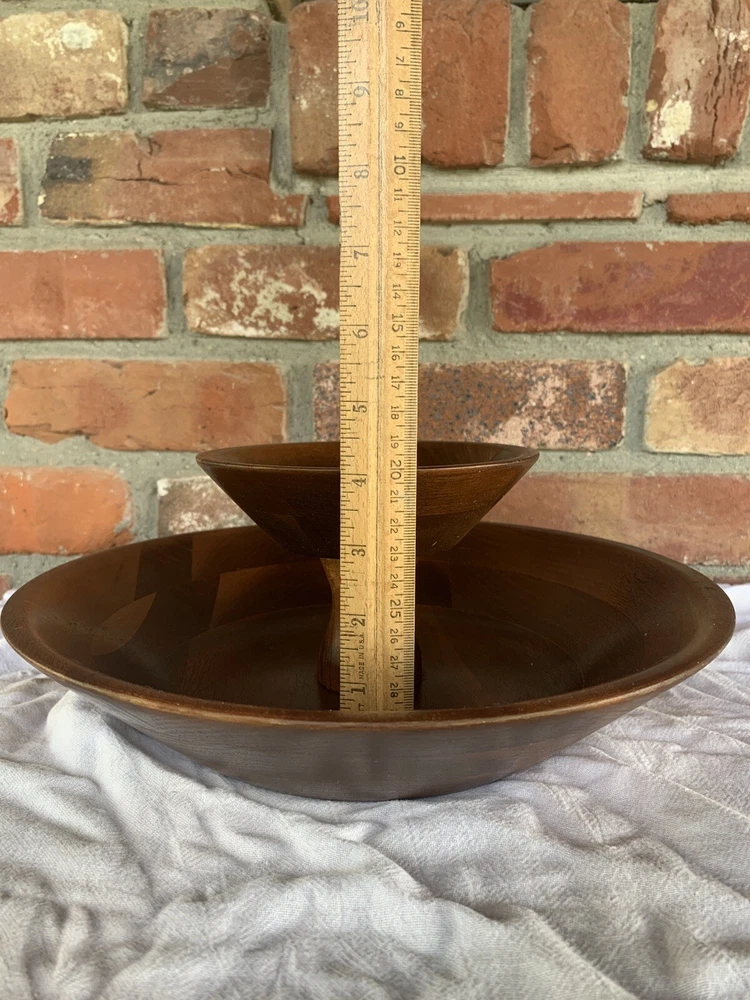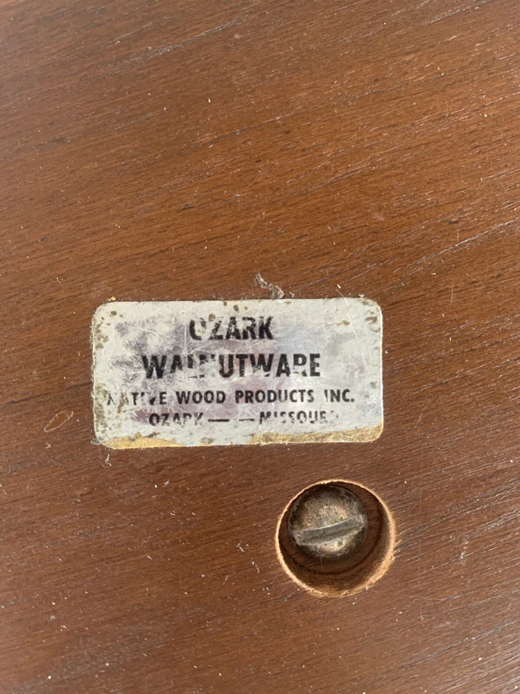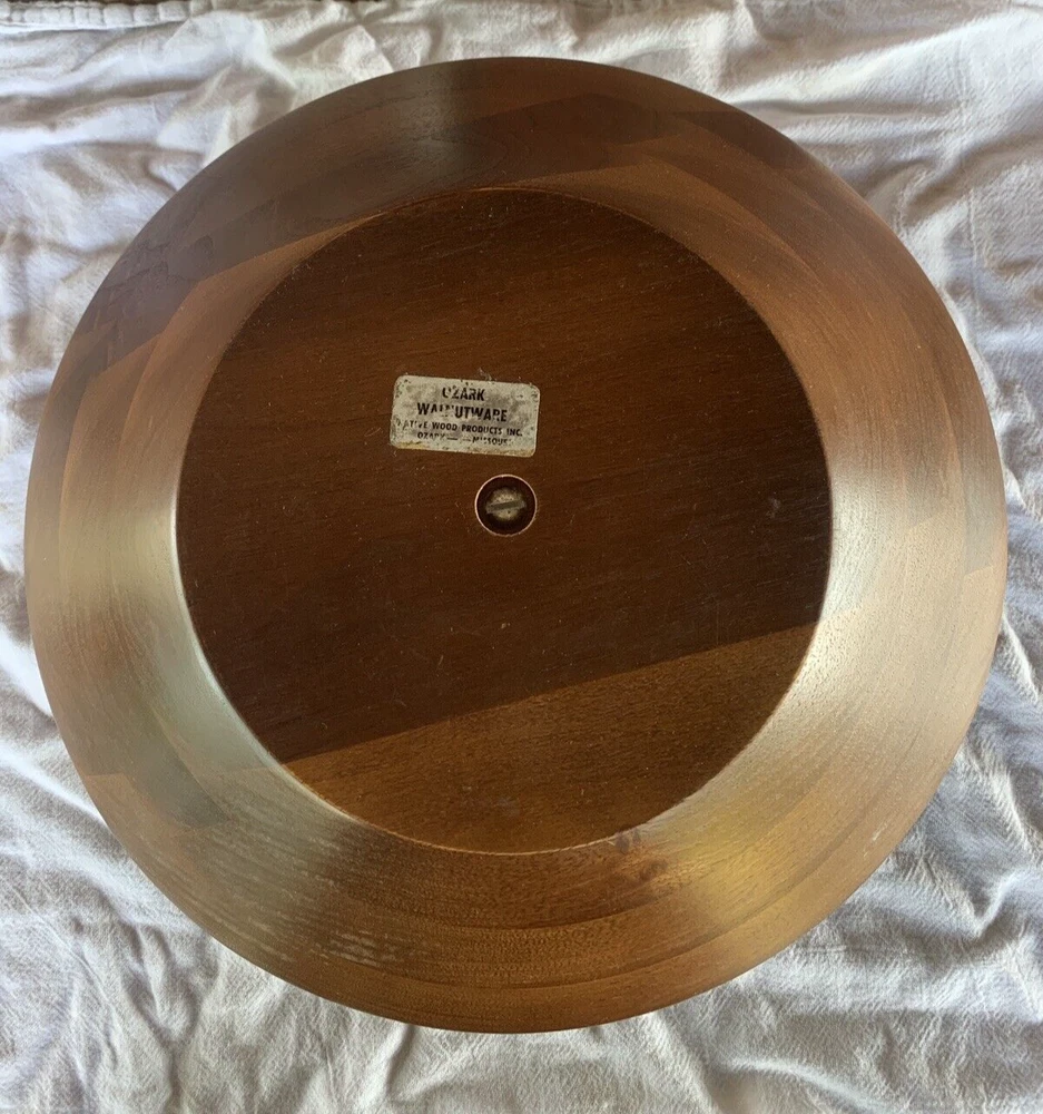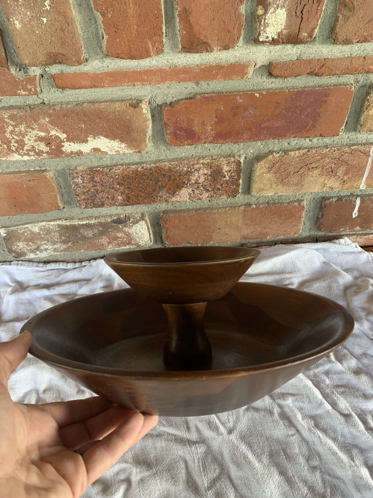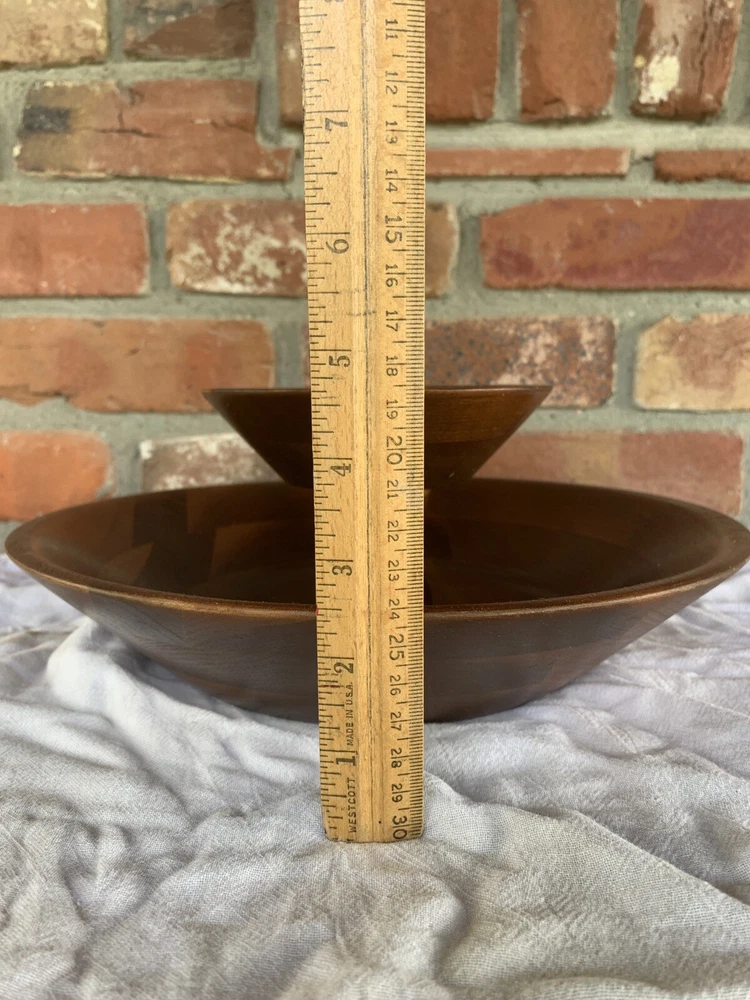 ~ I am pleased to offer this Two Tier OZARK WALNUTWARE Bowl ~ Condition: Crafted in the Ozarks of Missouri, this bowl is in very good vintage condition. The wood has been re-conditioned with oil, holds a beautiful shine and has very little wear use noted. Rims of the bowls have very minimal surface scratches. Original label is attached on bottom. A very nice serving piece to use or for display.