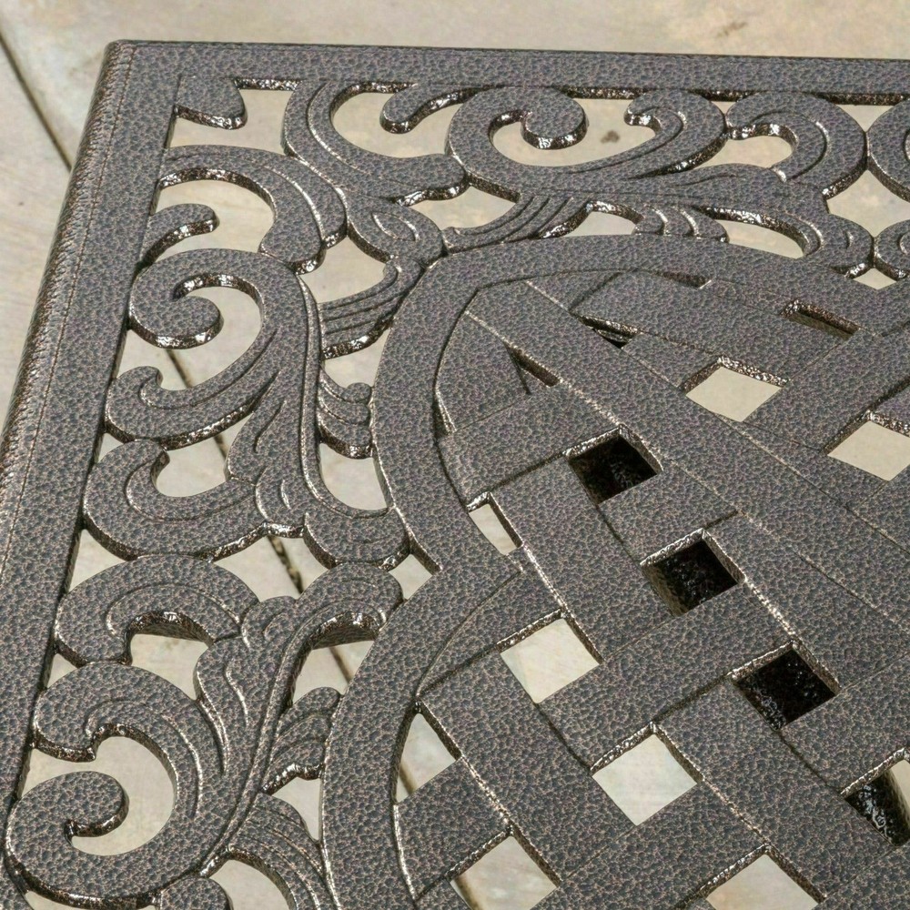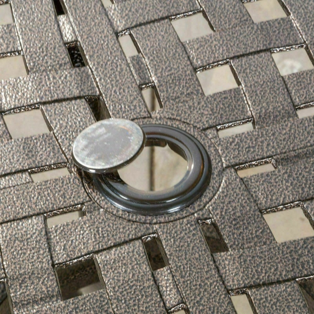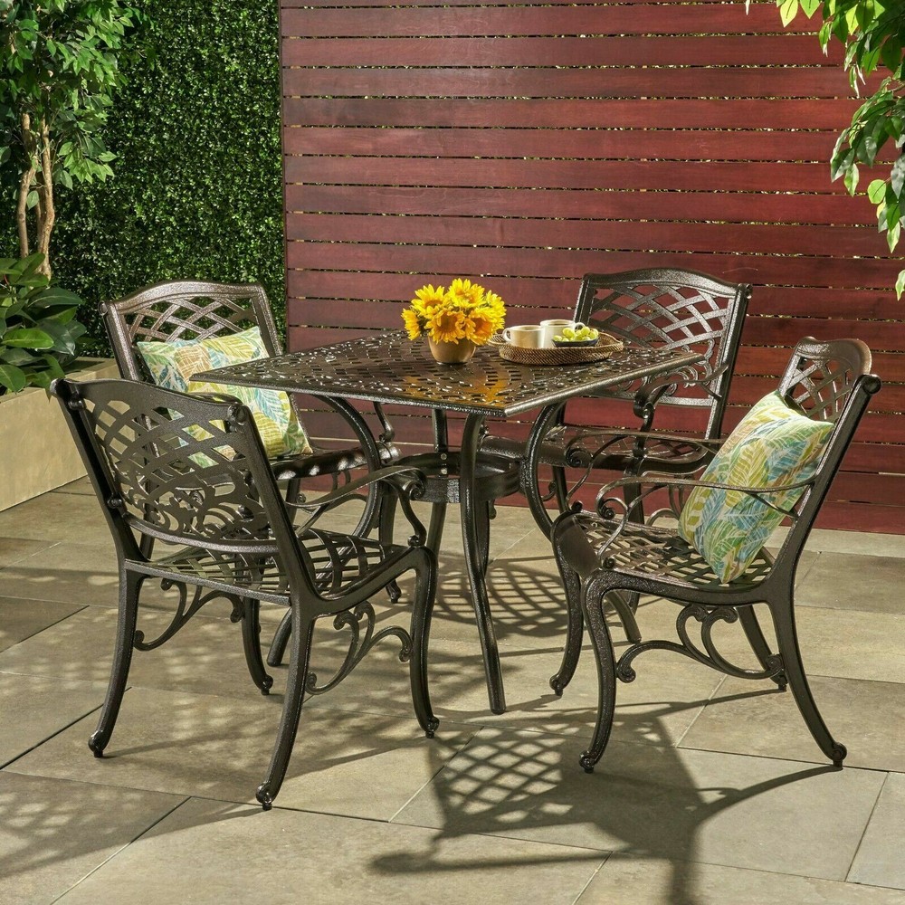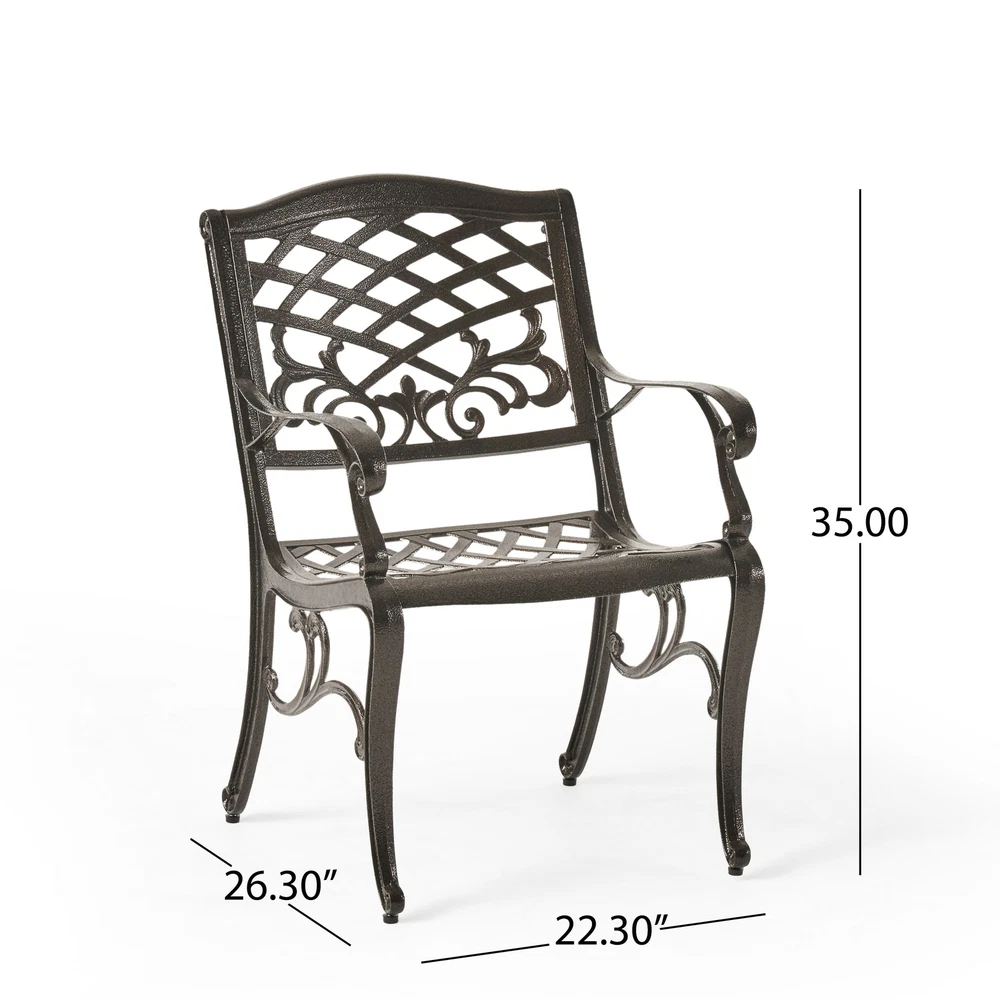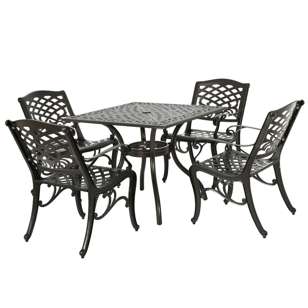 The Odena dining set is a gorgeous addition to any patio. This stylish set provides seating for 4, perfect for family outdoor dinners and hosting get-togethers for you and your friends. With space to add an umbrella, this table is perfect for all of your summer needs, and with its weather resistant aluminum finish it is ideal for years of use. Includes: One (1) Table, Four (4) Dining Chairs Material: Cast Aluminum Color: Hammered Bronze Assembly Required Table Dimensions: 37.00 inches long x 37.00 inches wide x 29.53 inches high Chair Dimensions: 22.30 inches deep x 26.25 inches wide x 34.85 inches high Seat Width: 19.50 Seat Depth: 18.50 Seat Height: 17.75 Arm Height: 25.50"