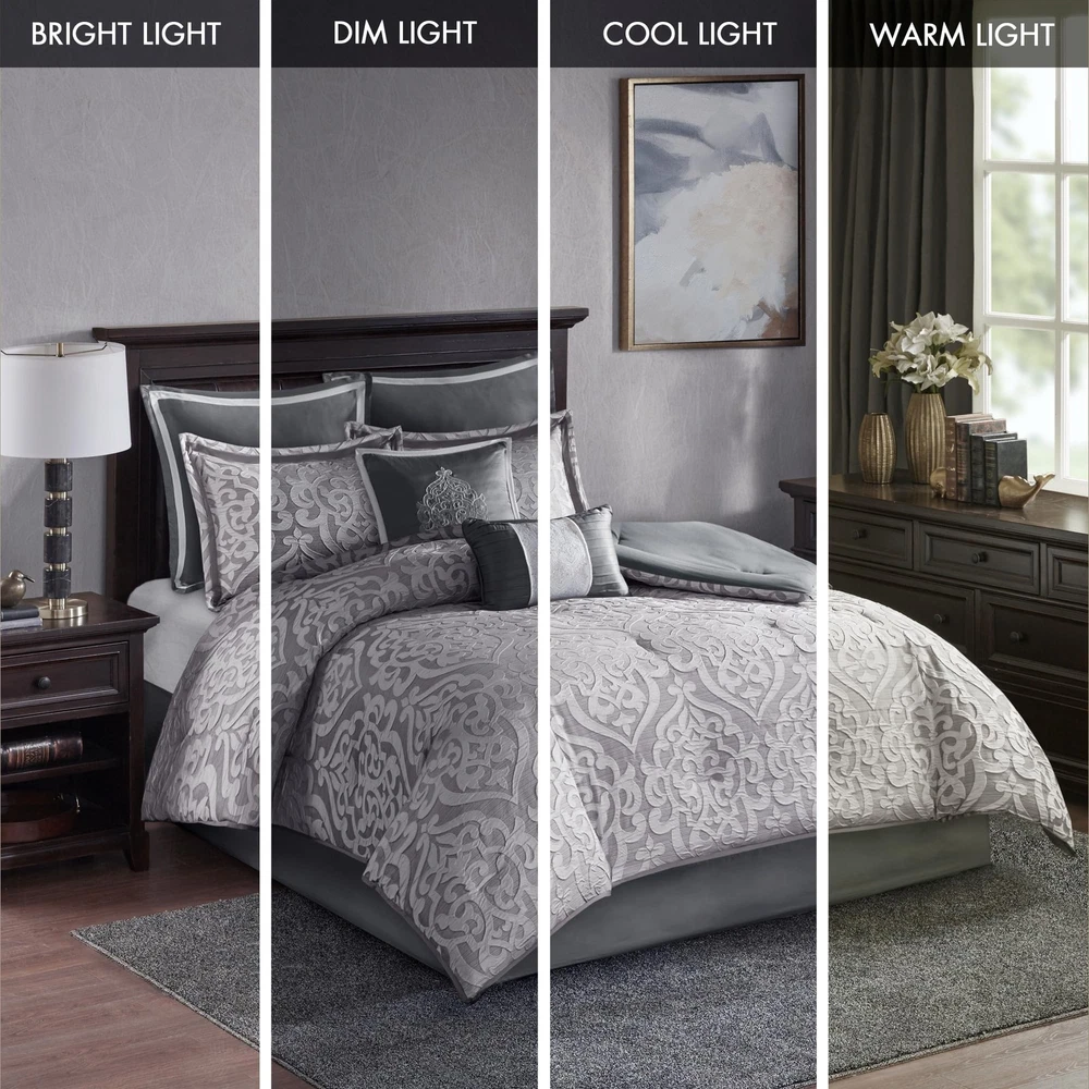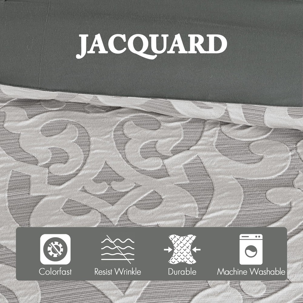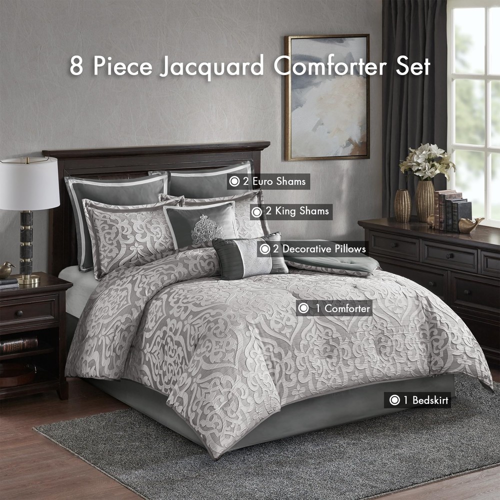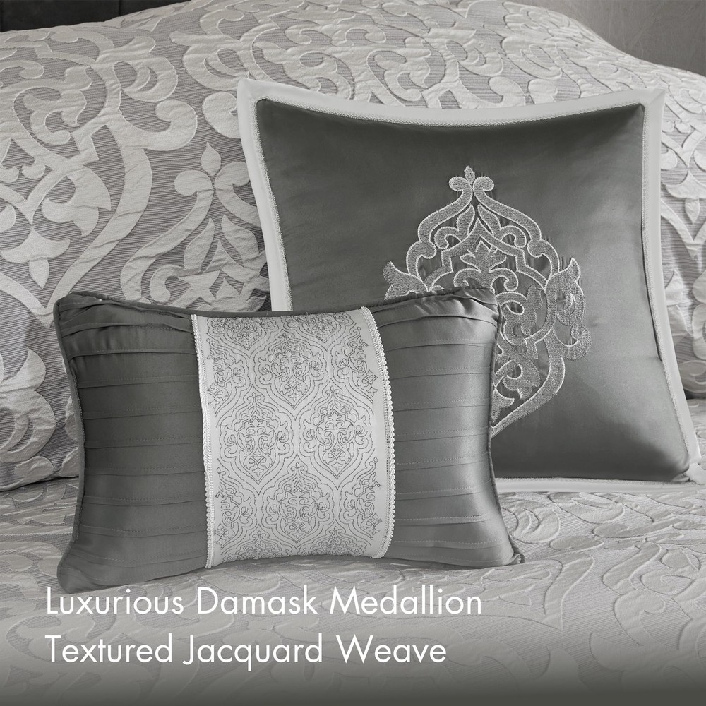 FEATURES - Add a touch of class to your bedroom with the comforter set. The luxurious comforter and shams flaunt a gorgeous medallion design with striations on the satin ground that add dimension to the lavish look. PACKAGE INCLUDE - 1 Comforter, 2 King Shams, 1 Bedskirt, 2 Decorative Pillows, 2 Euro Shams MEASUREMENT - 1 Comforter - 104(W) inches x 92(L) inches, 2 King Shams - 20(W) inches x 36(L) inches - 2 inch flange each, 1 Bedskirt - 78(W) inches x 80(L) inches - 15 inch drop, 2 Decorative Pillows - 12(W) inches x 18(L) inches/18(W) inches x 18(L) inches, 2 Euro Shams - 26(W) inches x 26(L) inches - 2 inch flange each MATERIAL DETAILS - Polyester jacquard with damask stria texture comforter and shams, microfiber reverse, 8oz/sq yard polyester filling, charmeuse bed skirt and euro shams, embroidered pillow with decorative cording, polyesting filling EASY CARE - Machine wash cold on gentle cycle, tumble dry on low heat, do not bleach, Spot Clean Pillow