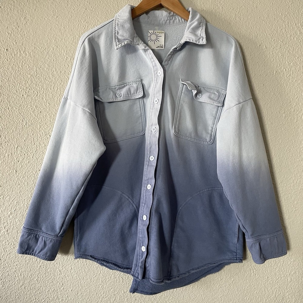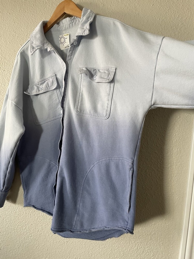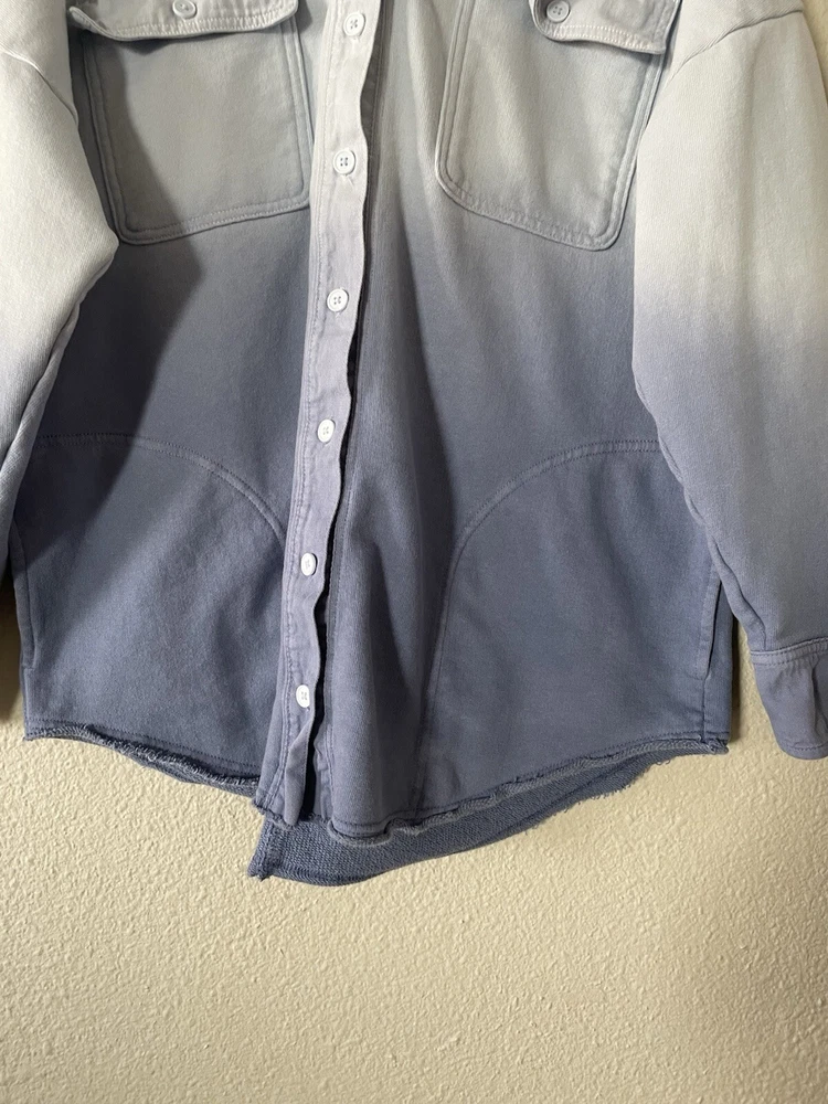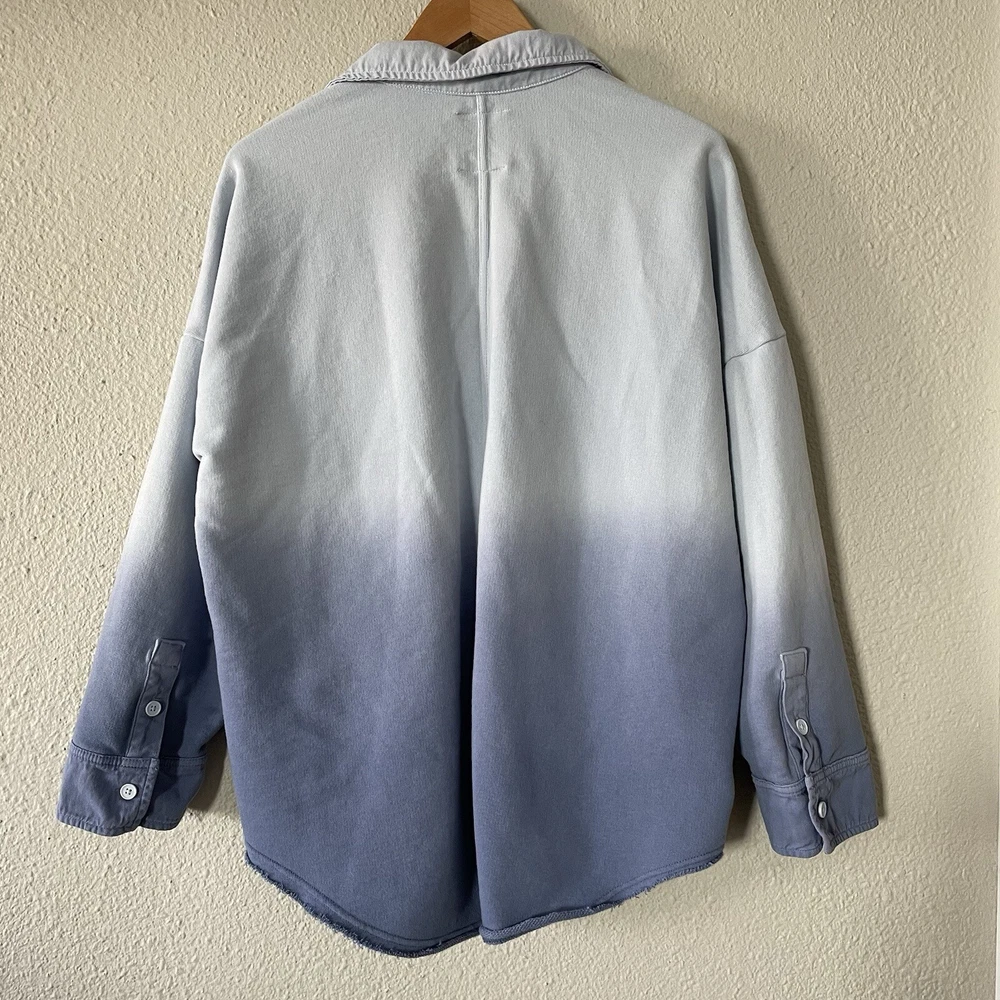 Offline By Aerie Throwback Shacket Women’s M Blue Ombré Dipped Oversized Top Size: medium Color: blue Chest & side pockets 95% cotton, 5% polyester Machine washable Great condition- like new except for very minor stain on left collar, see all photos. Measurements are included in photos, please refer to them for a more proper fit. * I accept reasonable offers. * Same or next day shipping. * Smoke free, pet friendly home.