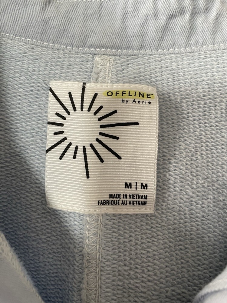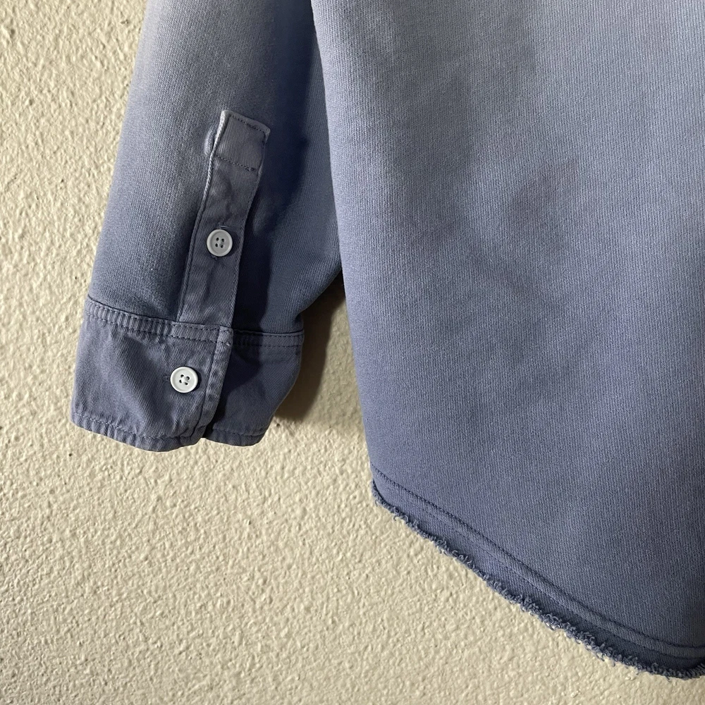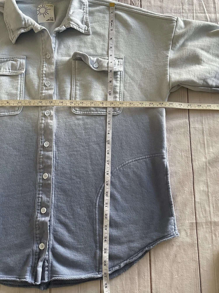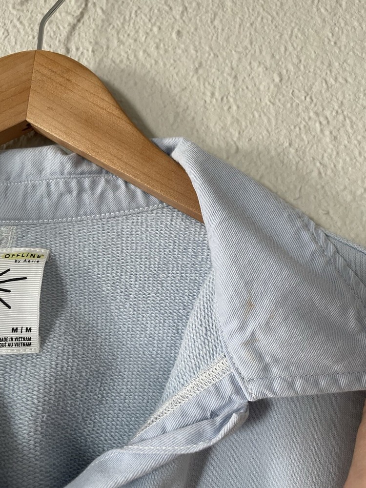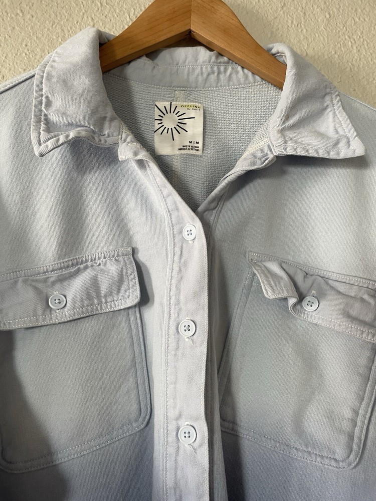 Offline By Aerie Throwback Shacket Women’s M Blue Ombré Dipped Oversized Top Size: medium Color: blue Chest & side pockets 95% cotton, 5% polyester Machine washable Great condition- like new except for very minor stain on left collar, see all photos. Measurements are included in photos, please refer to them for a more proper fit. * I accept reasonable offers. * Same or next day shipping. * Smoke free, pet friendly home.