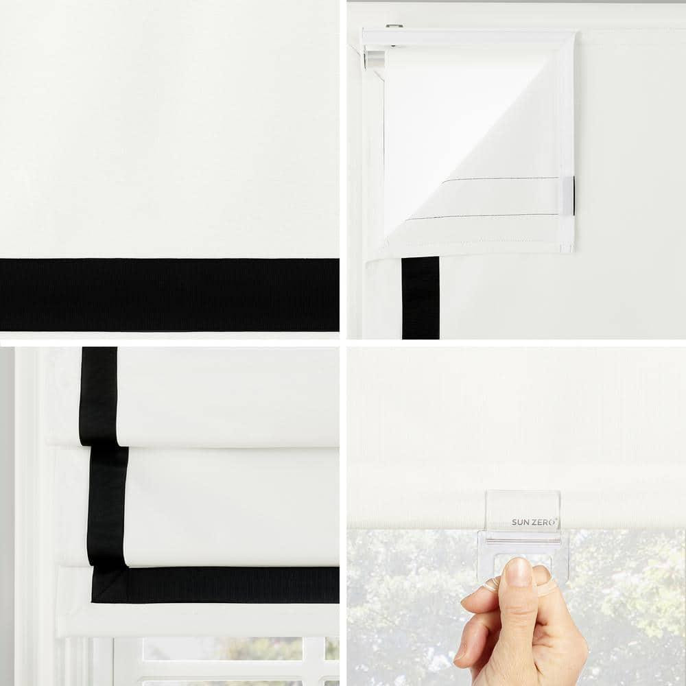 Olander Cordless Black 100% Blackout Black Ribbon Border Fabric Roman Shade 33 in. W x 64 in. L Black ribbon border design adds sophistication Total blackout technology blocks 100% of outside light Thermal properties help keep summer heat and winter chill out Featuring a subtle crosshatch textured fabric with a black ribbon border stripe design, Sun Zero Olander Black Ribbon Border 100% Blackout Cordless Roman Shades add sophisticated style and function to windows in any room for your home. Sun Zero Total Blackout technology is laboratory tested to block out 100% of light, reduce outside noise by up to 50%, and decrease energy lost through your windows by up to 45%. Comfort is optimized with thermal properties that help keep summer heat and winter chill out of your home. Best for Kids Certified cordless design with included handle pull for easy adjustment. Use in your entertainment room to eliminate screen glare and reduce distracting outside noise, or in your bedroom for enhanced privacy and a sounder, more uninterrupted sleep. Mounting hardware included for inside or outside mount as desired. Color Family: Black Color/Finish: Black Control Type: N/A Decor Type: Window Treatment Enclosure Type: Glass Window Features: No Additional Features Front Color: Black Included: Installation/Mounting Hardware Light Control: Blackout Material: Polyester (100%) Mount Type: Inside/Outside Mount Opening type: Top down Orientation: Horizontal Origin: Imported Pre-Cut Deduction (in.): 0 Product Weight (lb.): 4.69 lb Returnable: 90-Day Shop Type: Pre-Cut Surface: Striped Window Treatment Product Type: Fabric Roman Blind/Shade Certifications and Listings: No Certifications or Listings Manufacturer Warranty: No Warranty Actual Blind/Shade Width (In.): 33 Minimum window depth required (in.): 2 in Pre-Cut or True-to-Size Blind: True-to-Size Product Length (in.): 64 in Product Width (in.): 33 in Width (in) x Length (in): 33in x 64 in