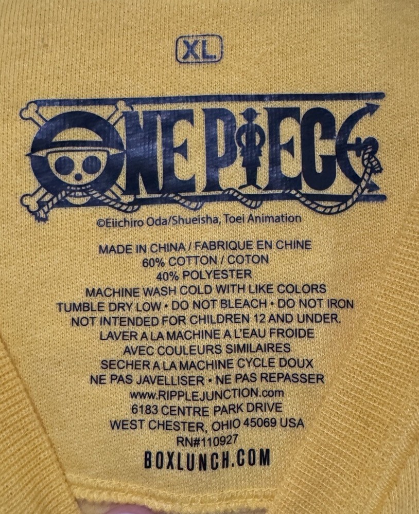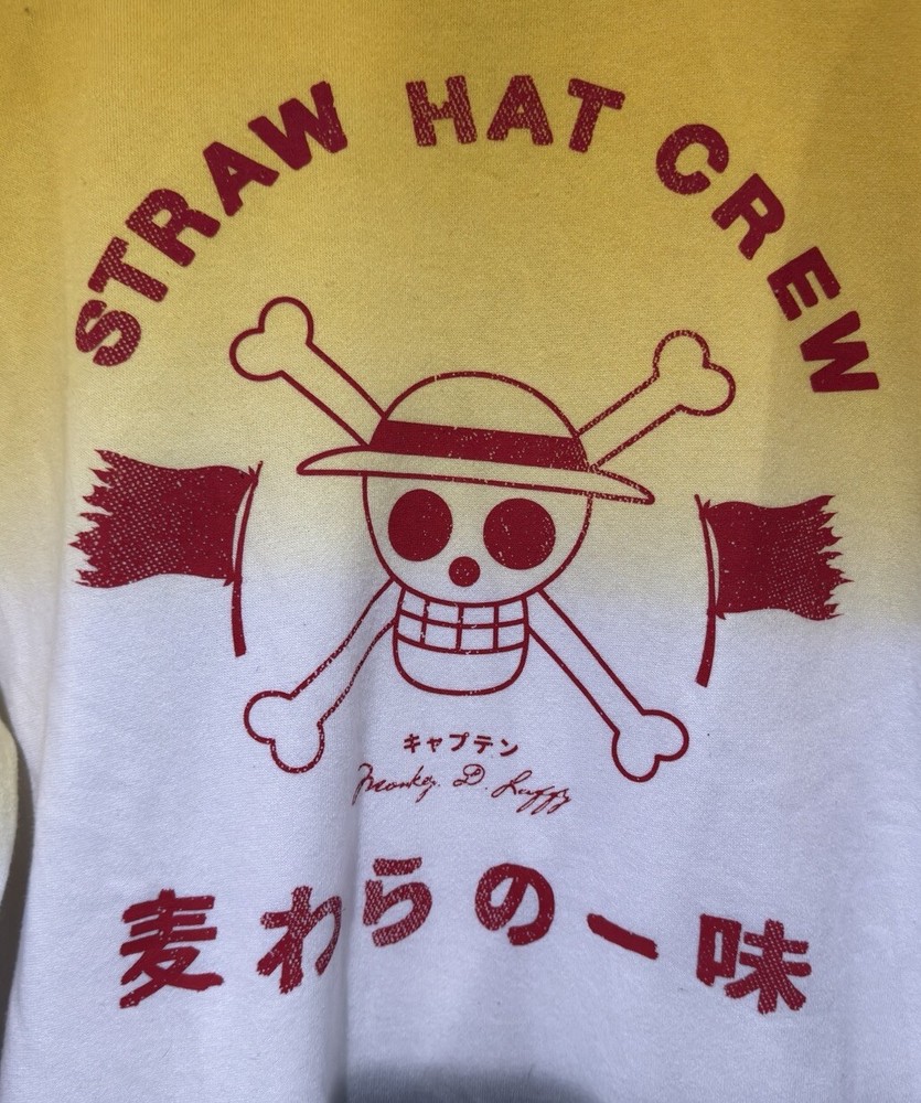 This One Piece sweatshirt is a must-have for any fan of the popular anime series. The yellow, black, and white color scheme creates a unique and eye-catching design that is sure to turn heads. The crew neck and pullover style make it comfortable and easy to wear, while the XL size ensures a comfortable fit for men of all shapes and sizes. The sweatshirt is part of the Box Lunch collection and features the iconic One Piece character. It is made from high-quality materials and is built to last, ensuring that you can enjoy it for years to come. Perfect for casual wear or cosplay events, this One Piece sweatshirt is a great addition to any anime fan's wardrobe. No returns. No refunds. Please inspect all photos for details and condition. More photos available upon request. Please note that these are used and sometimes older items. They may have minor blemishes / imperfections on them. I do my best to point out blemishes I notice but sometimes some are not noticed. If you want more detailed pictures of certain areas, just ask. Any issues, feel free to contact me to make things right. Thanks!