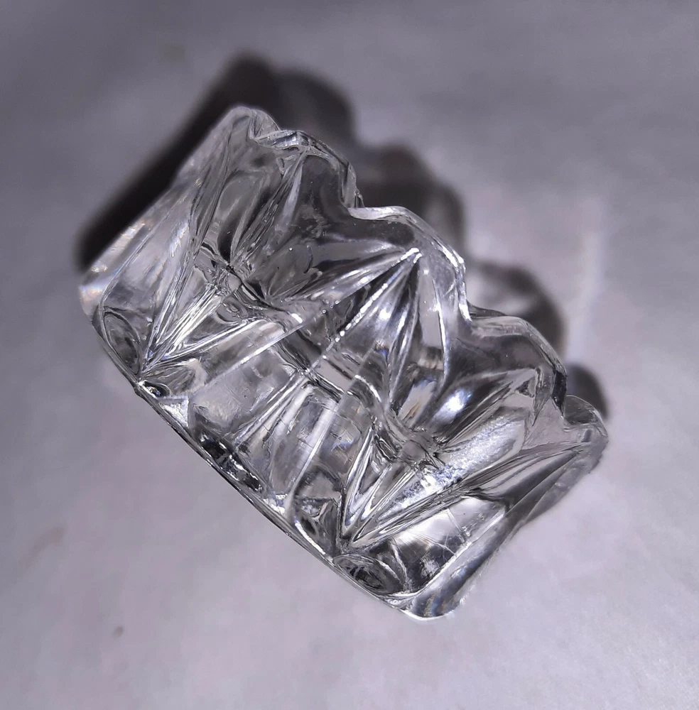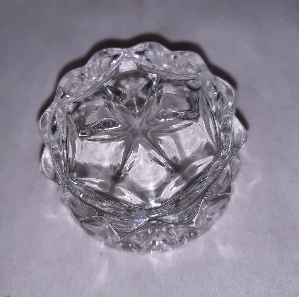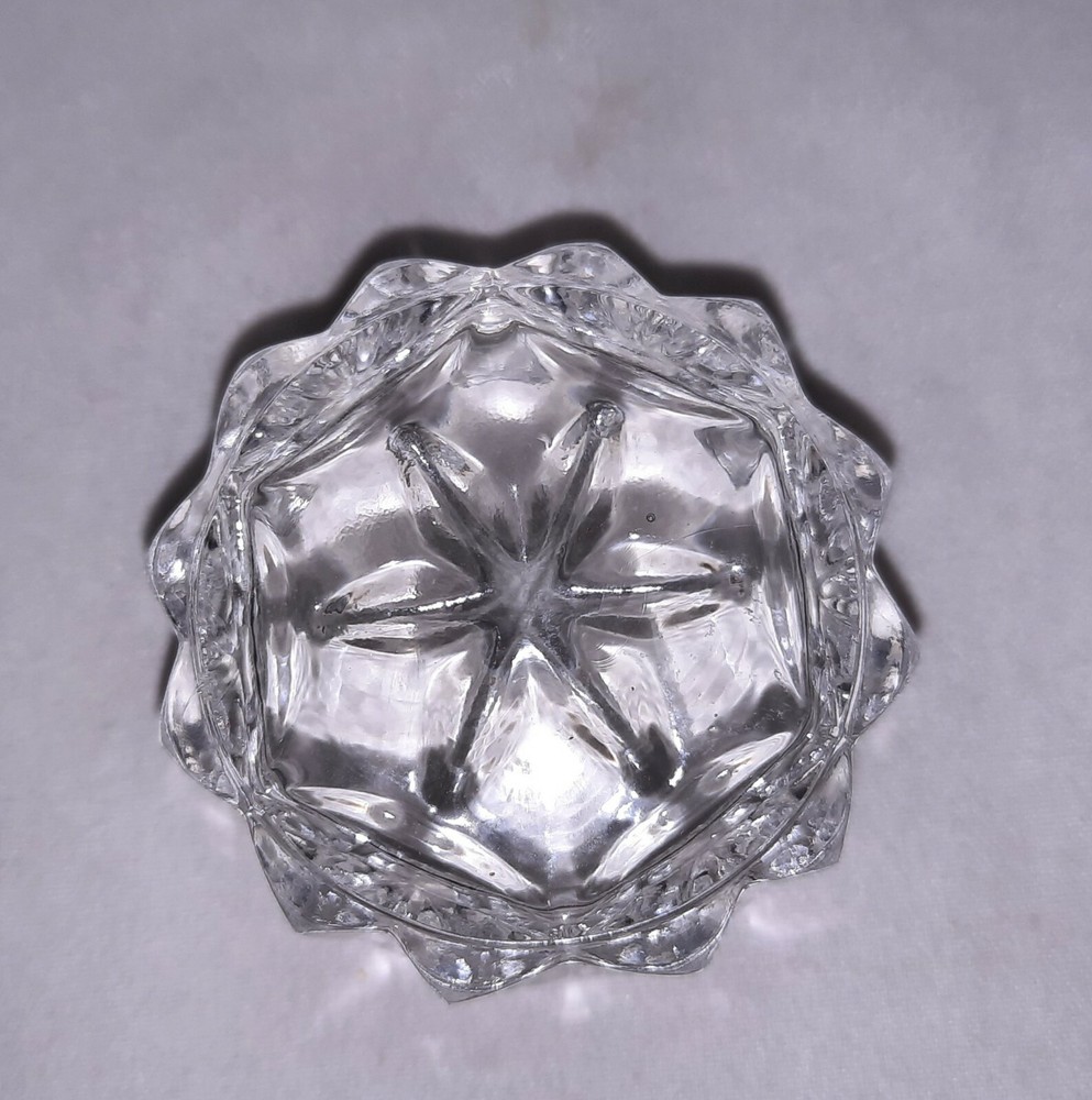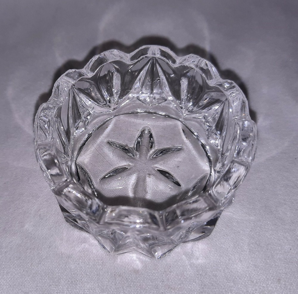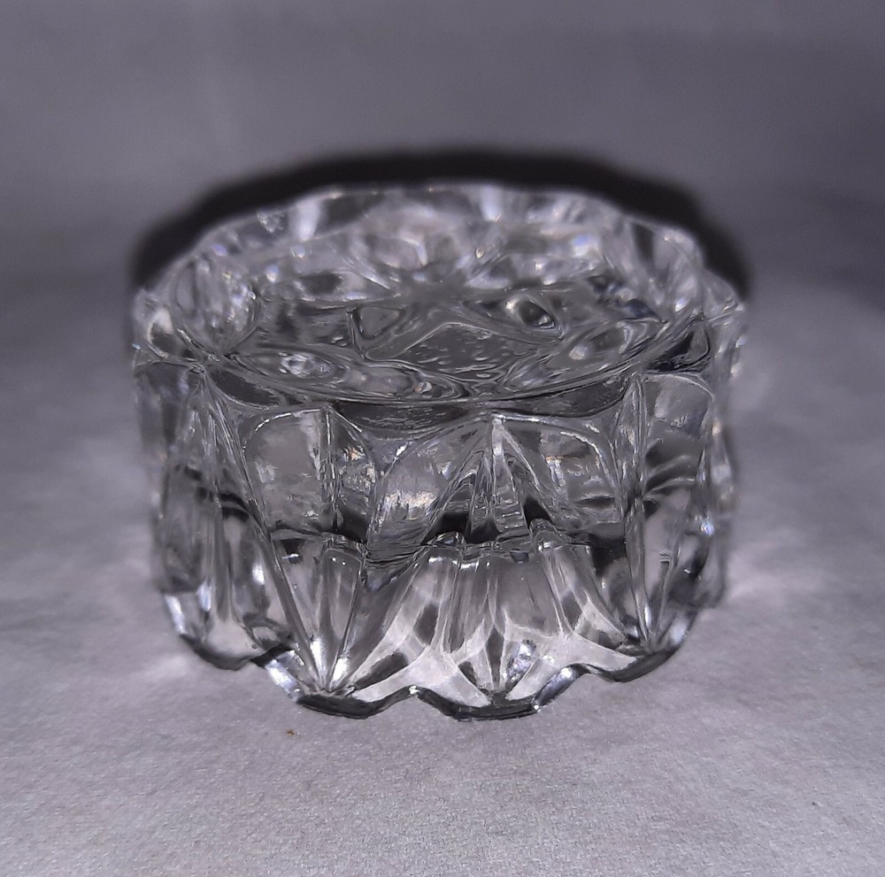 Clear glass open salt dip cellar Size is about 1" tall x 1 3/4" across (2.6 x 4.4 cm) This is in good condition No cracks or chips Thanks for looking and shopping with Debbie's Trading Post. 16033 #61