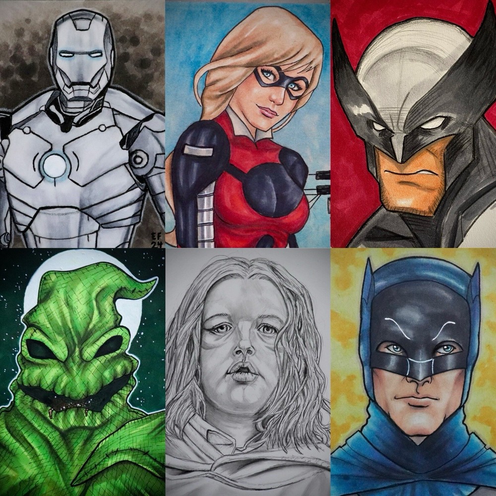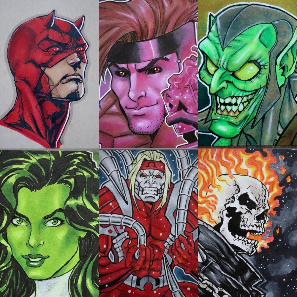 Original custom sketch card portrait comic art commissions. Includes post it size to trading card or 4.5 x 6 inches. Mixed media full color head/bust artwork. Buyer picks character. Made to order. Sold by artist. No kids, pets or extensive prompts. Please allow 2-4 weeks.