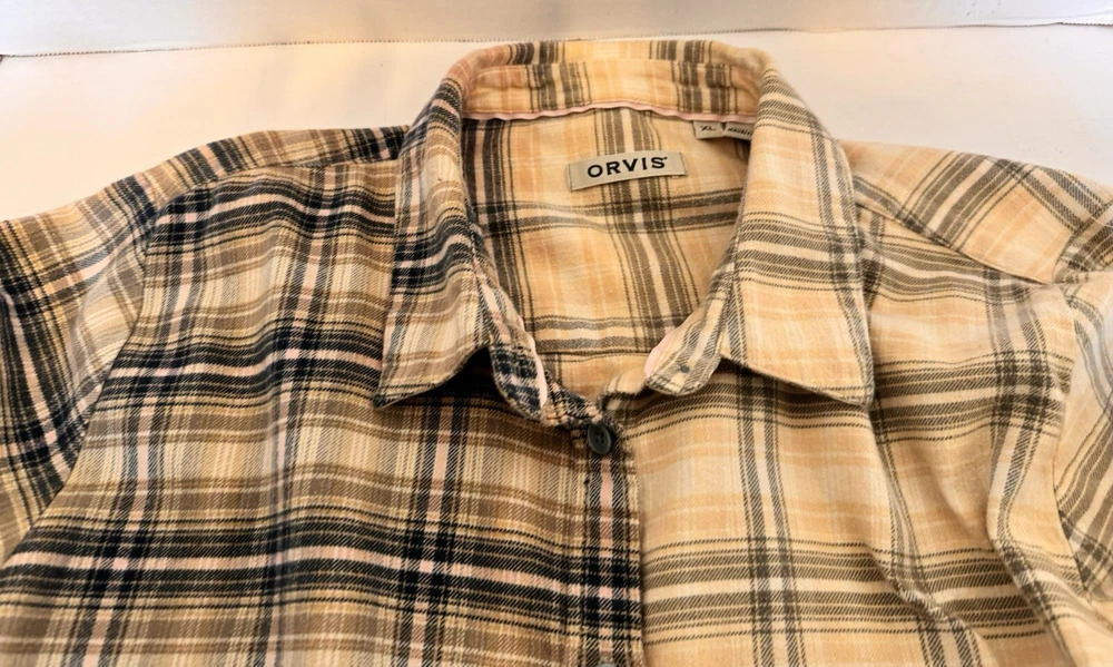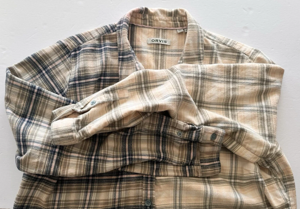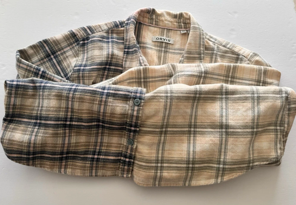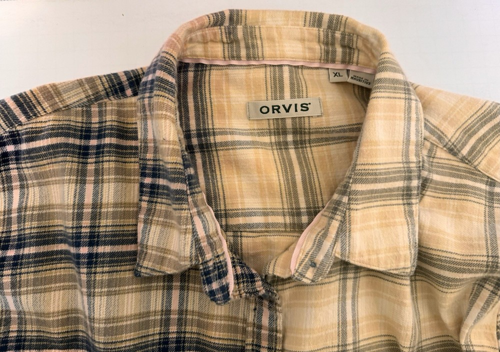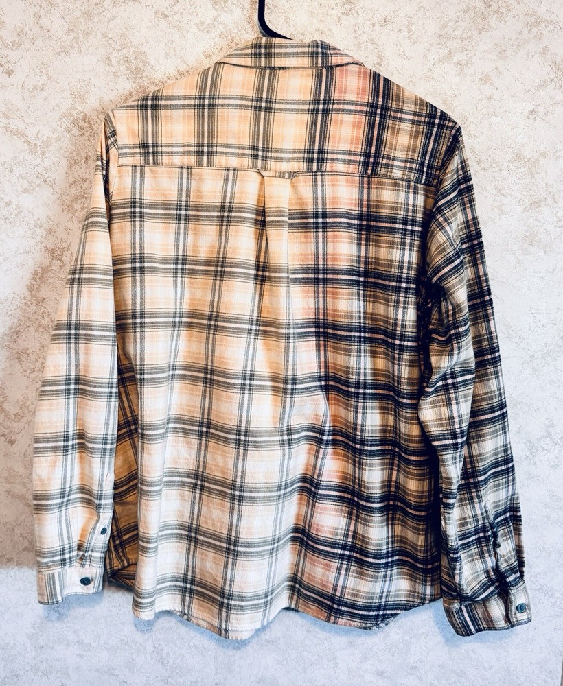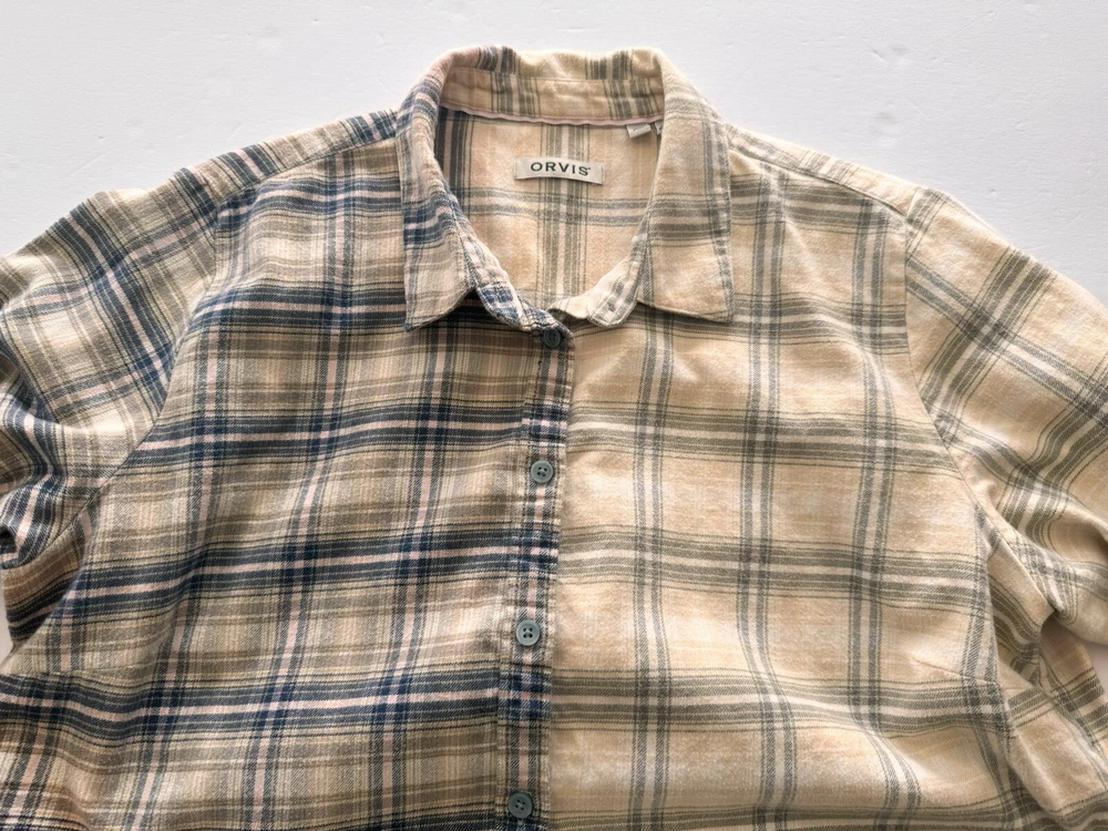 Orvis Distressed Women's Flannel Dipped Bleached Shirt Plaid XL Pink Blue Beige This is a reworked distressed bleached flannel shirt Orvis brand Size is women's Extra Large These are in style worn as oversized jackets. Also worn as a delightful in style shirt Unbleached right side is a tan, pink and blue plaid. Bleached left side is a light tan and grayish blue plaid Buttons up the front with eight blue buttons. Long sleeves with cuffs that button Measured lying flat and across. See below Arm pit to arm pit - 23 inches Shoulder - 16 inches Sleeve length - 24 inches Length -28 inches Nice distressed condition with no rips, tears or stains Message with any questions