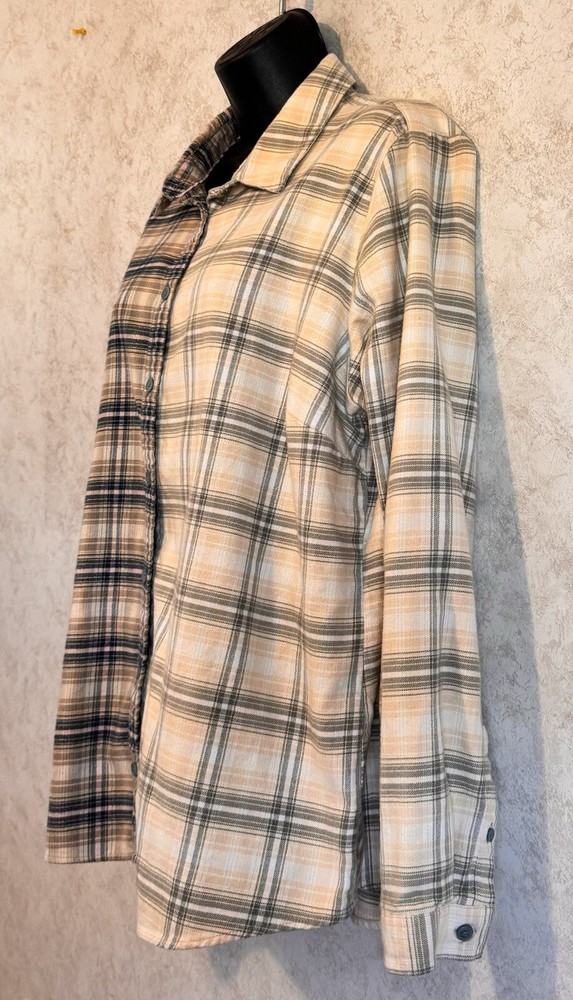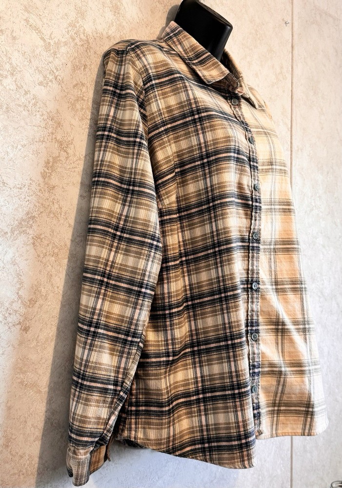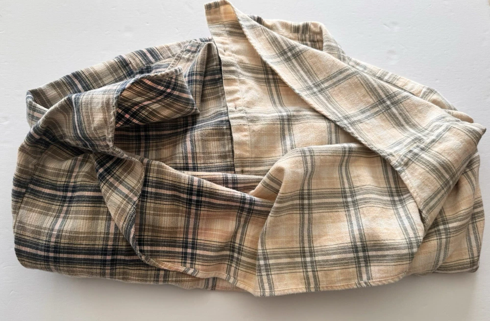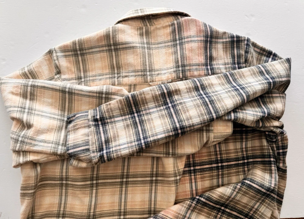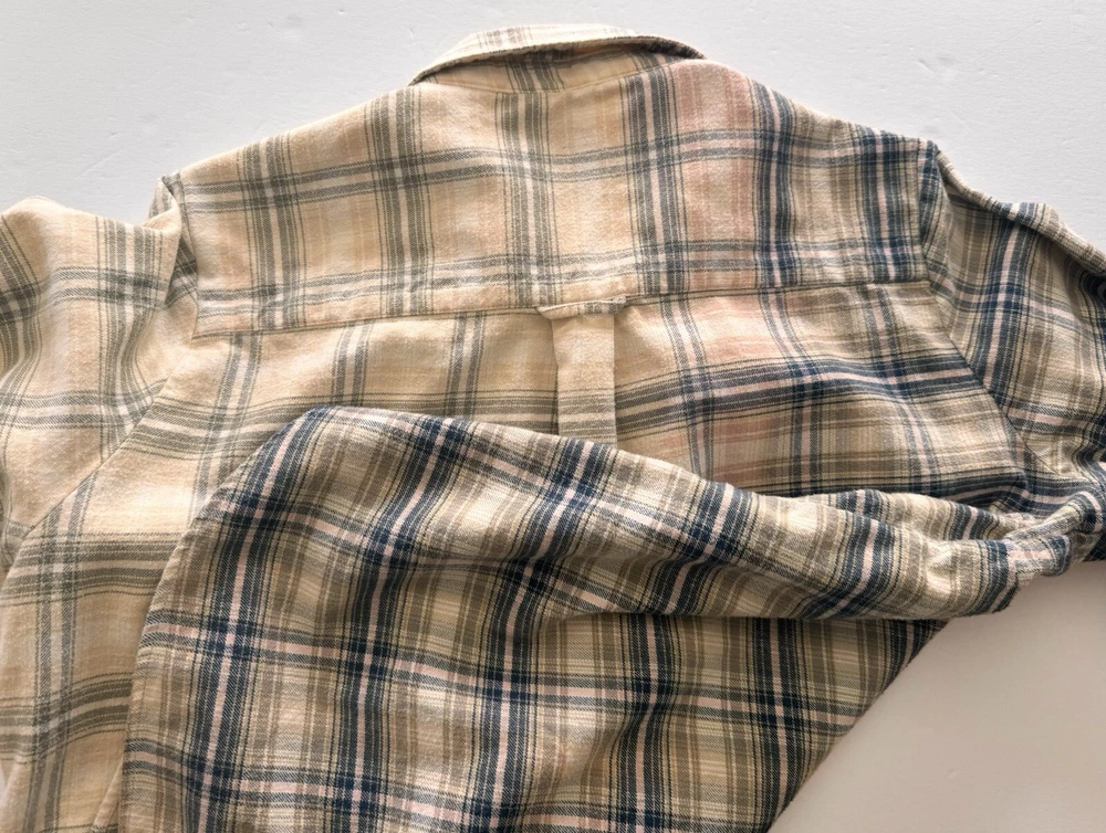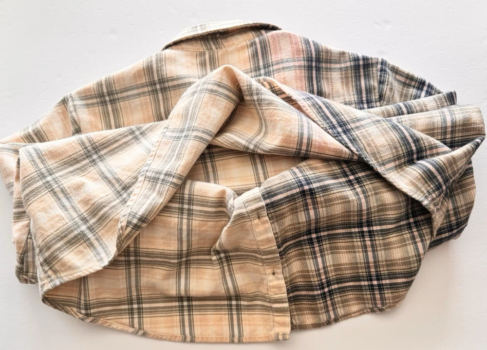 Orvis Distressed Women's Flannel Dipped Bleached Shirt Plaid XL Pink Blue Beige This is a reworked distressed bleached flannel shirt Orvis brand Size is women's Extra Large These are in style worn as oversized jackets. Also worn as a delightful in style shirt Unbleached right side is a tan, pink and blue plaid. Bleached left side is a light tan and grayish blue plaid Buttons up the front with eight blue buttons. Long sleeves with cuffs that button Measured lying flat and across. See below Arm pit to arm pit - 23 inches Shoulder - 16 inches Sleeve length - 24 inches Length -28 inches Nice distressed condition with no rips, tears or stains Message with any questions