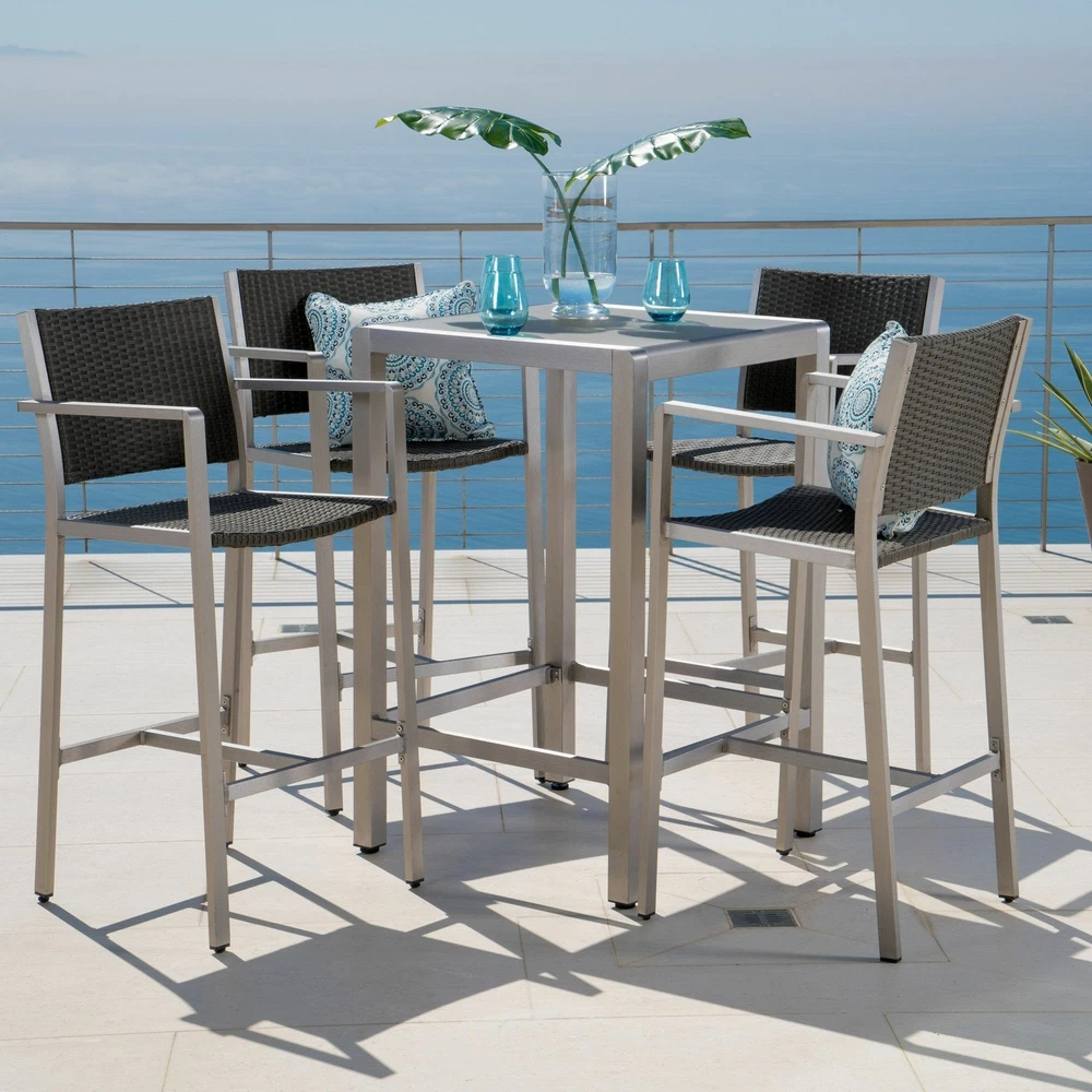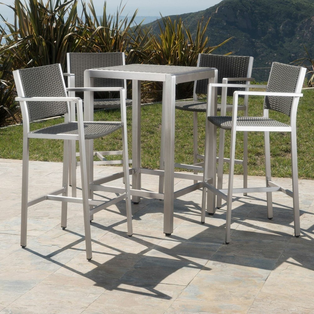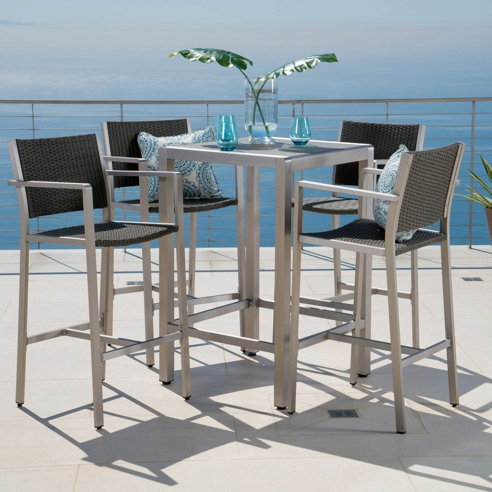 This outdoor bar set features four bar stools and a bar table and is a perfect accent to any patio or barbecue area. The stools feature a durable aluminum body and weather-resistant outdoor mesh. The table features the same light-weight aluminum frame and a glass top. This space saving set is built for having a good time in your yard. Includes: One (1) Table;Four (4) Barstools Multiple Material Options Multiple Color Options Assembly Required Table Dimensions: 27.56 inches deep x 27.56 inches wide x 43.00 inches high Faux Rattan Tabletop Weight Capacity: 211 lbs Glass Tabletop Weight Capacity: 50 lbs Barstool Dimensions: 21.50 inches deep x 22.25 inches wide x 45.00 inches high Barstool Seat Dimensions: 16.50 inches deep x 19.25 inches wide x 29.25 inches high Arm Height: 39.25 inches Footrail Height: 21.00 inches Barstool Weight Capacity: 400 lbs