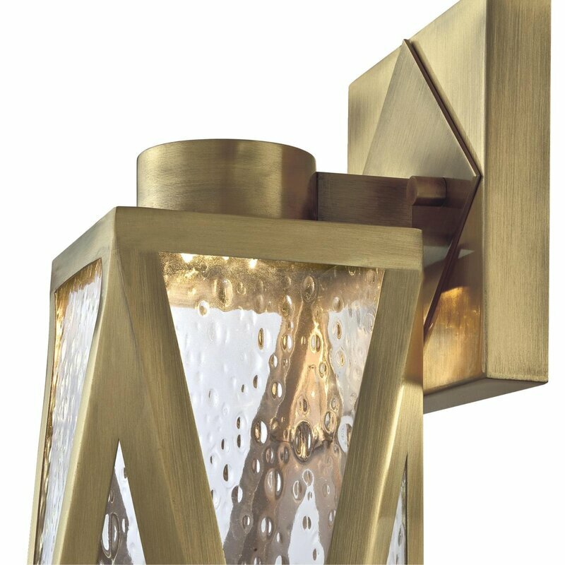 Description Add charming style with rustic details to your home with this outdoor wall lantern. It is with hand blown clear seeded glass filters warm, inviting illumination. Install this fixture by your front or back entryway. What's Included? Built-in LED Light(s) Features Outdoor energy-saving LED wall fixture with a modern geometric design, dimmable when used with a compatible dimming switch Product Details Fixture Material: Metal Dry, Damp or Wet Location Listed: Wet Power Source: Hardwired Weights & Dimensions Overall 13.75'' H x 5.5'' W x 6.25'' D Body 8.25'' H x 5.5'' W x 6.25'' D Back Plate 5'' H x 5'' W x 5'' D Overall Product Weight 3.31 lb. Features Lighting Type Outdoor Wall Lantern Country of Origin China Power Source Hardwired Dry, Damp or Wet Location Listed Wet What is Dry, Damp or Wet Location Listed This indicates whether the fixture is safe to use in dry locations, damp locations (moist environments), or wet locations (direct exposure to water). Voltage 120 Volt Fixture Shape Novelty Integrated LED Yes Integrated LED Wattage 12.5 Watt Integrated LED Brightness (Lumens) 560lm Integrated LED Color Temperature 3000K Integrated LED Color Rendering Index (CRI) 80 Integrated LED Rated Lifespan 25000 hours What is Integrated LED This indicates that an LED light is built into the fixture. Integrated LED lights are more energy efficient and can last up to 50,000 hours. They cannot be replaced by the customer. Number of Bulbs 1 Fixture Material Metal Glass Type Water Dimmable Yes Motion Sensor No Dusk to Dawn No Light Direction Ambient Product Care Wipe Clean with dry cloth Maximum Wattage (per bulb) 12.5 Watt Back Plate Included Yes Specifications ETL Listed Yes MET Listed Yes Title 20 - California Code of Regulations Yes Nevada R100-19 GSL Compliant Yes Washington 19.260 GSL Compliant Yes Assembly Adult Assembly Required Yes Installation Required Yes Warranty Commercial Warranty Yes Product Warranty Yes Warranty Length 5 Years Full or Limited Warranty Limited Warranty Details Against defects