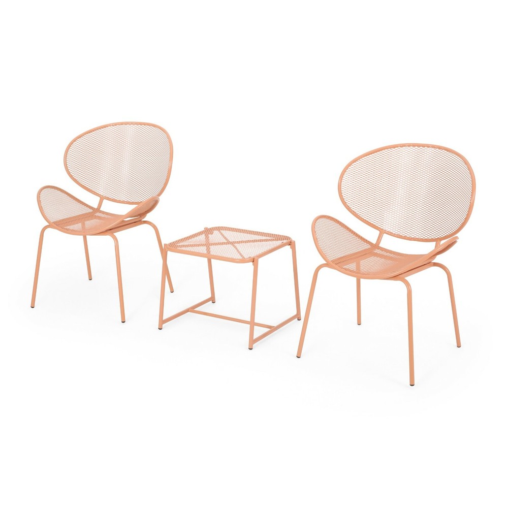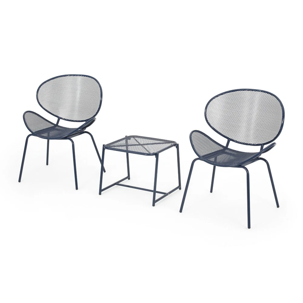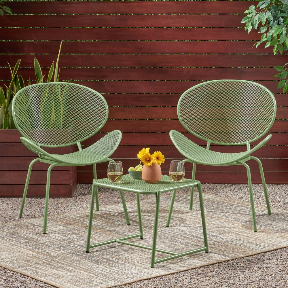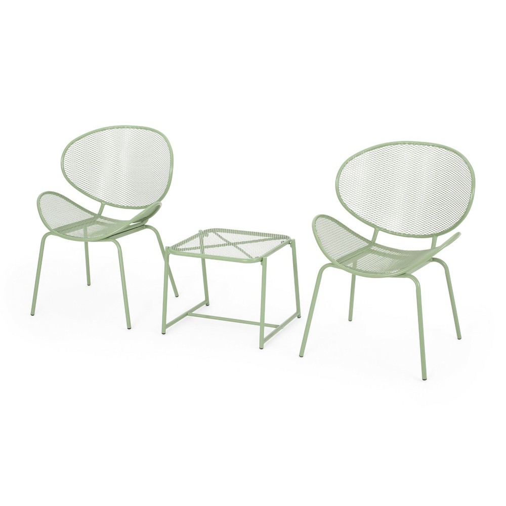 Outdoor lounging has never been easier with our delightful two-seater chat set. Featuring breathable mesh seating and groovy shell shape frame, our chat set offers a timeless yet modern style for your backyard while providing ultimate comfort. These chairs hug you in all the right places with its swooping curves and smooth, rounded frames. Complemented by a smooth matte finish, this lovely set not only brings your patio an upgraded look but is also made to last with its durable structure. MODERN: With a delightful mesh motif contrasted perfectly by its rounded edges, our chat set is the ideal modern accessory for your outdoor space. Finished with shell frames, this set not only has a sleek, minimalistic look but also provides a stable structure. METAL FRAME: Constructed of powder-coated iron, the frame of this chat set is made to be incredibly durable, ensuring that this piece will hold up under heavy use. Please note, this is only weather-resistant and it is suggested that this is covered or stored indoors when it rains. SHELL CHAIR: Featuring a playful retro look, the chairs of this set offer a unique shell design that emphasizes beauty from all angles. With tapered legs and wing-like silhouette, this chair offers incredible stability with its three-legged structure while offering a light and airy atmosphere to your living room. DIMENSIONS: Choose an accessory that is the perfect size for you and your furniture. Each chair is 24.80" W x 25.50" D x 34.00" H and the table is 19.50" W x 18.00" D x 16.25" H. You will love how much your space can transform with the simple addition of this charming set. ASSEMBLY REQUIRED: Some assembly is required for this chat set. All of the instructions and tools needed for assembly are included. Includes: Two (2) Chairs and One (1) Table Material: Iron Finish: Matte Green / Matte Navy Blue / Matte Orange / Matte Teal Hand-Crafted Details Assembly Required Dimensions: 24.80 inches deep x 25.50 inches wide x 34.00 inches high Seat Dimensions: 16.50 inches deep x 18.00 inches wide x 16.50 inches high Table Dimensions: 18.00 inches deep x 19.50 inches wide x 16.25 inches high