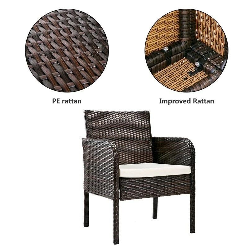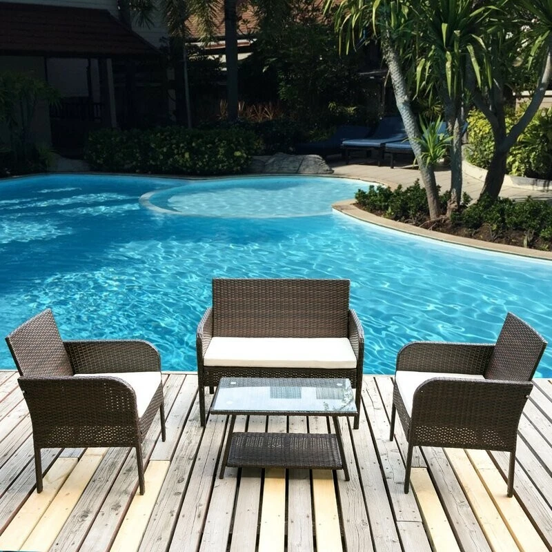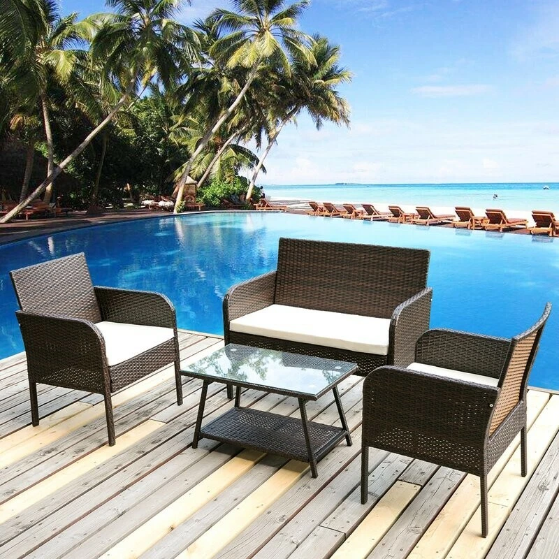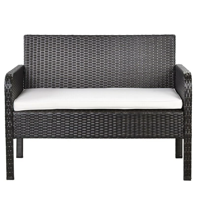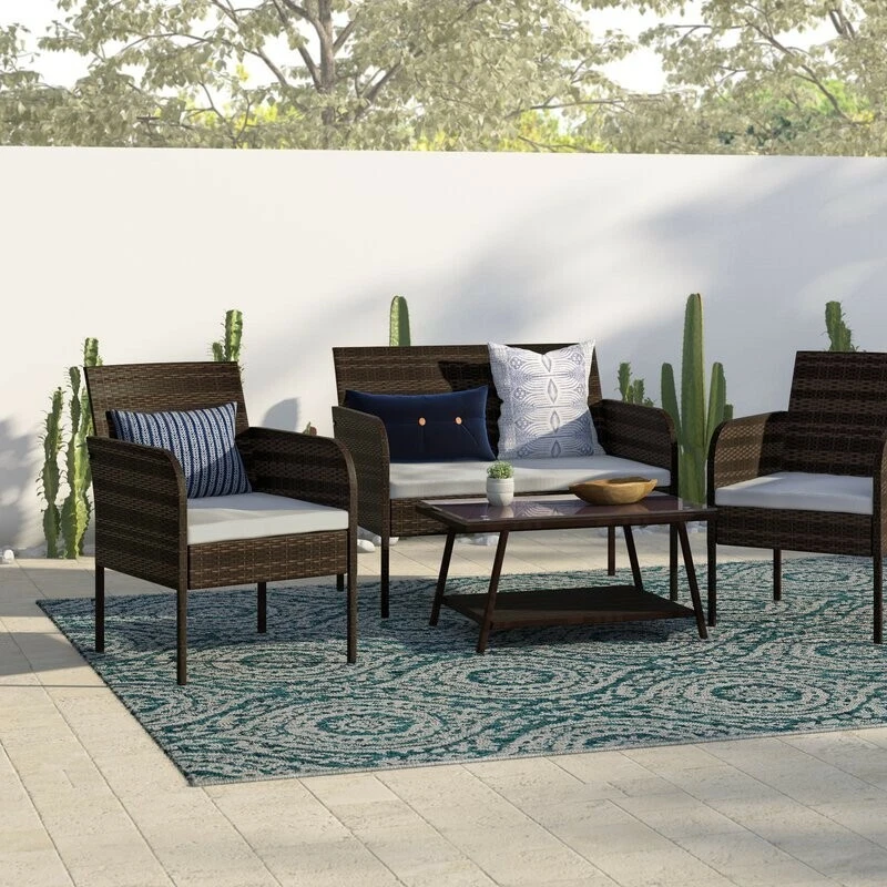 Lounge in style with this outdoor 4 piece rattan sofa set. Perfect for transforming your outdoor space into the perfect summer getaway, this set includes everything you need to host barbecues or simply enjoy the great outdoors and relax. What's Included? 1 Table Sofa 2 Chair 1 Loveseat / 2-seater Features The neat and crisp silhouette and style immediately transform your outdoor space into a strikingly contemporary leisure area. The set can be put in a patio, garden, poolside, backyard, balcony, and so on. The rounded front corners of the armrests not only ensure safety but also provide a great place to relax your arms Features heavy-duty constructed stainless steel frame and all-weather polyester rattan, the patio set withstands rain, sun exposure, and wind effortlessly. The lofty sponge padded cushion offers the cozy experience of deep seating. The water-resistant cushion cover can be removed to clean which requires little maintenance. The coffee table includes an elegant tempered glass top and a rattan rack that provides generous space for display and storage. It is great for friendly gatherings for nice tea time or a barbecue party Easy and quick assembly required Rust prevention, UV protection, and weather resistant Product Details Seating Outer Frame Material: Plastic; Wicker/Rattan Cushion Upholstery Material: Cotton Product Care: Wipe with a soft cloth