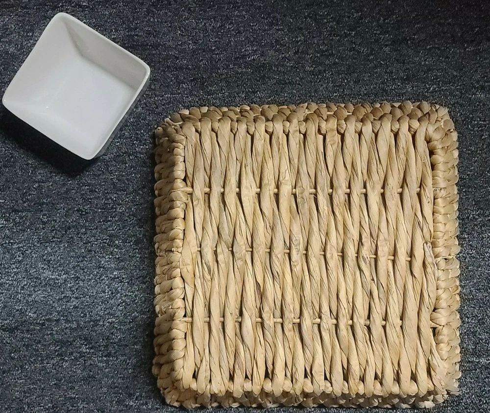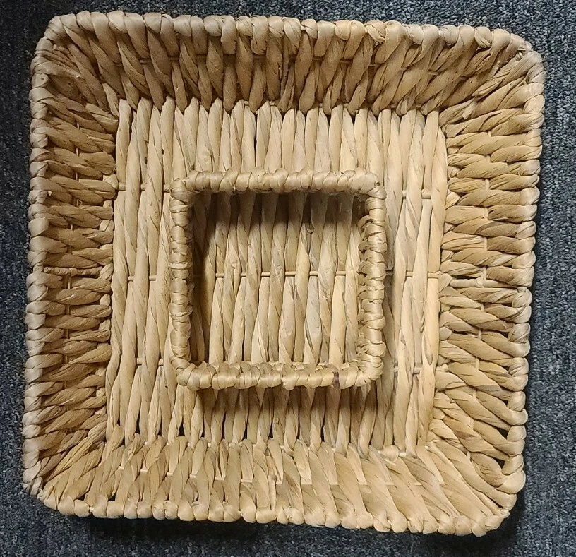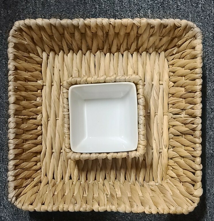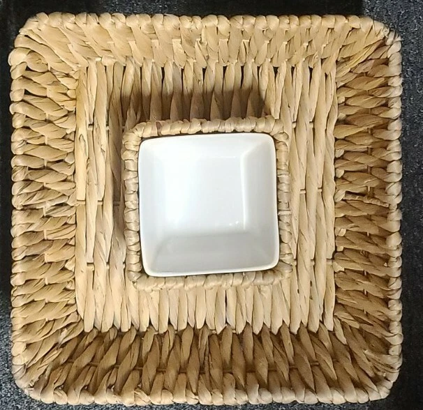 This sale is for one (1) rattan/wicker chip/dip basket & bowl set Square shaped Basket measures approximately 14" x 14" Ceramic dip bowl measures approximately 5" x 5" Item is in good ~ pre-owned condition Please view photos for a good description of this basket/bowl set Thank you!
