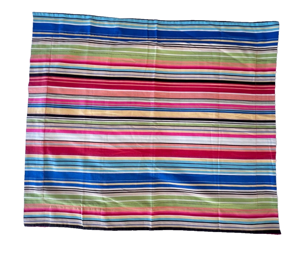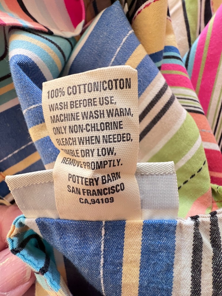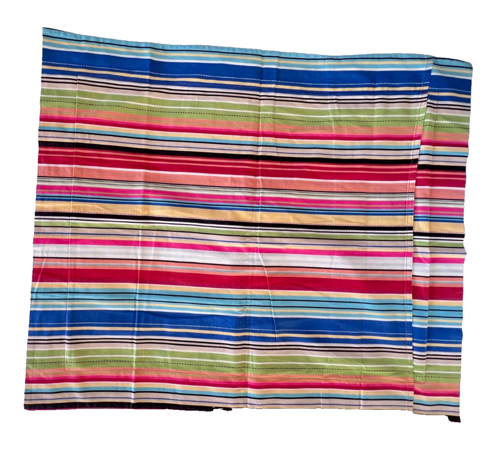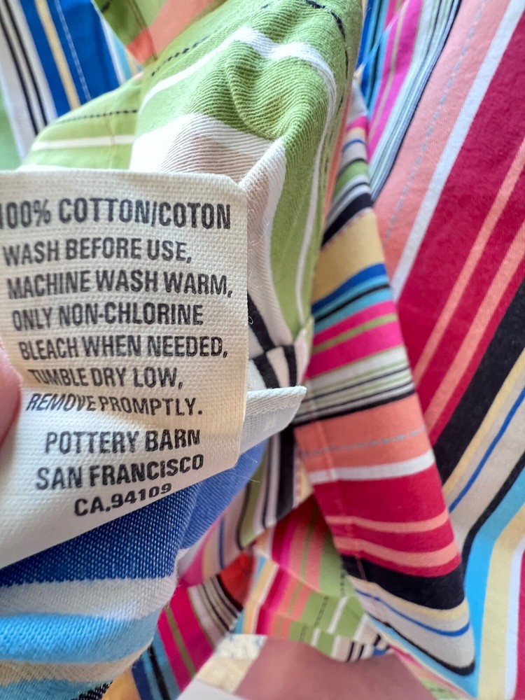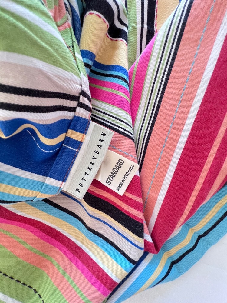 This is a pair of Pottery Barn flanged pillow shams in a standard size, featuring a multicolored stripe pattern. Made of 100% cotton in Portugal, these rectangular shams have a traditional style and are machine washable - tumble dry. The closure type is a pocket style, making them easy to use and care for in the bedroom. EXCELLENT condition without rips, tears, or stains.