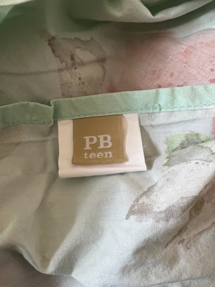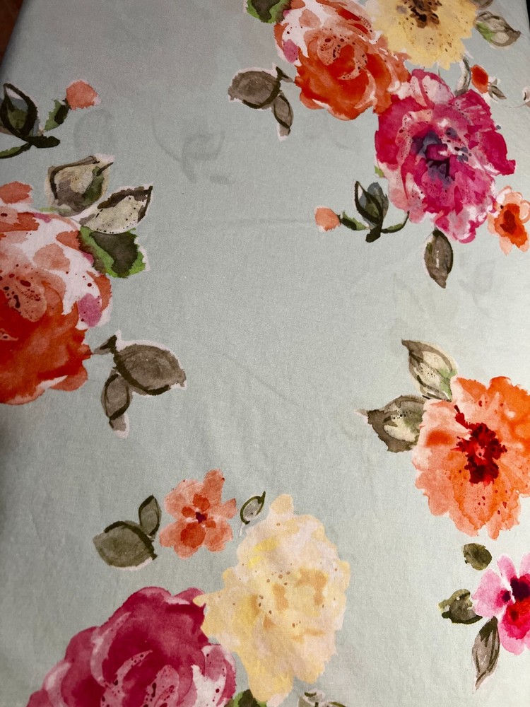 This beautiful duvet cover from Pottery Barn will add a touch of elegance to any bedroom. The floral pattern (in soft shades of rose, yellow, white and green) are laid out on a mint green background. This will sure create a calming and peaceful atmosphere. The full size cover is perfect for a cozy night's sleep and will fit seamlessly into any bedroom decor. The set includes one duvet cover, making it easy to update your bedding without having to purchase a whole new set. Ideal for those who appreciate quality and style in their home. 100 % cotton Machine washable on a gentle cycle and tumble dry. Easy to iron. The full size dimensions are: 90 (w) X 88 (L) It awesome condition from a smoke-free home.