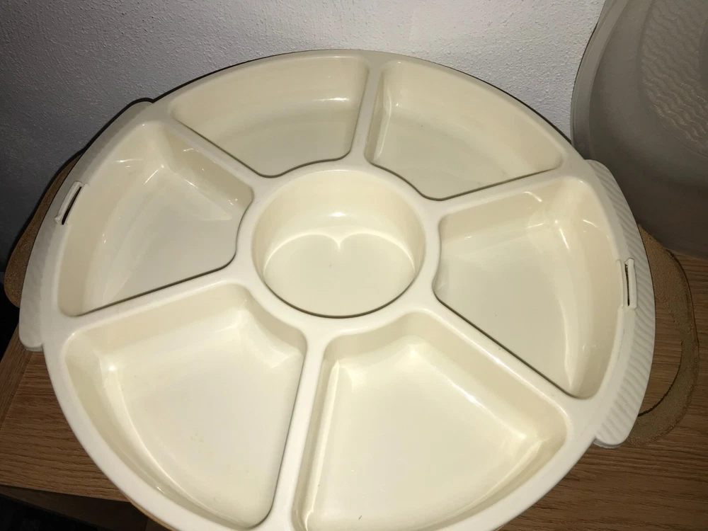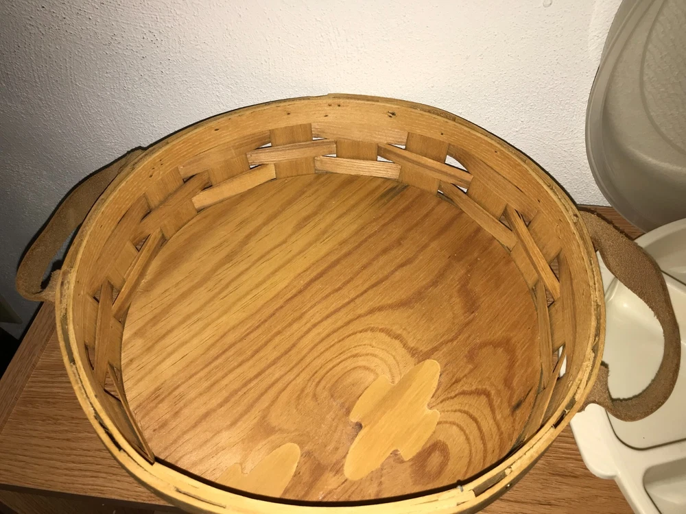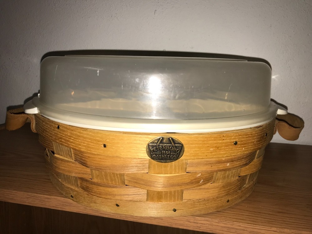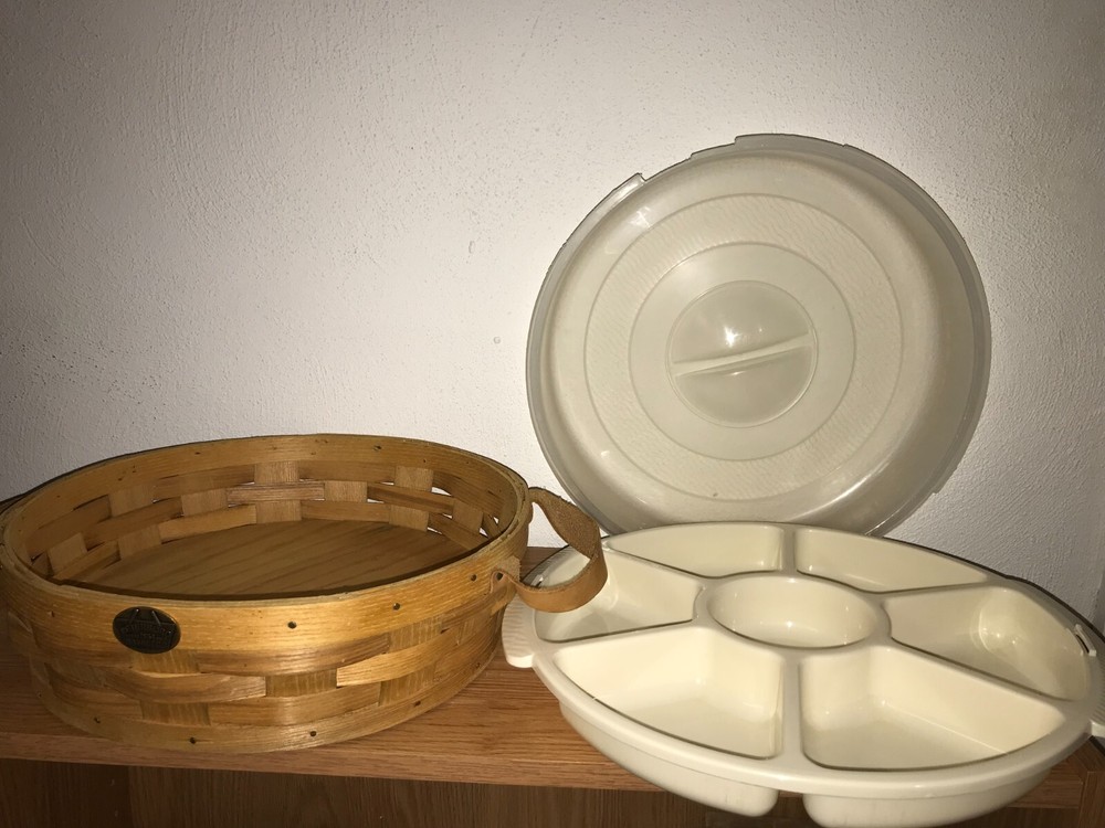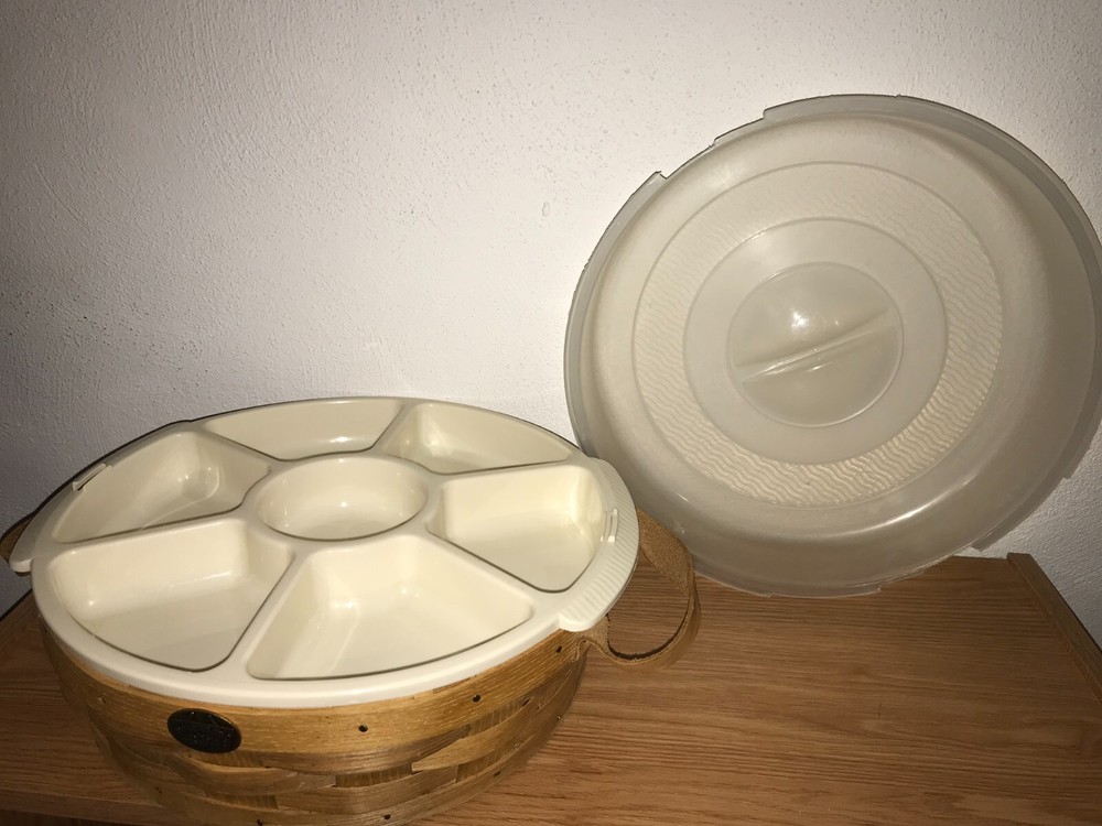 PETERBORO BASKET W/ ORIGINAL TUCKER INSERT & LID: SNACK TRAY, VEGGIES, DIP This sale includes the three pieces shown in the photos. The basket is from Peterboro and measures about 13" across and 3" deep. The plastic insert with lid is original to the basket. It was made by Tucker Housewares (item# 0137-1). The insert is also about 13" across and 3.5" deep. 6.5" when together. Please feel free to ask questions if you have any and I'll do my best. Please note that I never charge a handling fee and unfortunately, I have no control over the cost of the post office or Fed-Ex. Be sure to compare the costs of the shipping options I have provided to find your best deal based on your zip code. Thanks for looking!