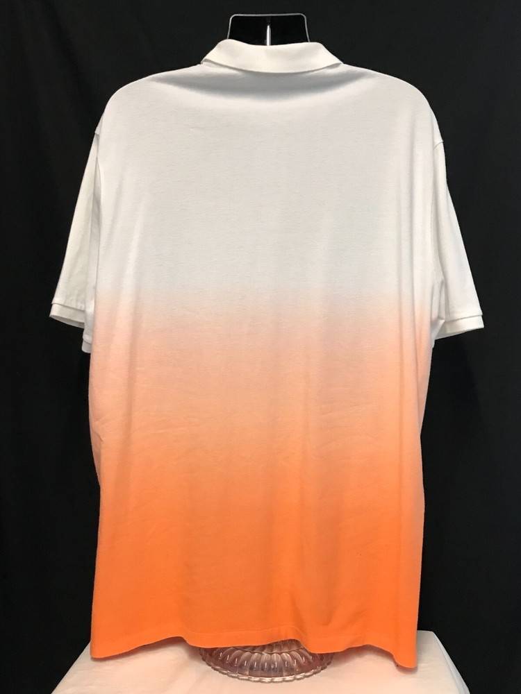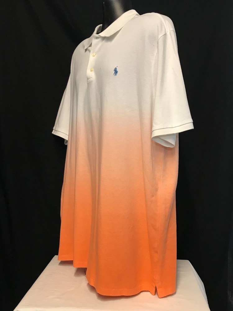 This POLO Ralph Lauren shirt is a men's collared polo in a size 2XL, featuring an ombre dip-dye design in Key West orange. The shirt is made of 100% cotton with a spread collar and button closure, accented with embroidered logos on the chest. It is designed for all seasons and is breathable, making it suitable for travel, activewear, and casual occasions. The classic fit shirt also includes features like easy care and stretch for comfort, perfect for activities like rugby, walking, and golf. VERY GOOD OR BETTER CONDITION SHOULDERS 22.5' CHEST- PIT 27' LENGTH 33.5' # 114