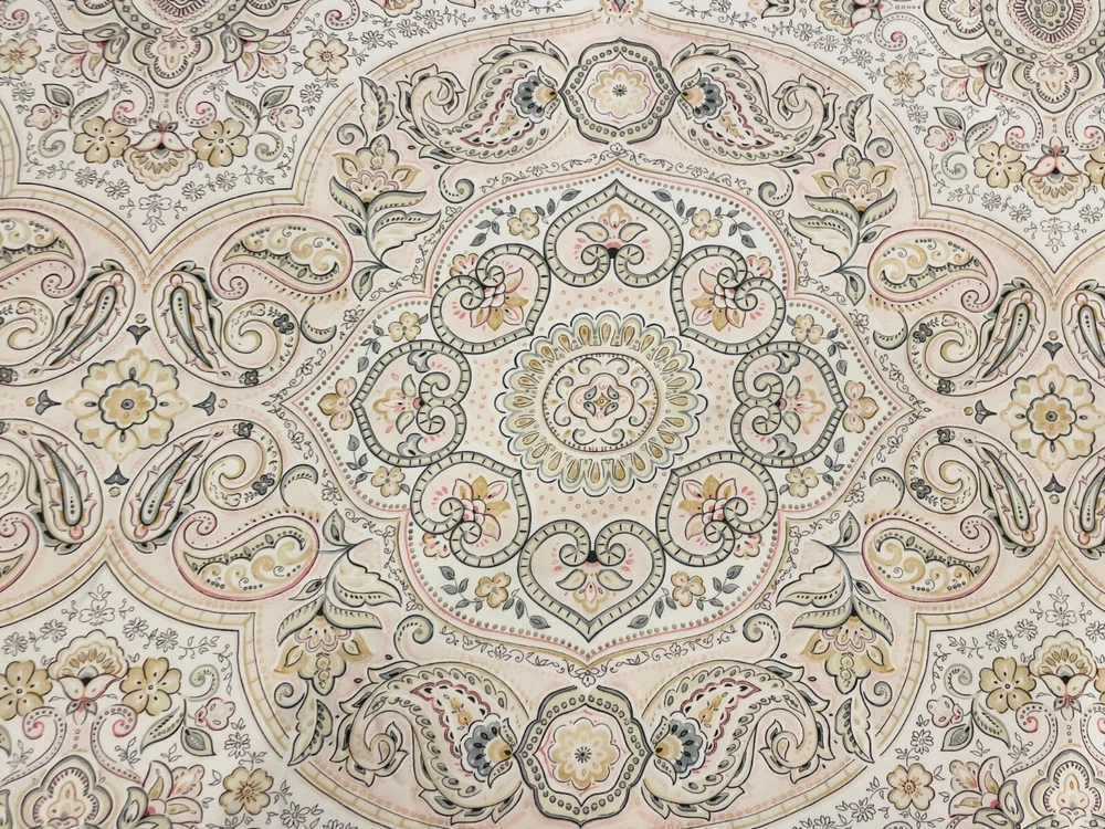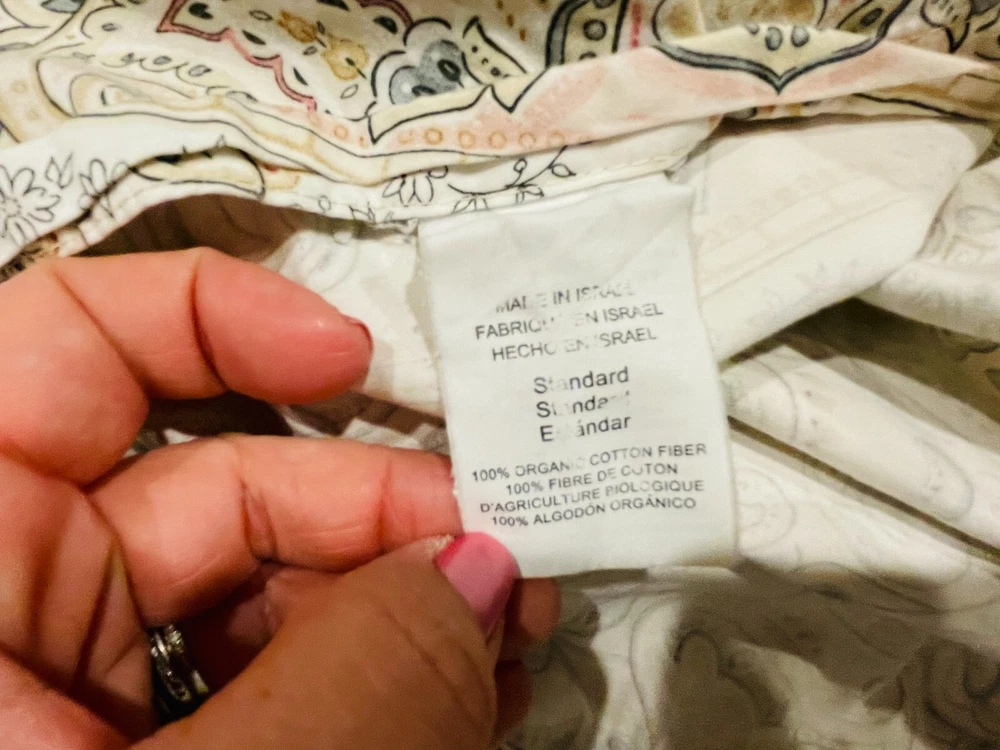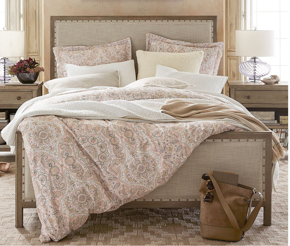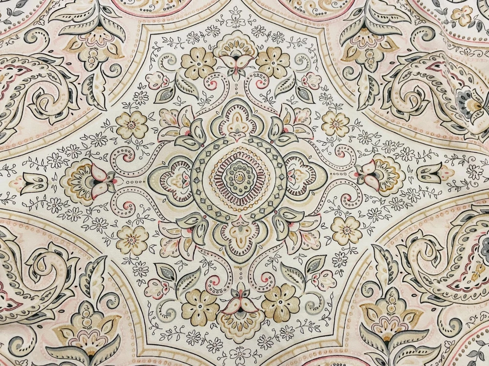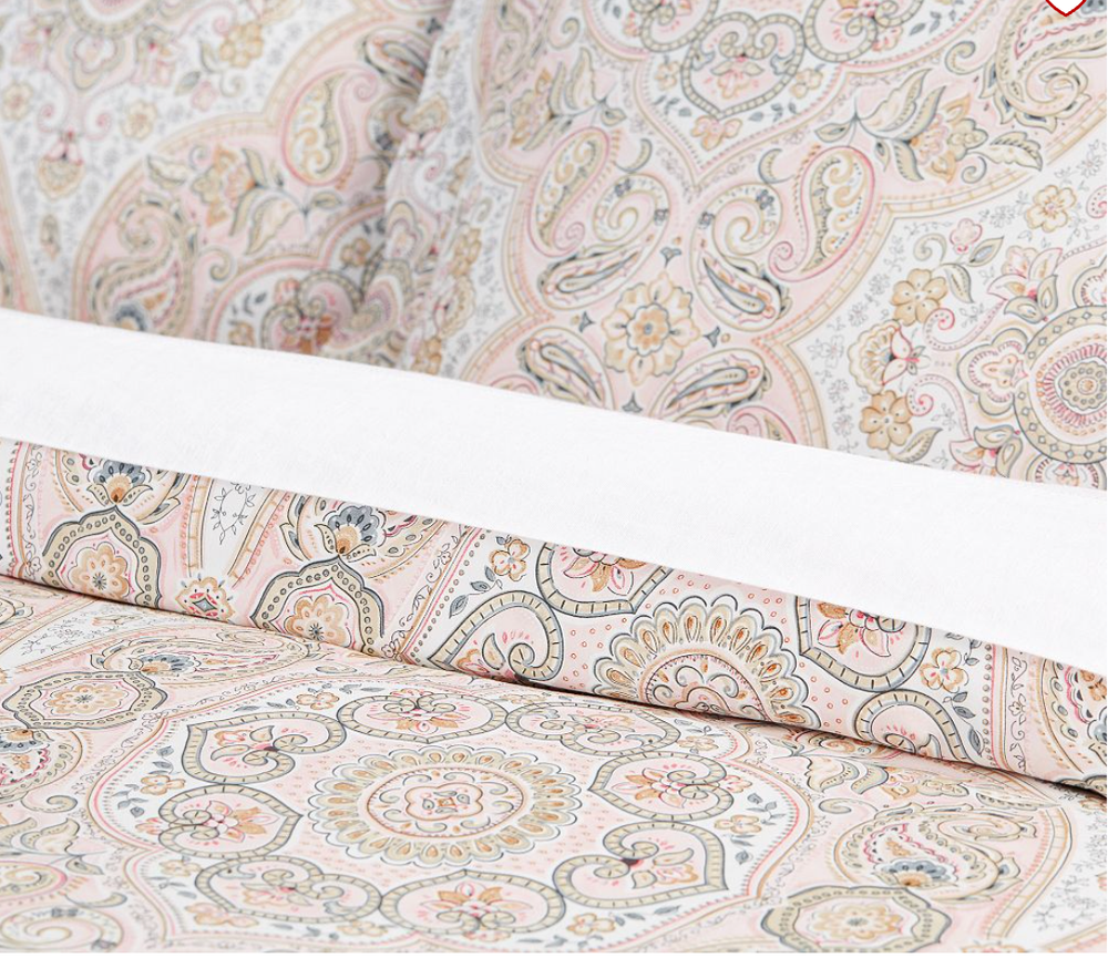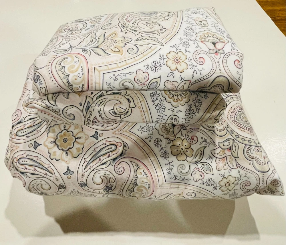 POTTERY BARN Anya Blush Pink Medallion Duvet Cover with King Shams Size: FULL / QUEEN Stunning medallion design Made from 100% organic cotton sateen Reversible Design: Duvet and shams reverse to the same Duvet features a hidden button closure with inner ties that keep insert in place Shams features an envelope closure 350-thread count. Duvet Full/Queen: 88" long x 92" wide Sham King: 20" high x 36" wide Flange: 2"