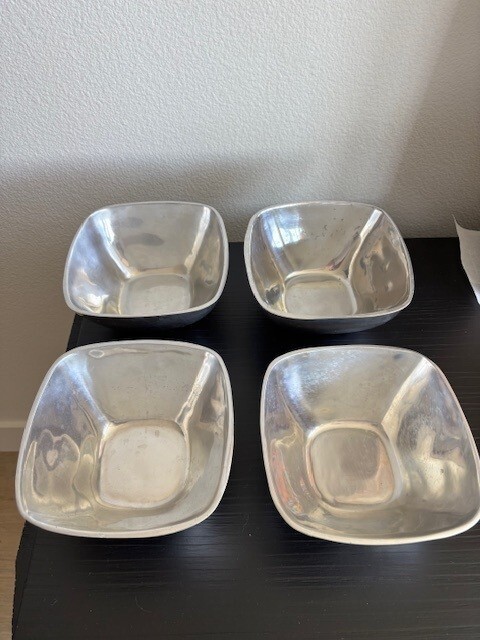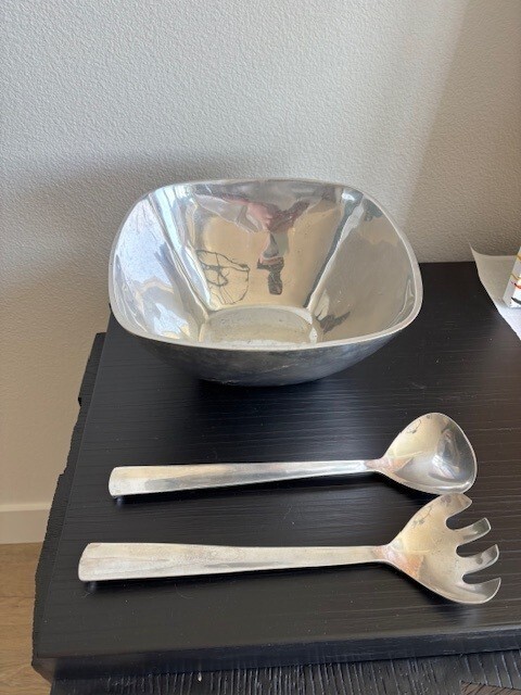 Crafted for both beauty and functionality, the Pottery Barn Barona collection features a set of seven aluminum bowls, complete with matching tongs. Each piece in this modern suite boasts a sleek square shape and a radiant metallic finish, presenting a contemporary aesthetic that effortlessly elevates any dining setting.The bowls and tongs come in a versatile silver color, solid pattern, and are original to the Pottery Barn brand. Ideal for both everyday use and special occasions, this set promises to be a timeless addition to your serveware ensemble, ensuring your culinary creations are presented with style and grace.