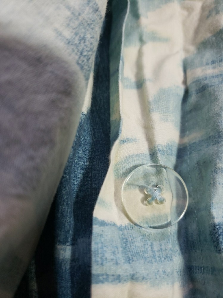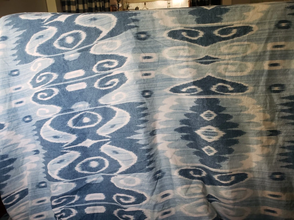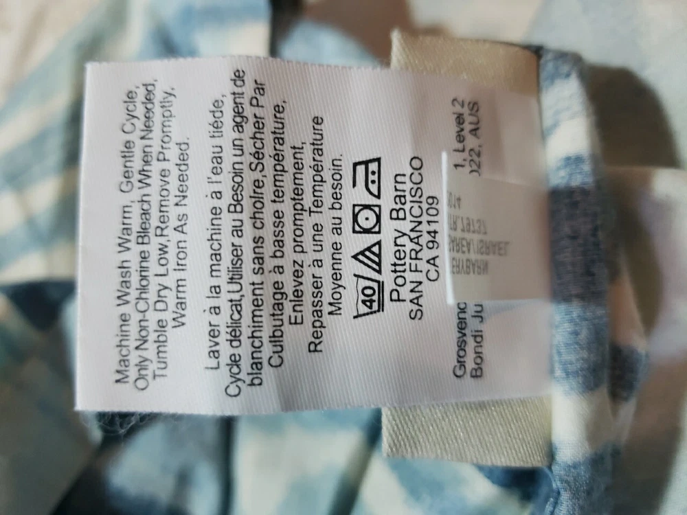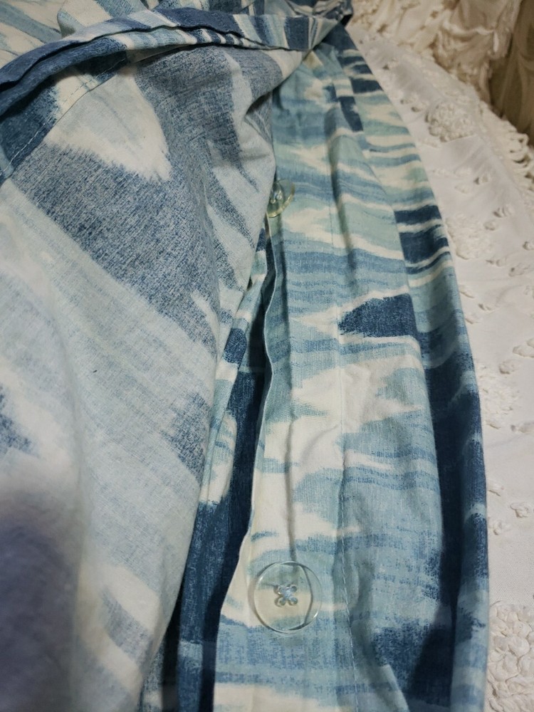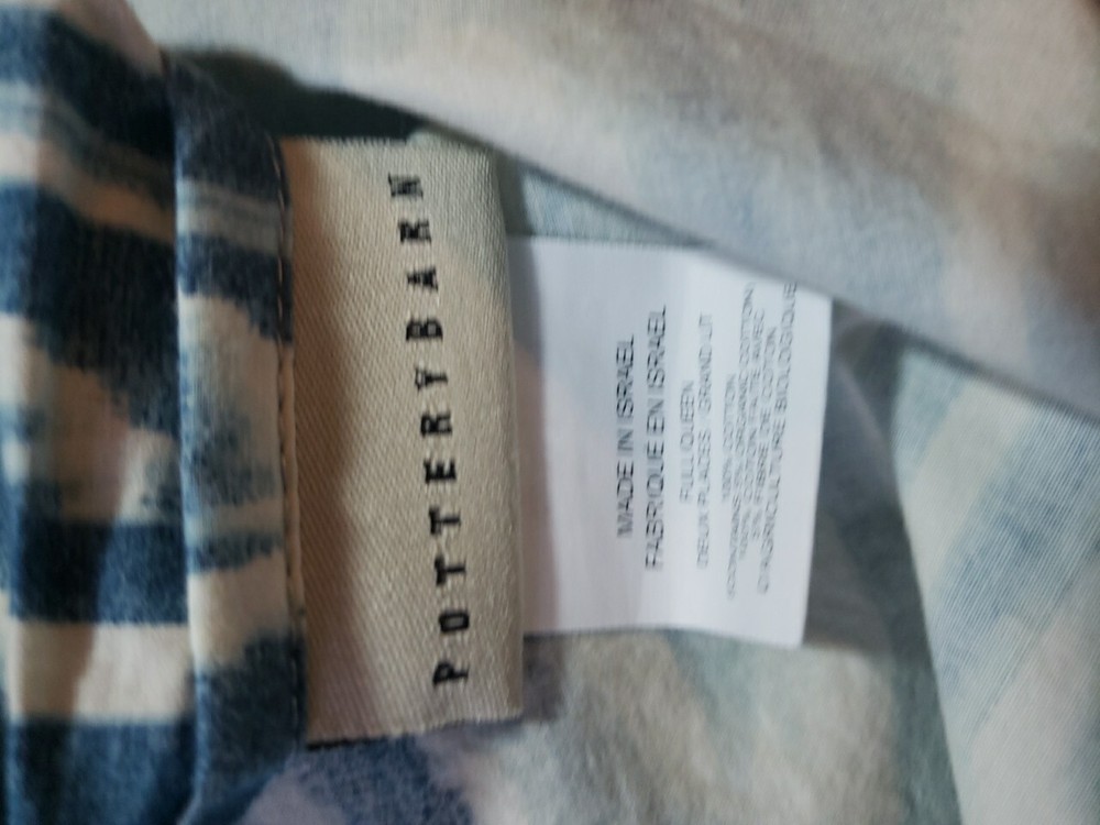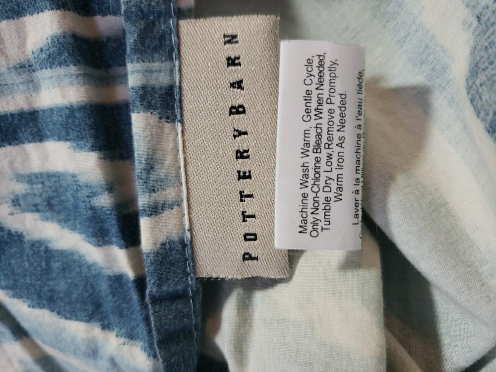 Add a touch of the tropics to your bedroom with this Pottery Barn duvet cover. The blue and white abstract pattern on a full/queen size cotton fabric is perfect for a modern style bedroom. The cover features a button closure and is machine washable and tumble dryable for easy care. The item length is 87 inches and the item width is 87 inches. This one piece duvet cover is ideal for a comfortable and stylish sleep.