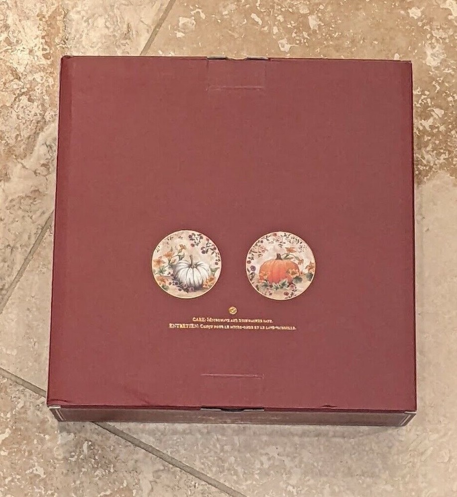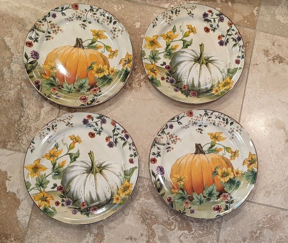~ POTTERY BARN ~ BOTANICAL HARVEST PUMPKIN STONEWARE SALAD PLATES, SET OF 4 Illustrations of wildflowers, scrolling vines and an heirloom pumpkin decorate these salad plates, filling each with the bountiful colors of autumn. Golden rims add a festive flourish, making them a stunning choice for harvest celebrations or the Thanksgiving feast. Made of stoneware with a glazed decal finish and a gold rim. Microwave and dishwasher safe. Set of 4; each plate features a different design. Imported. DIMENSIONS Overall: 8.75" dia CARE AND MAINTENANCE Microwave and dishwasher safe. While dishes are microwave safe, they may become hot. Handle carefully. Che ck out my other items ! Be sure to add me to your favorites list ! Note: Customer satisfaction is very important. The goal is to provide five star, all positive service! If this is not achieved, please send a message and allow us a chance to make it right. Customers come first! Also send any questions or concerns you may have. Thank you for looking at the listing. COMMUNICATION: ~ All communications must be through EBAY messages. ~ If you have any questions or concerns, please email us prior to bidding and we will be happy to respond. RETURN POLICY: We will only accept returns under limited conditions: ~ You write us within 24 hours of your receipt of the item to advise of your desire to return it. The date of “receipt” will be determined by the date the Postmaster confirms delivery. ~ You identify (and we are able to confirm) an error in the description of the item. ~ You return the item at your expense within 3 days of receipt of the item. ~ The item is returned in the same condition and the same packaging in which it was sent. ~ The purchase price will be refunded, but not the cost of shipping and handling. ~ There will be a 20% restocking fee on any item returned. OTHER POLICIES: ~ Payment is expected within 48 hours of auction end. ~ If payment is not received within 4 days a buyers an unpaid item mark may be put against the buyer. SHIPPING: ~ Shipping is usually Priority Mail with USPS, May also be UPS Ground. ~ If paying via PayPal, we will only ship to the confirmed address. No exceptions! ~ Item will be shipped within 1 business day after payment is received. ~ Insurance is always optional but recommended. If you would like insurance you must let me know before you pay. ~ I can't be responsible for items once they are shipped. www.KimbersBrandNames.com Che ck out my other items ! Be sure to add me to your favorites list ! Note: Customer satisfaction is very important. The goal is to provide five star, all positive service! If this is not achieved, please send a message and allow us a chance to make it right. Customers come first! Also send any questions or concerns you may have. Thank you for looking at the listing. COMMUNICATION: ~ All communications must be through EBAY messages. ~ If you have any questions or concerns, please email us prior to bidding and we will be happy to respond. RETURN POLICY: We will only accept returns under limited conditions: ~ You write us within 24 hours of your receipt of the item to advise of your desire to return it. The date of “receipt” will be determined by the date the Postmaster confirms delivery. ~ You identify (and we are able to confirm) an error in the description of the item. ~ You return the item at your expense within 3 days of receipt of the item. ~ The item is returned in the same condition and the same packaging in which it was sent. ~ The purchase price will be refunded, but not the cost of shipping and handling. ~ There will be a 20% restocking fee on any item returned. OTHER POLICIES: ~ Payment is expected within 48 hours of auction end. ~ If payment is not received within 4 days a buyers an unpaid item mark may be put against the buyer. SHIPPING: ~ Shipping is usually Priority Mail with USPS, May also be UPS Ground. ~ If paying via PayPal, we will only ship to the confirmed address. No exceptions! ~ Item will be shipped within 1 business day after payment is received. ~ Insurance is always optional but recommended. If you would like insurance you must let me know before you pay. ~ I can't be responsible for items once they are shipped. www.KimbersBrandNames.com