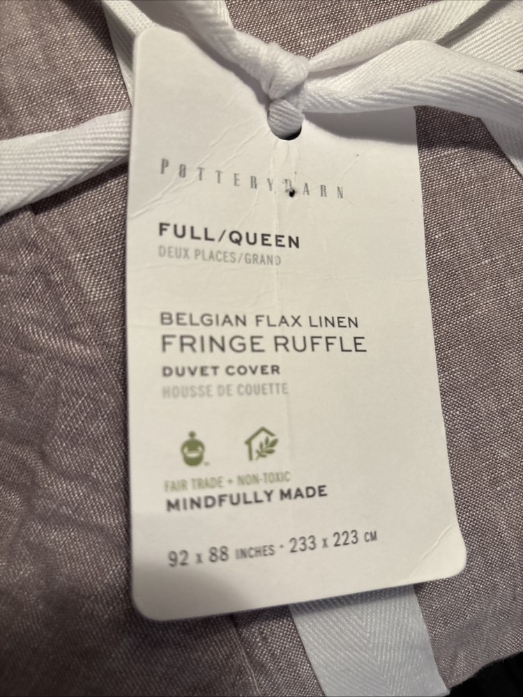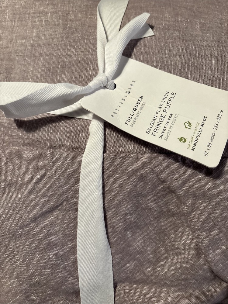 Elevate your bedroom with the chic elegance of the Pottery Barn Belgian Flax Linen Fringe Ruffle Duvet Cover. Designed for a full/queen size bed, this luxurious lavender-hued cover is crafted from high-quality linen, known for its breathability and comfort. The ruffled edge adds a touch of sophistication, creating an inviting and refreshed atmosphere. Carefully constructed for everyday elegance, the duvet cover is machine washable, ensuring easy maintenance. Whether you're updating your own space or gifting it to a loved one, this solid-colored, sophisticated piece is a perfect match for any adult bedroom decor.