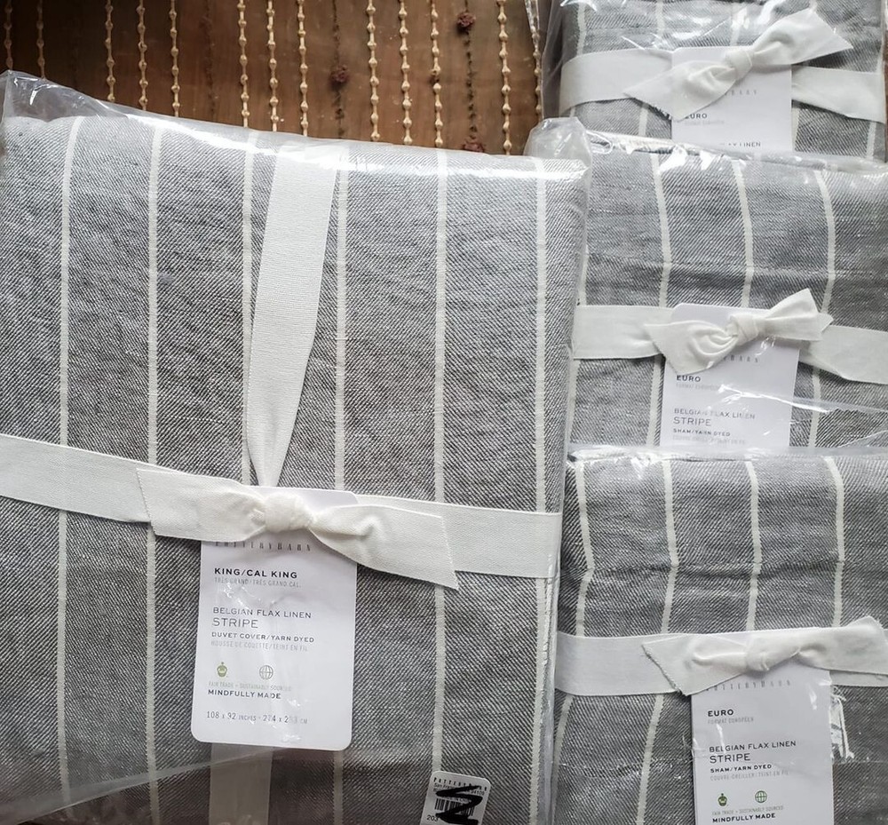 POTTERY BARN BELGIAN FLAX LINEN STRIPE KING DUVET ~ 108" X 92" AND 3 ~ 26" X 26" LINEN STRIPE EURO SHAMS BRAND NEW FLAGSTONE You are buying a BRAND NEW Pottery Barn Belgian Flax Linen Stripe King Duvet. It measures 108" W x 92" L. Included are three 26" x 26" Belgian Flax Linen Stripe Euro shams. The color is FLAGSTONE. Pottery Barn describes this as , " Woven from the world’s finest Belgian flax, this linen bedding is prewashed for incredible softness—and only gets better with time. Lightly textured and cool to the touch, this natural-fiber fabric is prized for its durability, breathability and lived-in look . " DETAILS Linen woven from 100% Belgian flax. Prewashed for a supersoft hand feel. Ideal for warm or cool temperatures. Duvet cover features a hidden button closure with inner ties that keep the insert in place; sham features an envelope closure. Machine wash in cold water separately on gentle cycle. Line or tumble dry on a low temperature. Imported. PAYMENT METHOD Buy it now payment is required at checkout. SHIPMENT METHOD US only shipping is free. Items will be sent within one day of sale date. Returns are not accepted. I DO NOT MAKE OR ACCEPT "BEST OFFERS" SUCH INQUIRIES WILL GO UNANSWERED