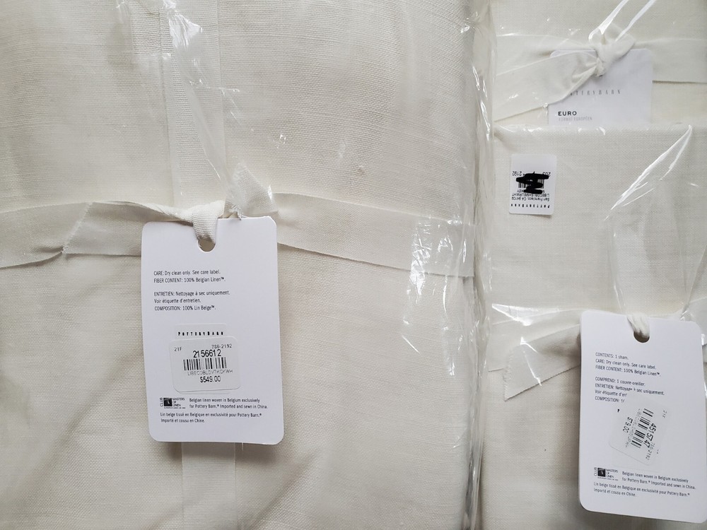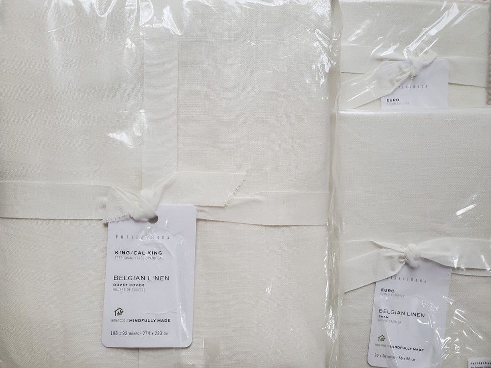 POTTERY BARN BELGIAN LINEN LIBECO KING DUVET ~ 108" X 92" AND 2 ~ 26" X 26" BELGIAN LINEN LIBECO EURO SHAMS BRAND NEW WHITE You are buying a BRAND NEW Pottery Barn Belgian Linen Libeco King Duvet. It measures 108" W x 92" L. Included are two 26" x 26" Belgian Linen Libeco Euro shams. The color is WHITE. ***It is not a bright white, but more Ivory in color*** Pottery Barn describes this as , " For the finest in linen luxury, we went straight to the source: Libeco, one of the oldest and most renowned mills in Belgium. The result is an heirloom-quality duvet cover with the cool, smooth touch and elegant drape that have made linen a timeless and beloved choice for bedding . " DETAILS Made of 100% Libeco™ linen. Yarn-dyed for long lasting color. Reverses to same. Duvet features a button closure and interior ties to help keep insert (sold separately) in place; sham features a side closure. Machine wash cold, gentle cycle. Imported. PAYMENT METHOD Buy it now payment is required at checkout. SHIPMENT METHOD US only shipping is free. Items will be sent within one day of sale date. Returns are not accepted. I DO NOT MAKE OR ACCEPT "BEST OFFERS" SUCH INQUIRIES WILL GO UNANSWERED