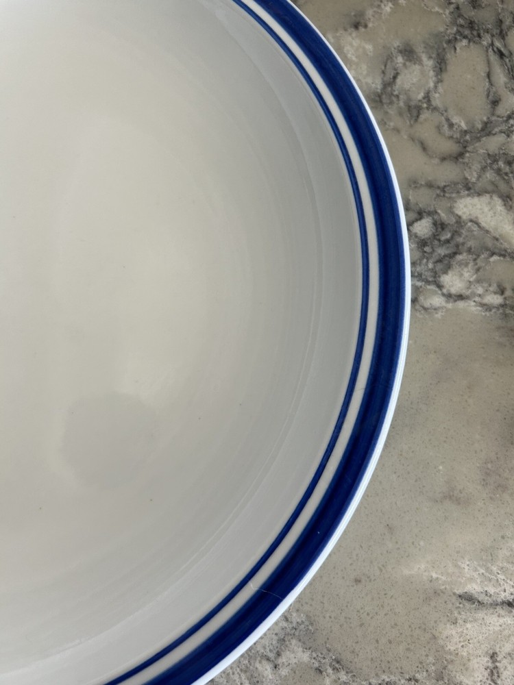 This Pottery Barn Club Blue Chop Plate is a stylish and versatile addition to your dinnerware collection. The plate features a 12-inch diameter with a white background and blue stripes along the edge, adding a touch of elegance to your table setting. Made of durable stoneware, this plate is suitable for everyday use and is ideal for serving both chop and dinner dishes. The backstamp is printed, indicating the authenticity and brand of Pottery Barn.