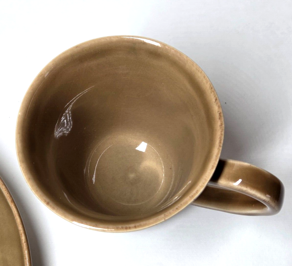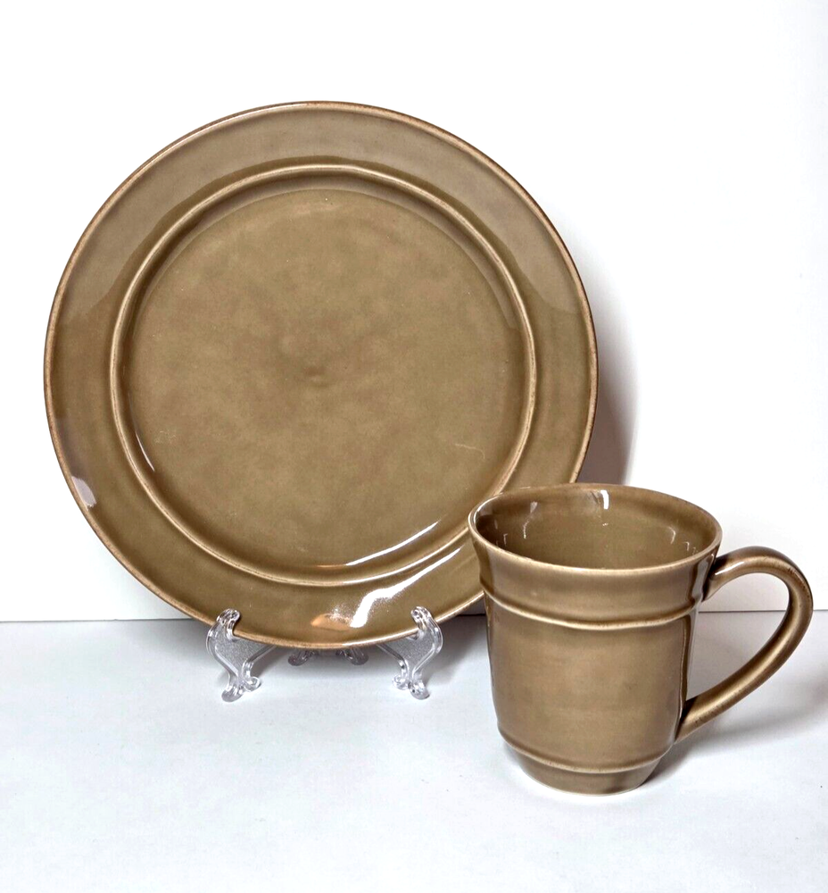 The Pottery Barn Cambria Mushroom (Taupe) 2 Piece Set includes a salad plate and mug, both handmade in Portugal. The vibrant mix of browns on stoneware features a glossy finish, making it perfect for all occasions. The set is microwave and dishwasher safe, and the Cambria pattern adds a touch of elegance to your table setting. Ideal for the 21st century, this two-piece set is a unique addition to your pottery collection. Plate measures 9.5" Diameter Mug measures 4" Diameter New with tags Carefully packed and shipped.
