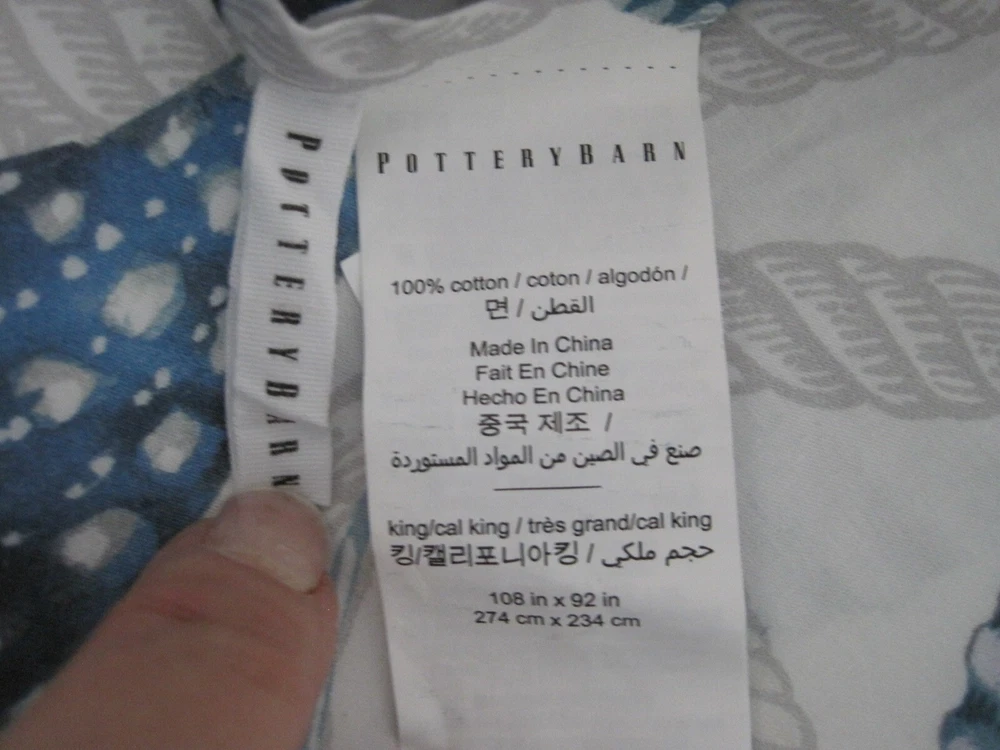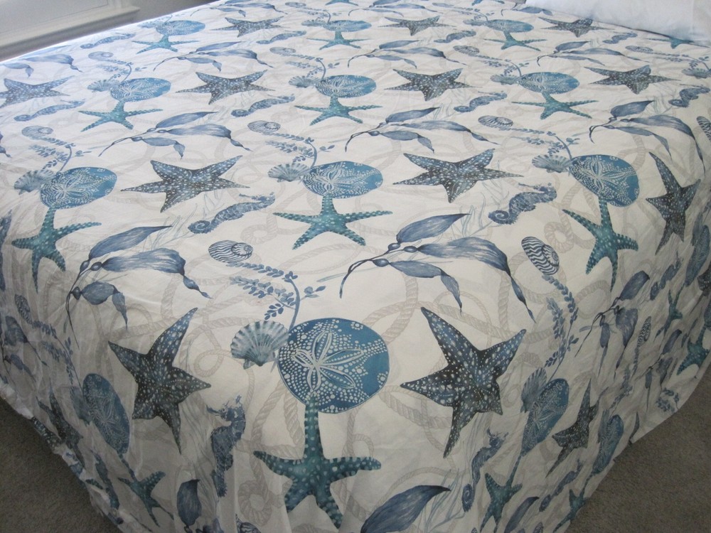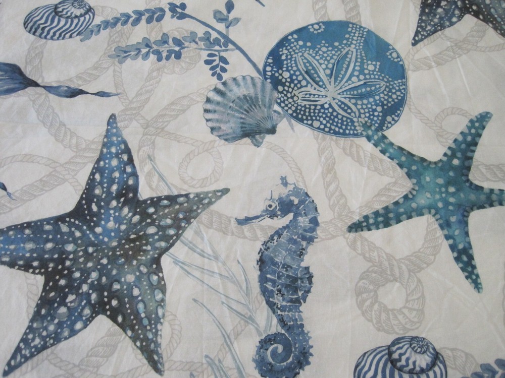 The Pottery Barn "Catalina Coastal" Organic Cotton Duvet Cover in King/Cal King size features a beautiful design with shells, fishes, and marine life, perfect for a coastal or nautical themed bedroom. Made from 100% cotton, this duvet cover set includes internal corner and middle ties for a secure closure. The shades of blue on a white and gray background add a soothing touch to the room. Machine wash care instructions make it easy to keep clean and fresh. This Pottery Barn duvet cover has a rectangular shape and 9 button closure. It is in Very Good Used Condition From a Smoke & Pet Free Home ~ Thanks for Looking & Happy Shopping