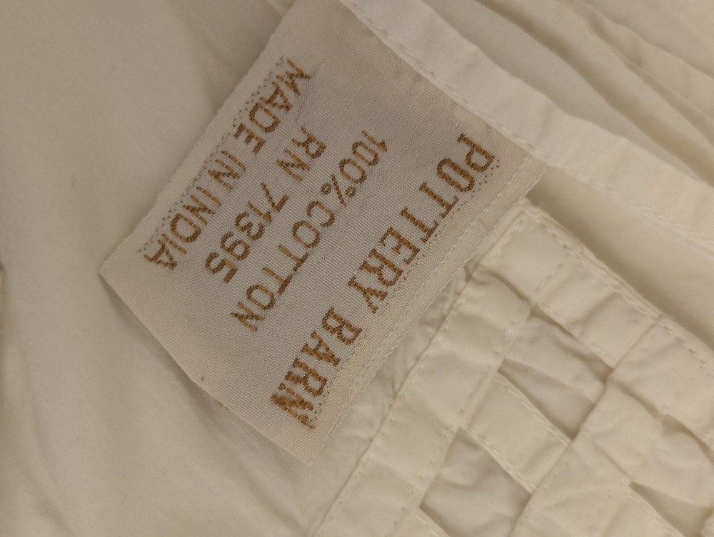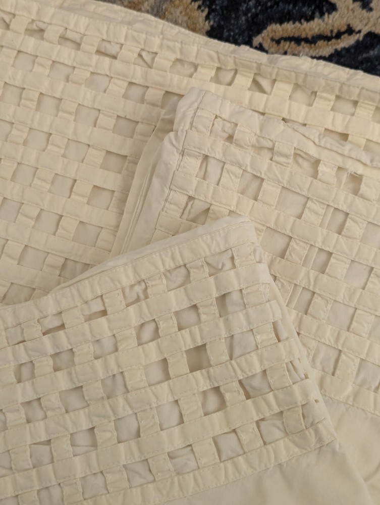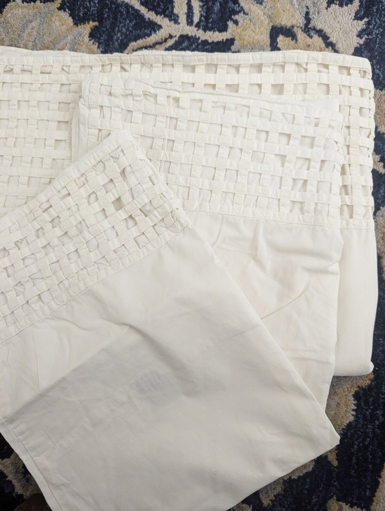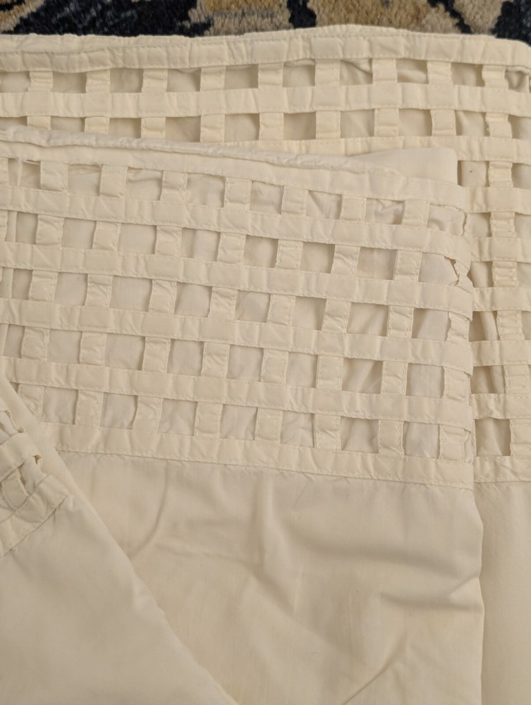Vintage Pottery Barn sheet set Unique set, I do not see any other sheets like this! Full flat sheet and two standard pillowcases All cotton Creamy white Made in India Vintage 8 inch woven lattice sewn border on sheet and cases In good condition