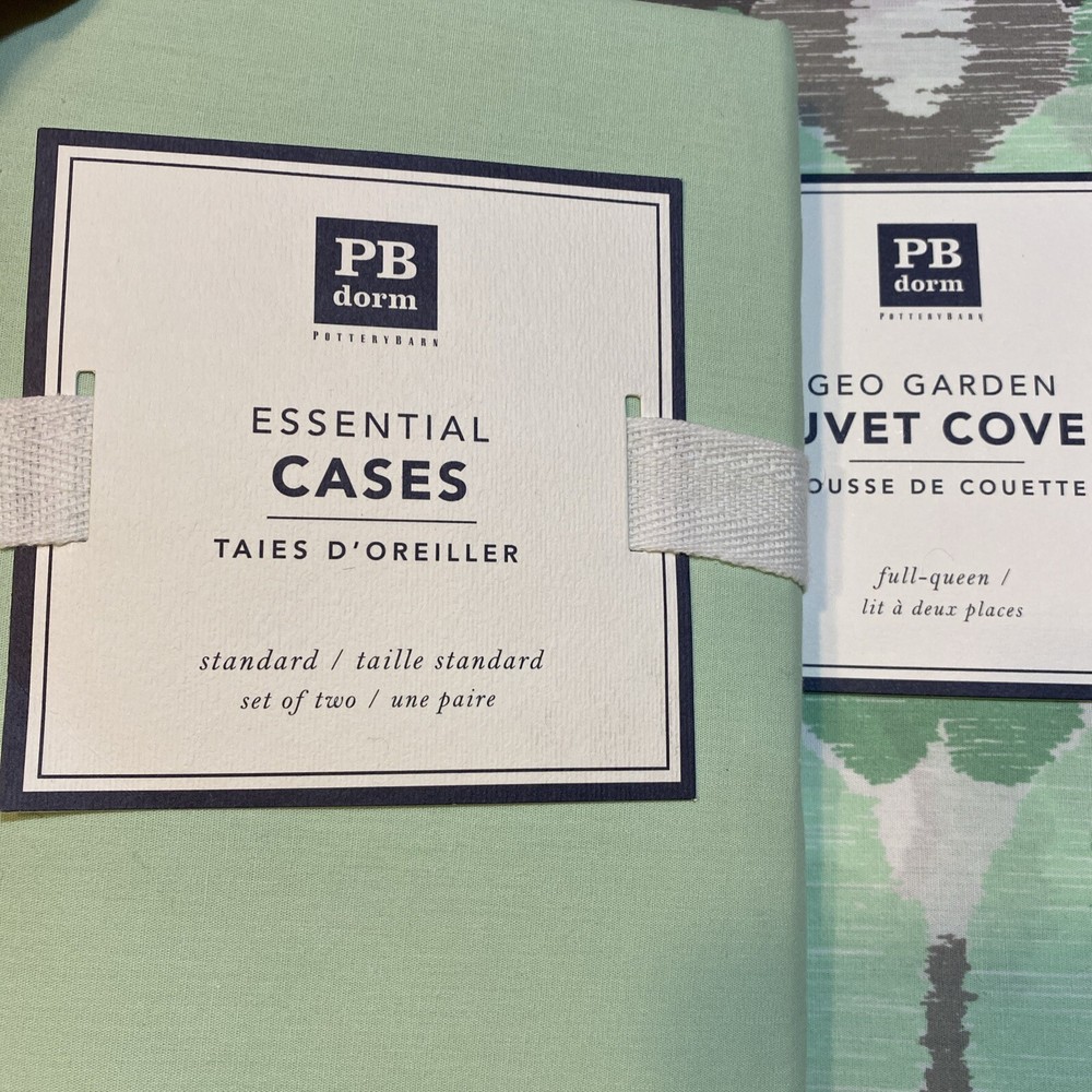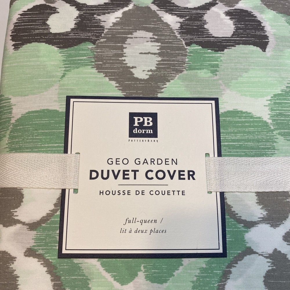New with Tags - Pottery Barn Dorm GEO GARDEN GREEN & GRAY DUVET COVER FULL/QUEEN + PILLOW CASES Size Full/Queen Includes 2 Standard Pillow cases...