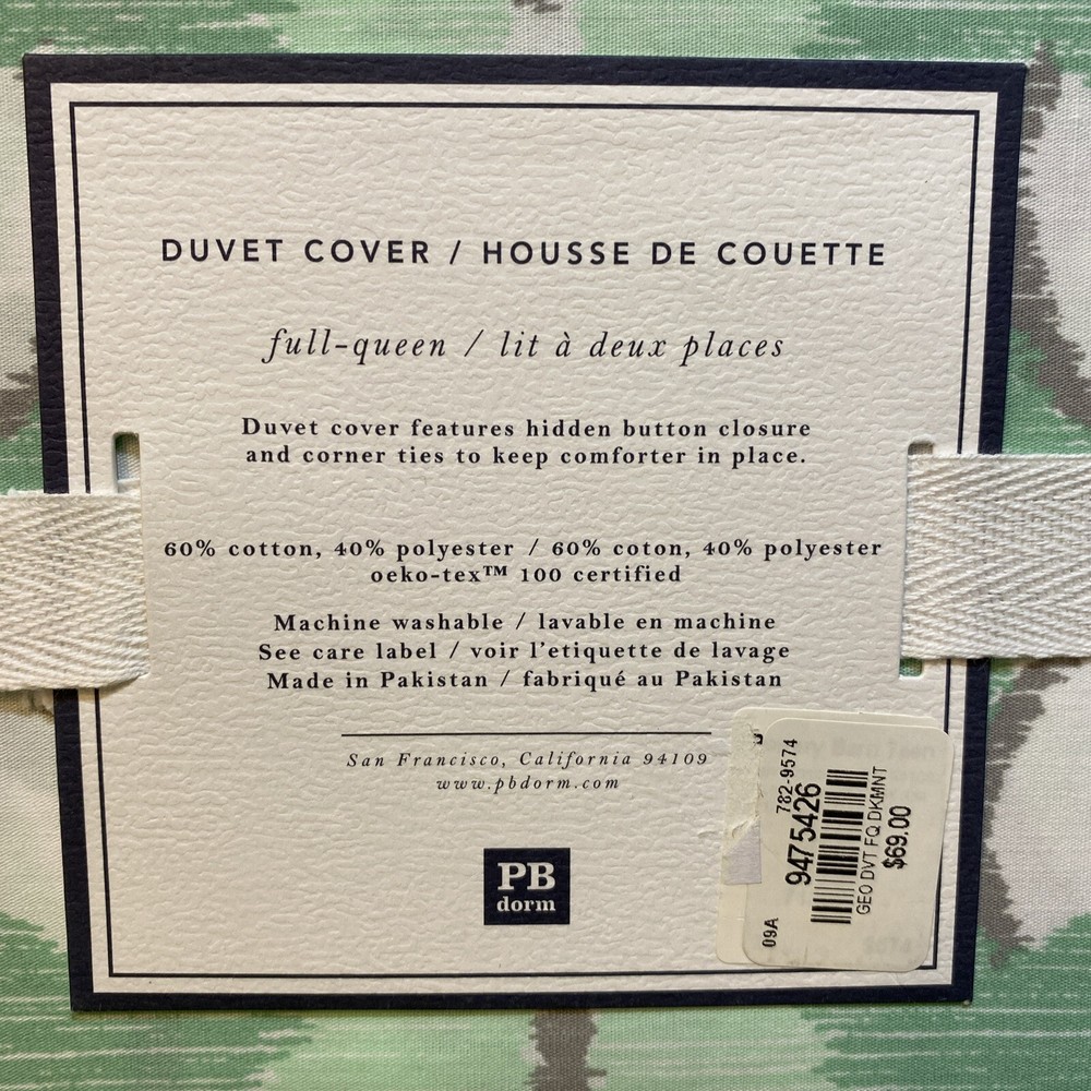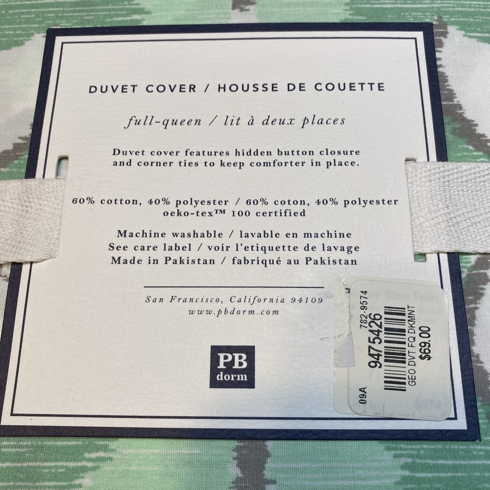 New with Tags - Pottery Barn Dorm GEO GARDEN GREEN & GRAY DUVET COVER FULL/QUEEN + PILLOW CASES Size Full/Queen Includes 2 Standard Pillow cases