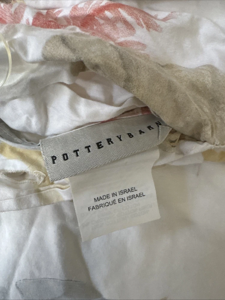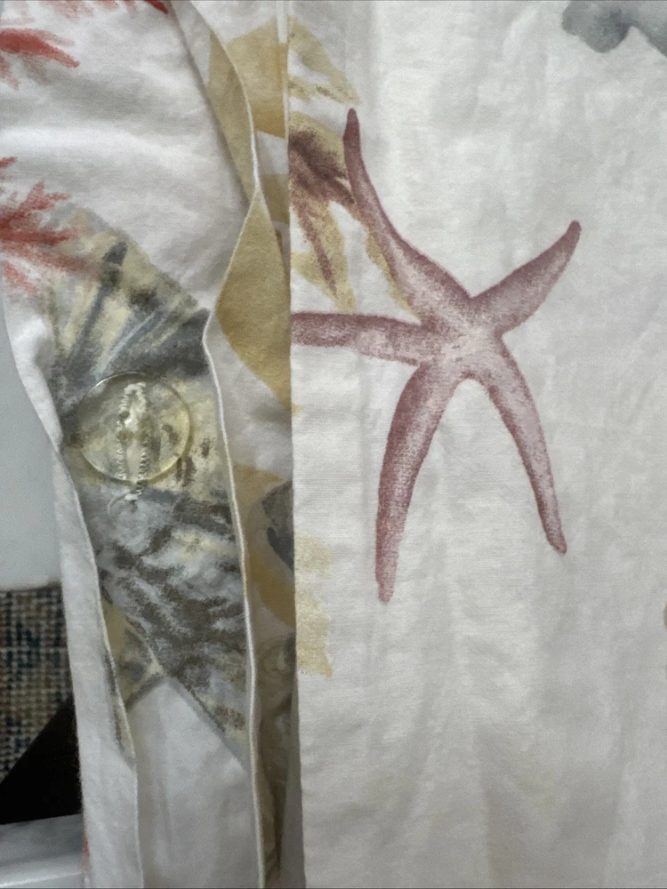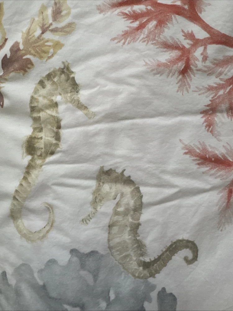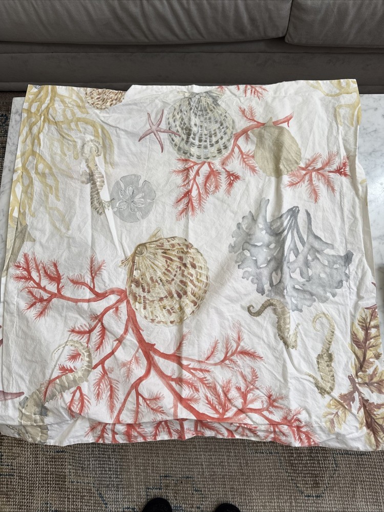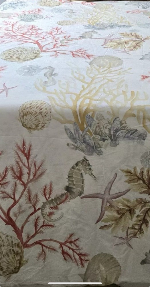 This Pottery Barn duvet cover set features a charming Atlantic Seashells design with a coral, sea, and ocean theme. Made from 100% organic cotton, the set includes a king-sized duvet cover and two Euro shams, all in shades of off white, orange, blue, green, tan, and brown. The set is reversible and has a button closure, making it perfect for teens and adults alike who love a beach, ocean, or nautical style in their bedroom decor. Easy to care for with machine wash and tumble dry instructions, this duvet cover set adds a touch of nature and nautical charm to any bedroom setting.