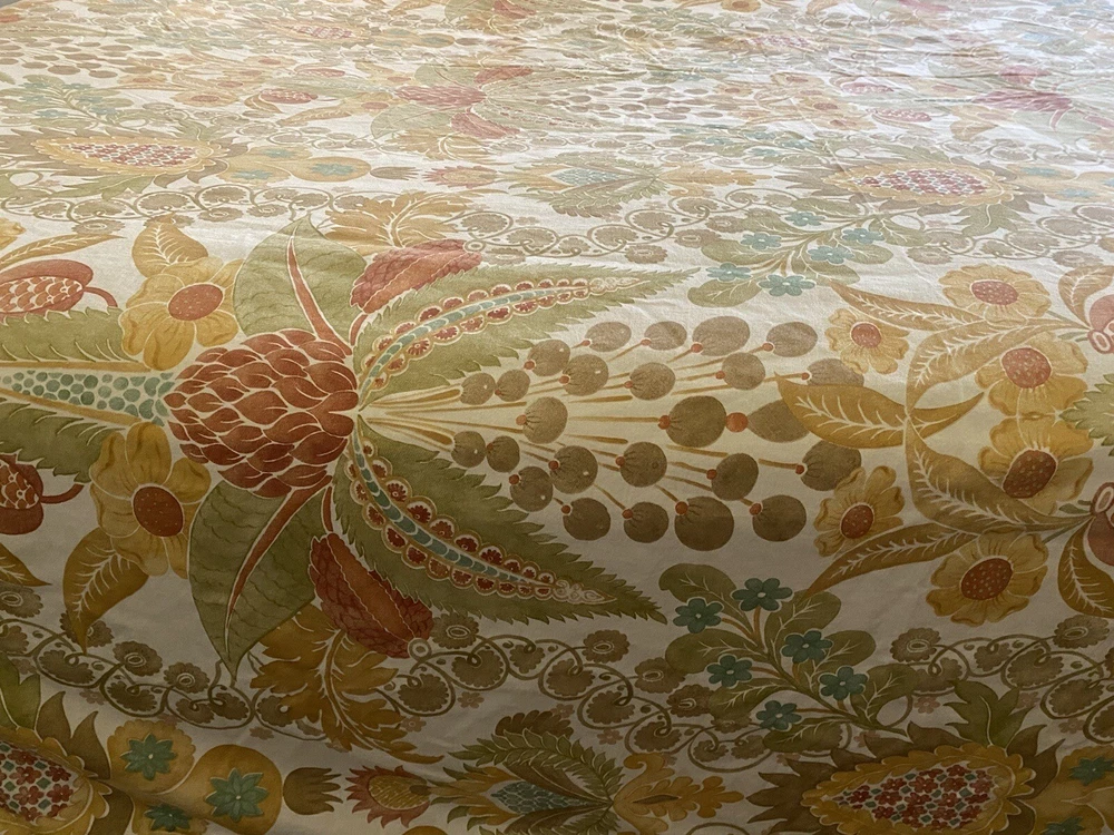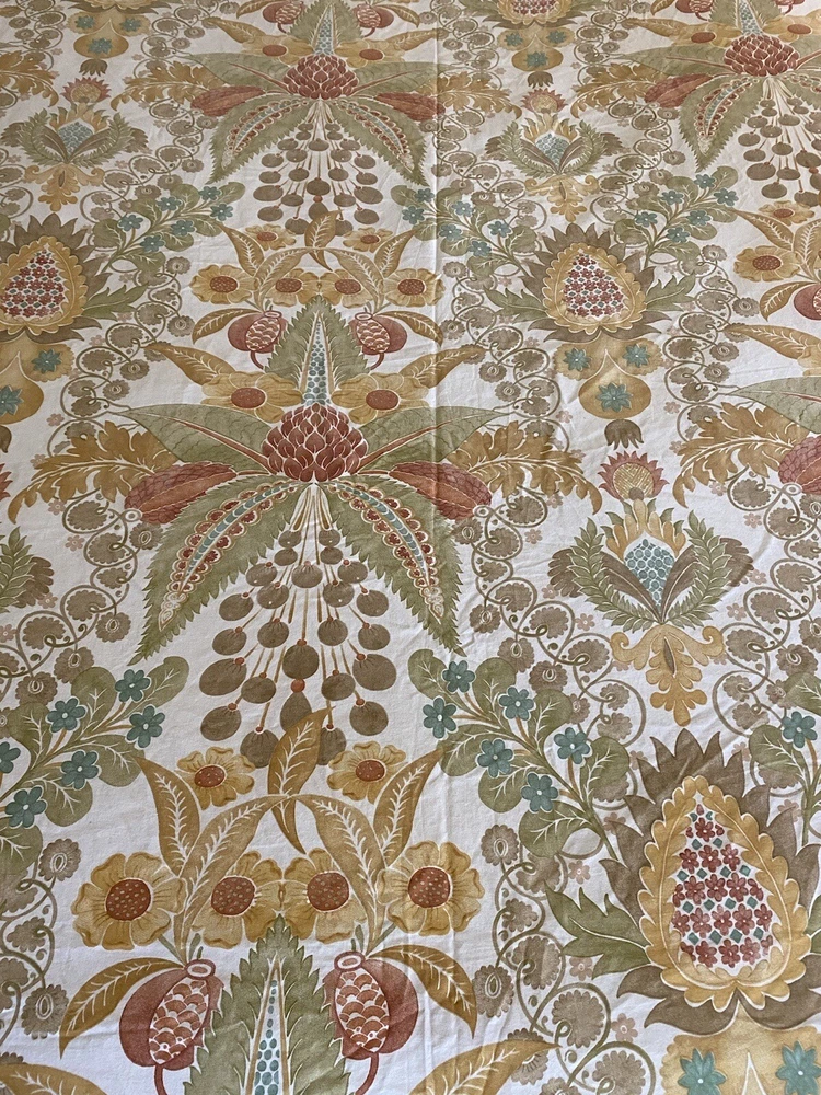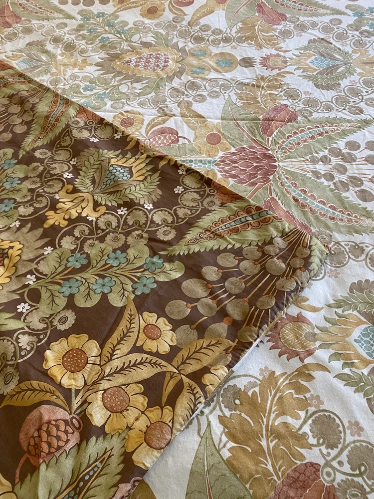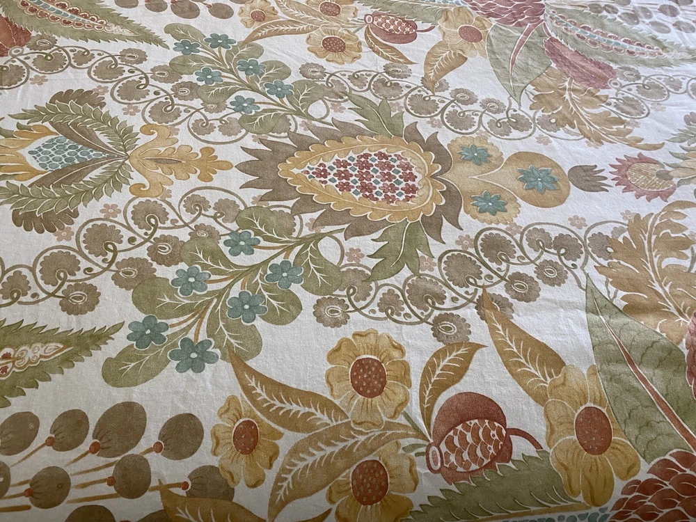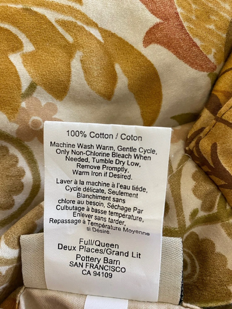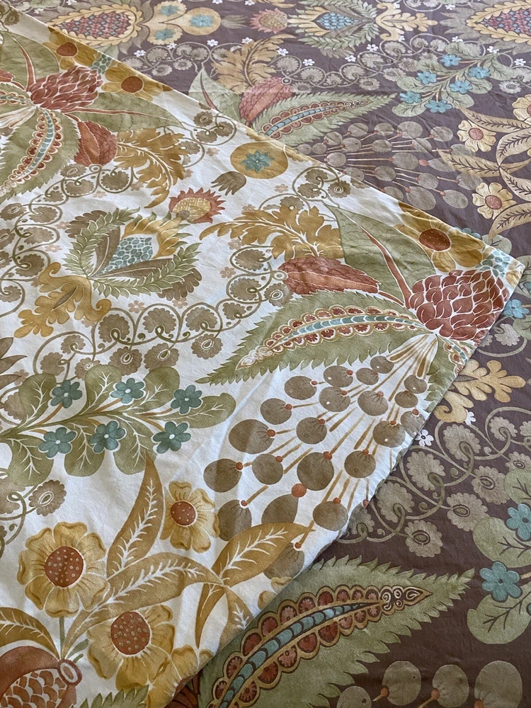 POTTERY BARN Duvet Cover FULL/ QUEEN Cassandra Palampore Reversible 100% Cotton Beautiful cotton sateen duvet Totally reversible with one side has light Brown background and the other has Cream Beige Colors range from Beige, Yellow, rust and olive Green Button closure and inner ties Condition is very good pre-owned Please check pictures